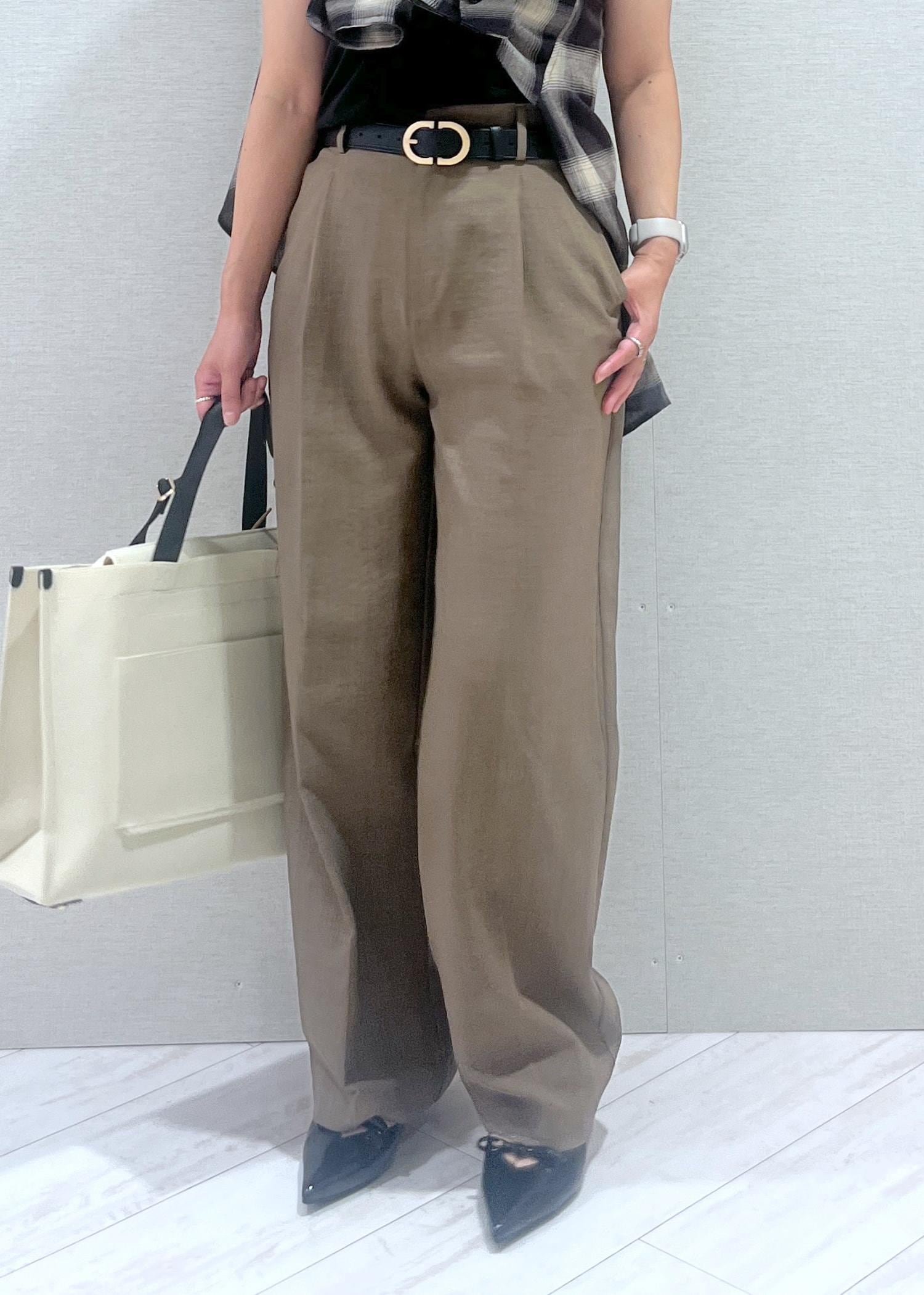 タック入りのワイドパンツで腰回りのラインもカバーして綺麗に着用できます。