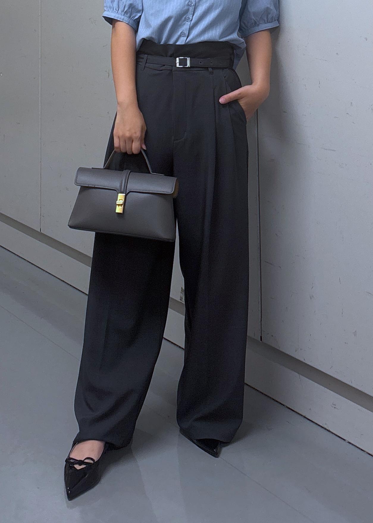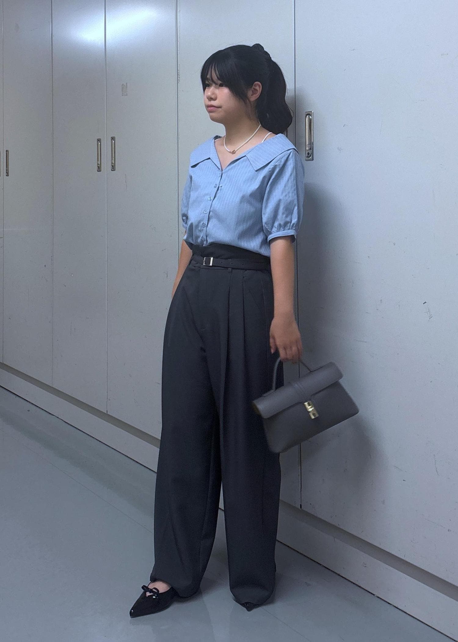 VIS【新色追加】【防シワ/接触冷感】ベルトディテールタックワイドスラックスパンツチャコール / S¥6,589レビュー153cmでSサイズを着用しました。