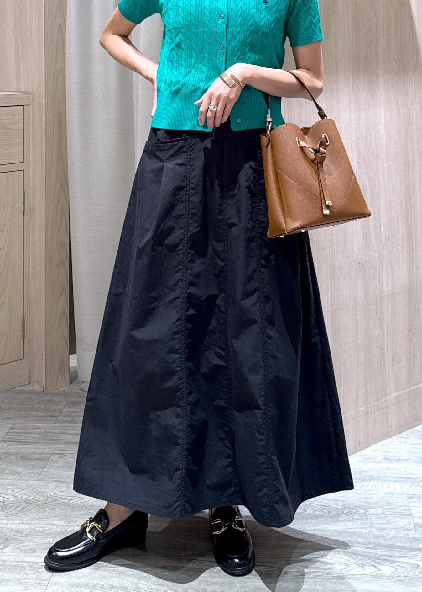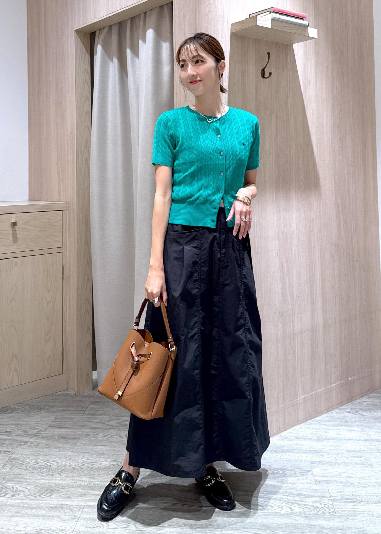 コンパクトなPOLO別注カーディガンにフレアスカートを合わせた、秋まで着られるお出かけコーデです!