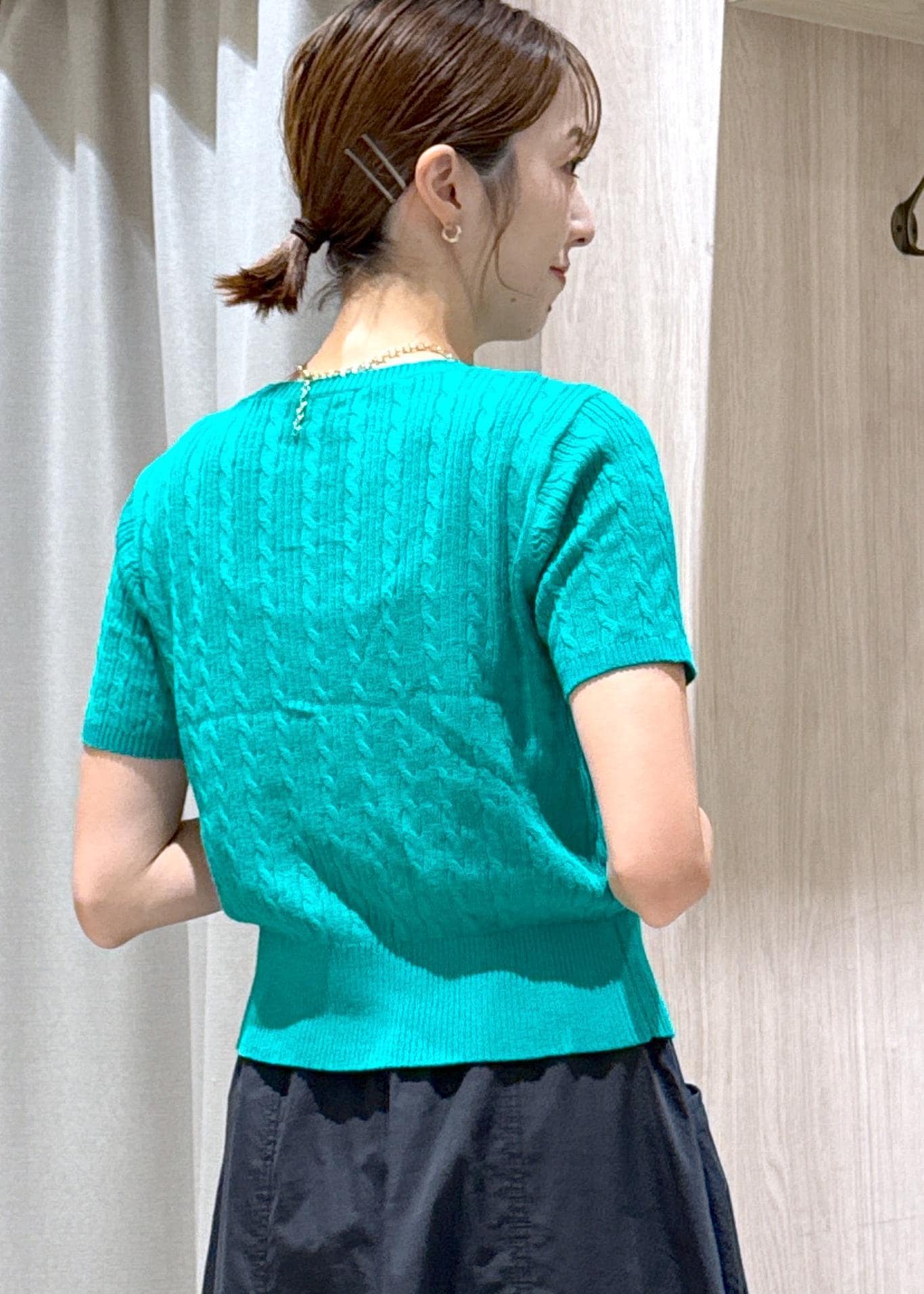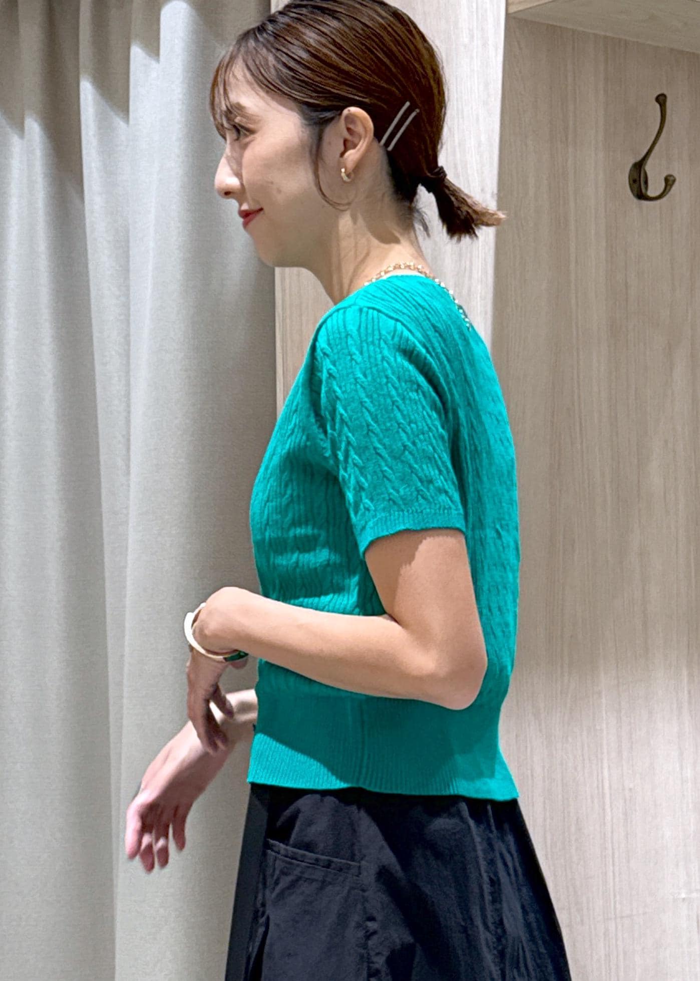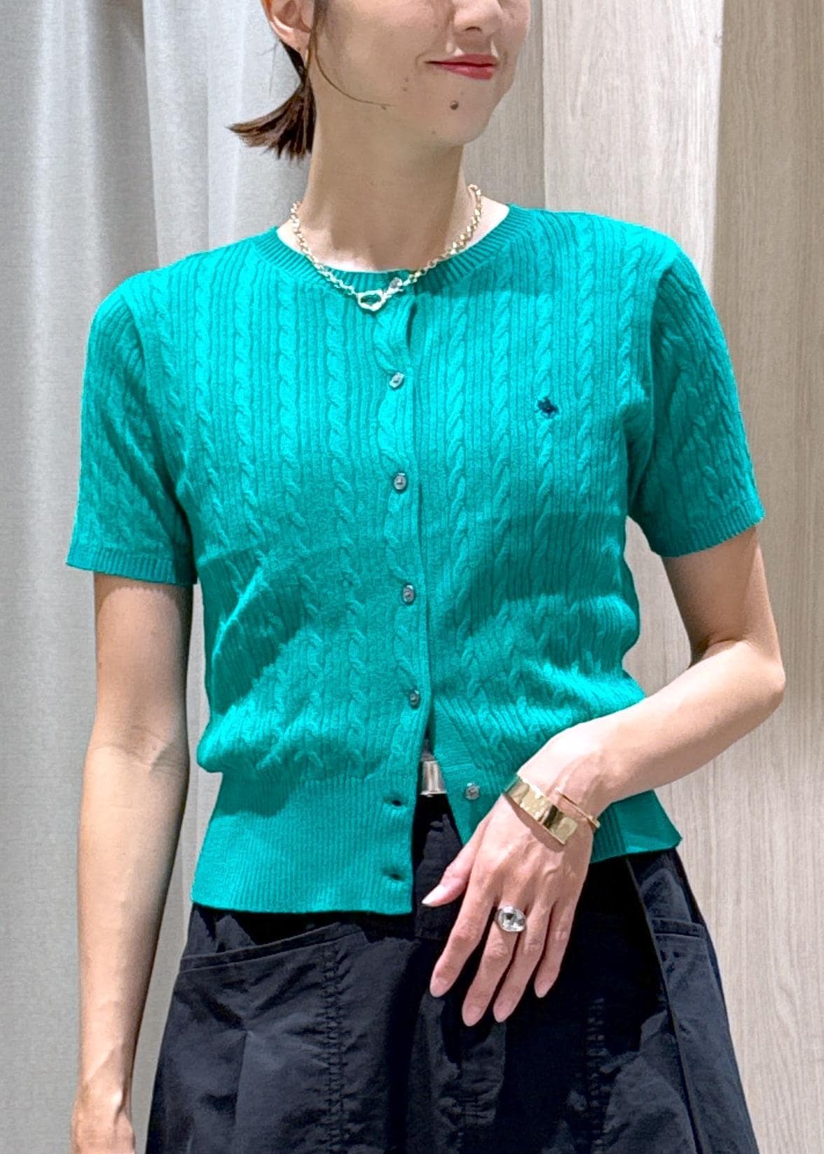 VIS【POLO BCS】VIS別注ハーフスリーブミニケーブルカーディガングリーン / F¥6,600レビュー身長166センチで腰下の長さですが、全体的にコンパクトなサイズ感のカーディガンです。