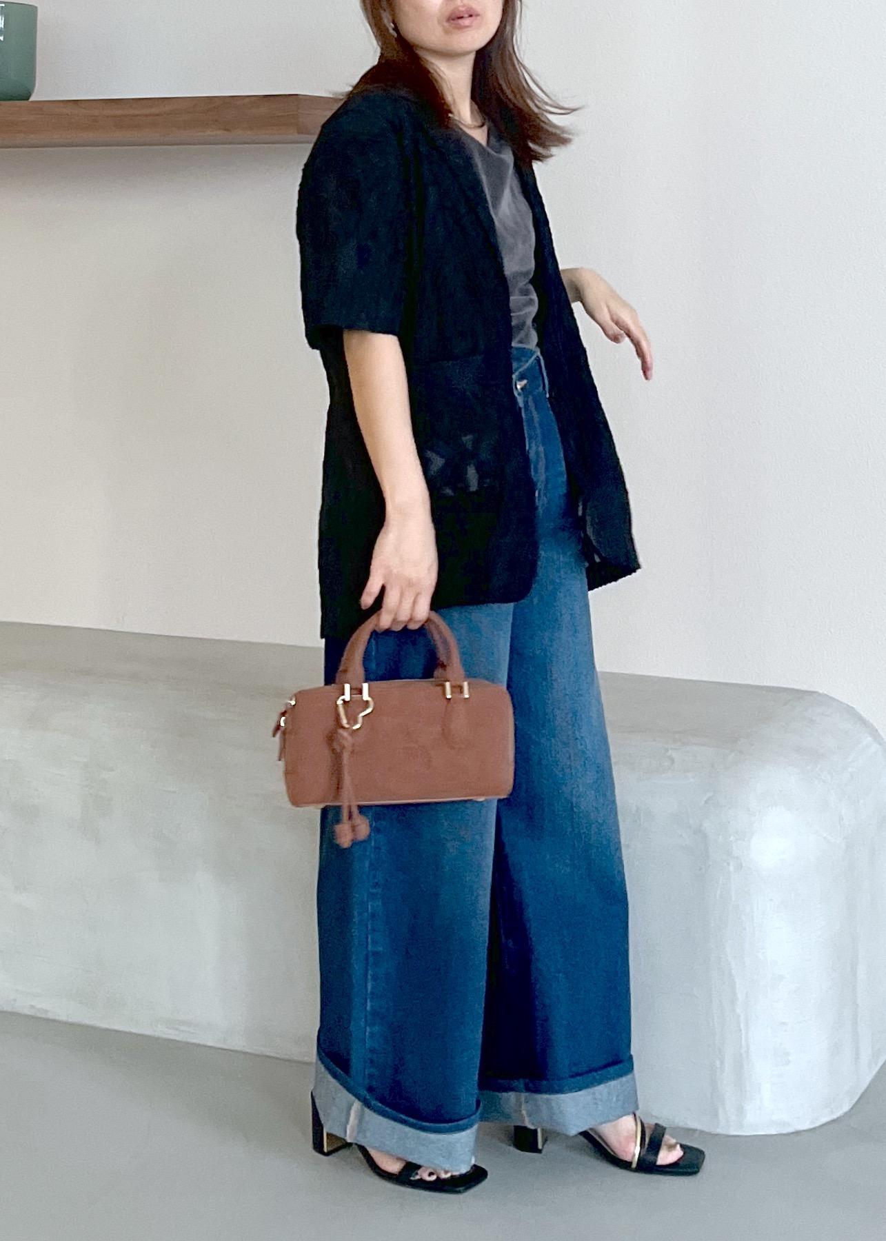 シンプルなトップスと羽織りを合わせるだけで、大人の余裕を感じさせる洗練カジュアルに。