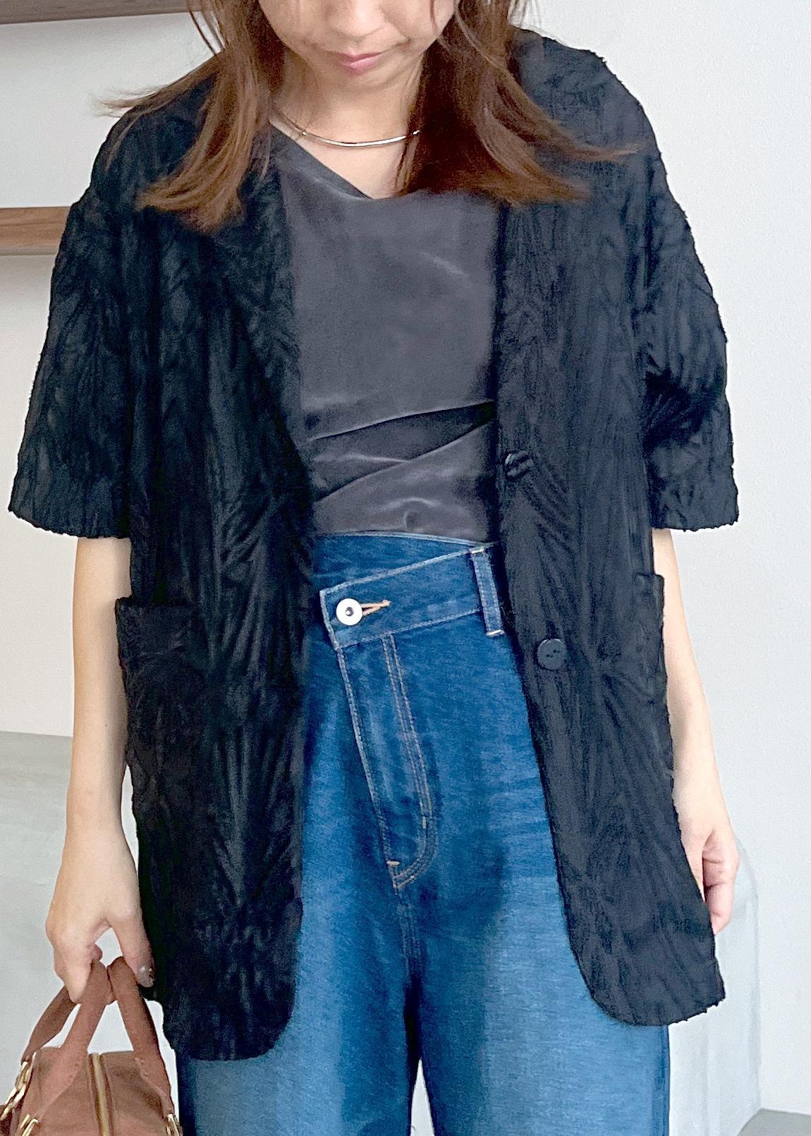 アウトレットVISシアージャガードハーフスリーブサマージャケットブラック / F¥5,536レビュー店舗限定入荷のジャケットです!152cmでお尻が隠れるくらいのやや長め丈。オーバーサイズですが、大きすぎず着られている感もなかったです。柔らかめ素材ですが、ややハリのあるジャケット。凹凸感のある表面感とシアーなところが大人っぽく決まる1枚!体型カバーしつつ、女性らしく着られます。