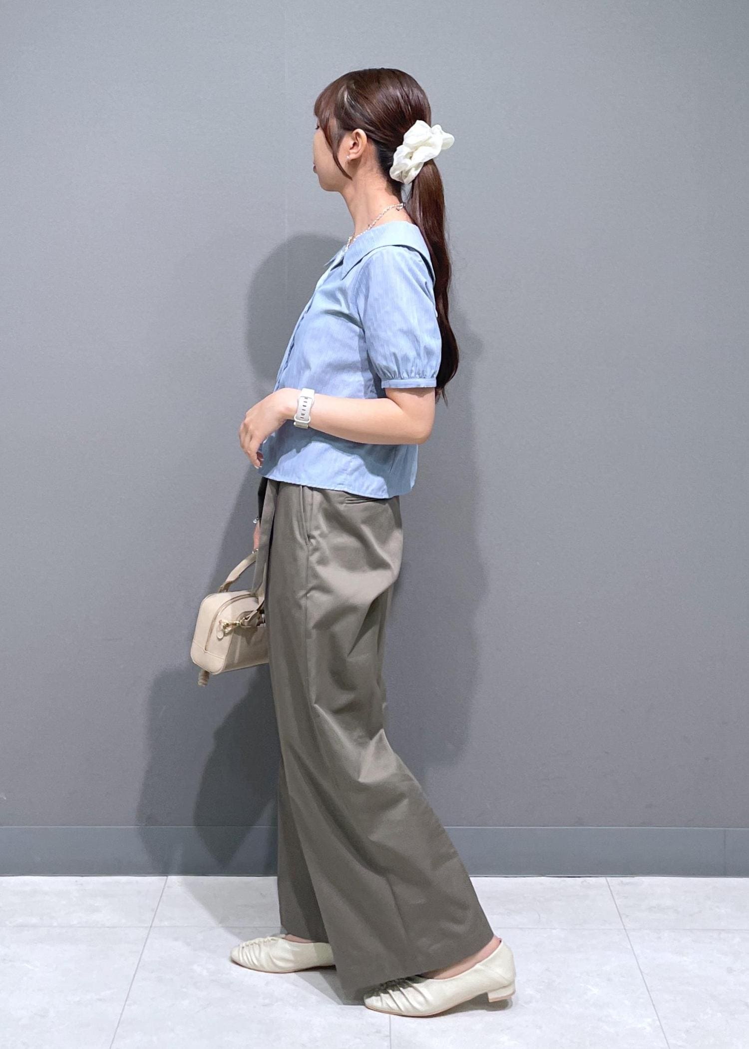 パフスリーブかつデコルテが見えるデザインなので、女性らしいシルエットになっています。 -