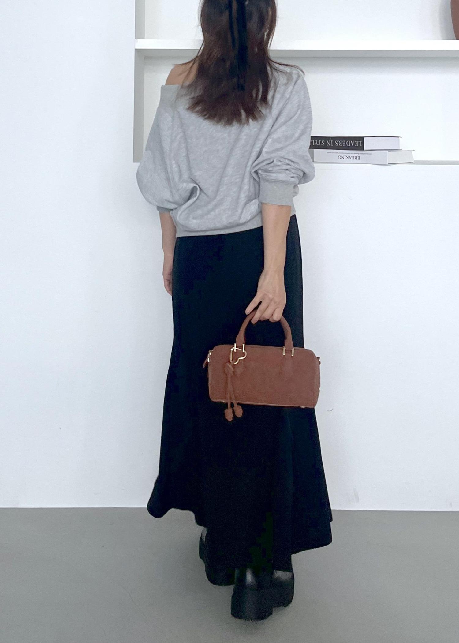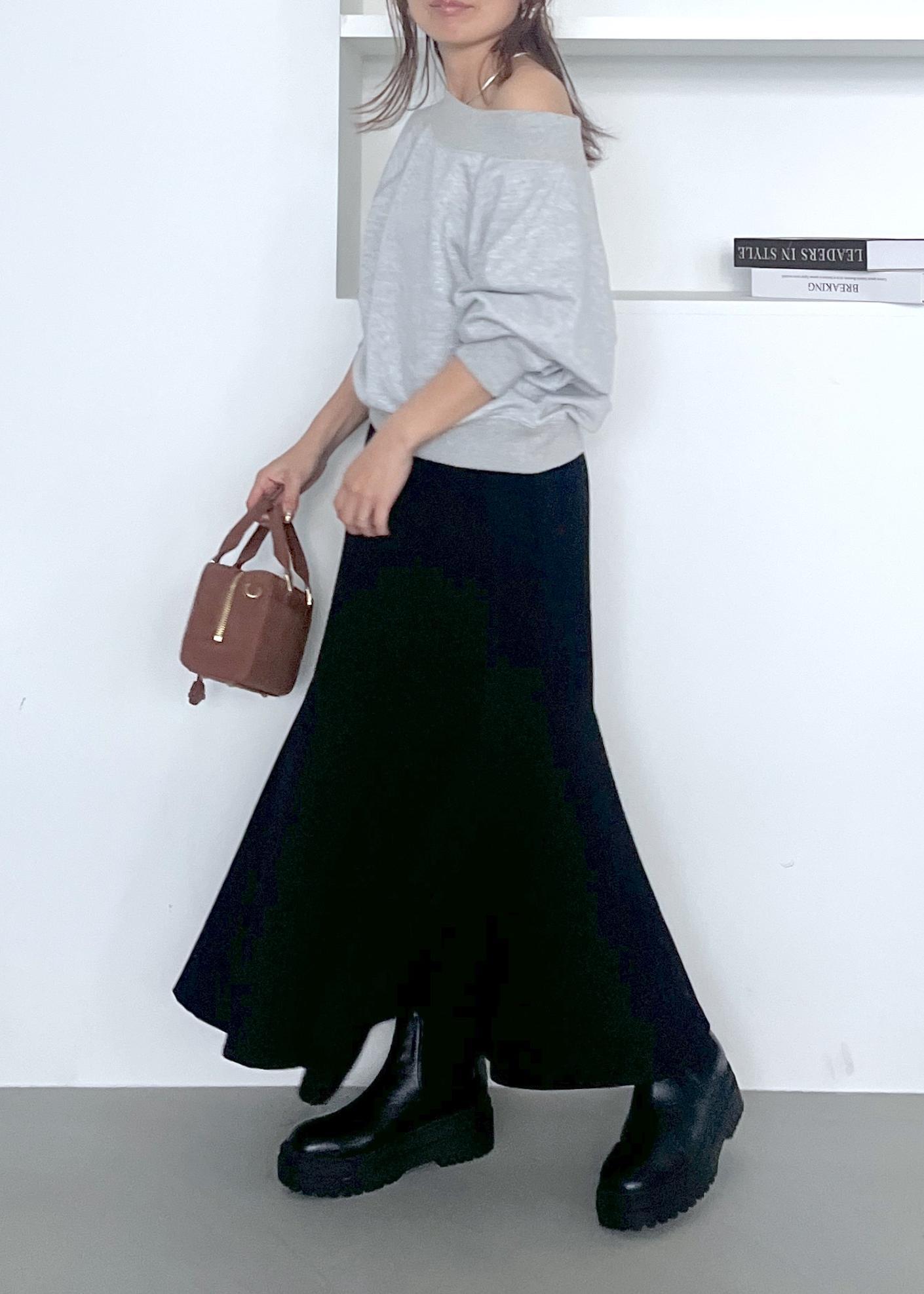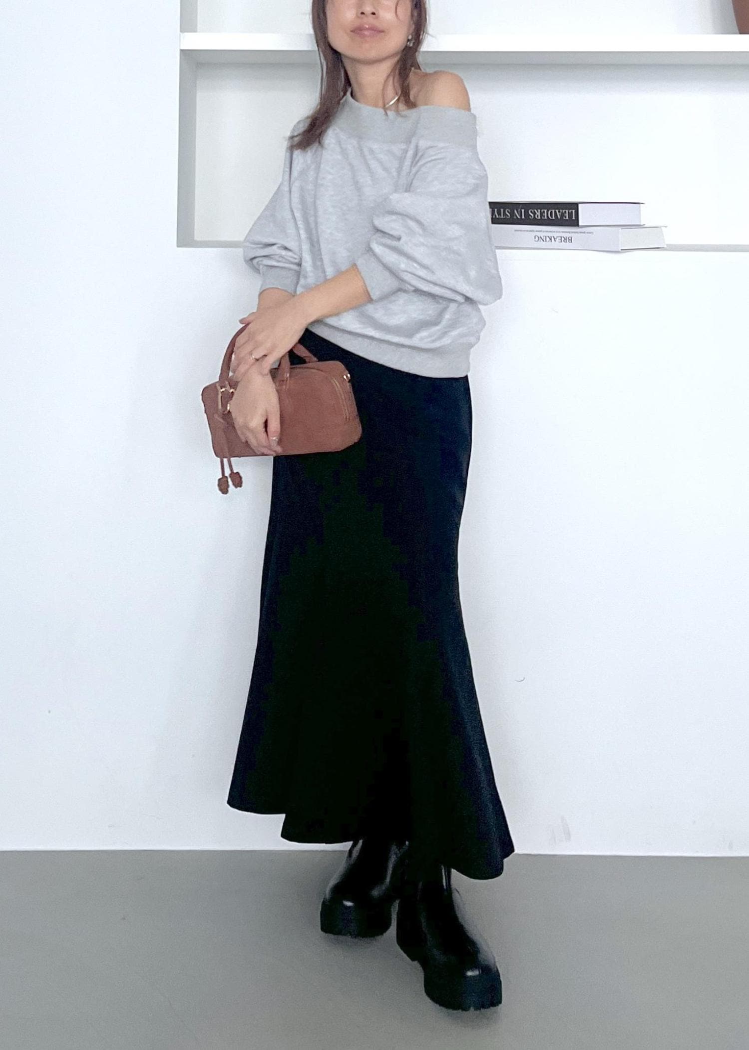 肩を抜いたシルエットで抜け感を出しつつ、マーメイドラインのスカートを合わせて女性らしさをプラス。