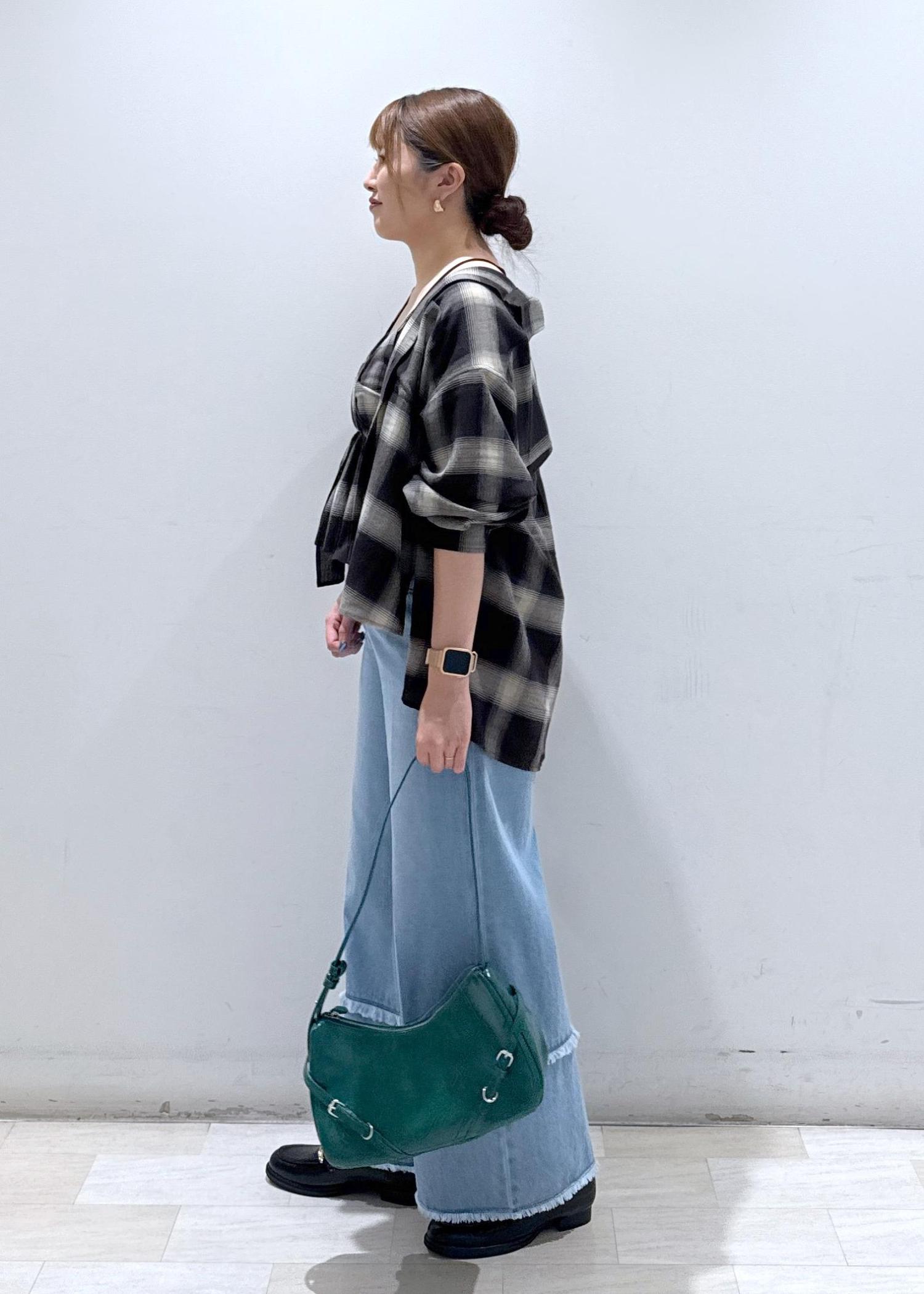 今回はこの年の秋にオススメのチェックシャツに、セットアップで着れるビスチェと合わせて着てみました。カジュアルに合わせたかったのでボトムスはワイドデニムと◎