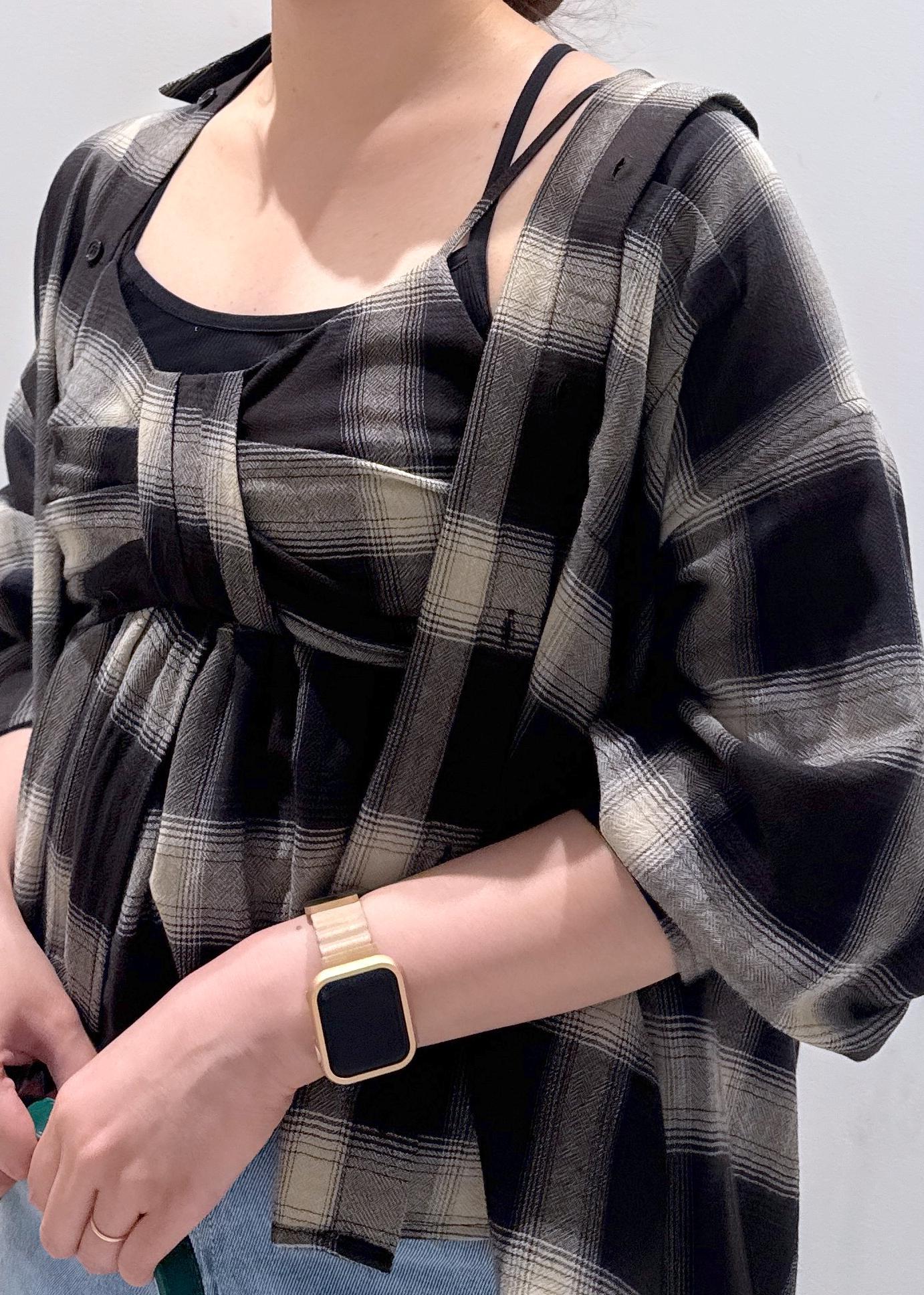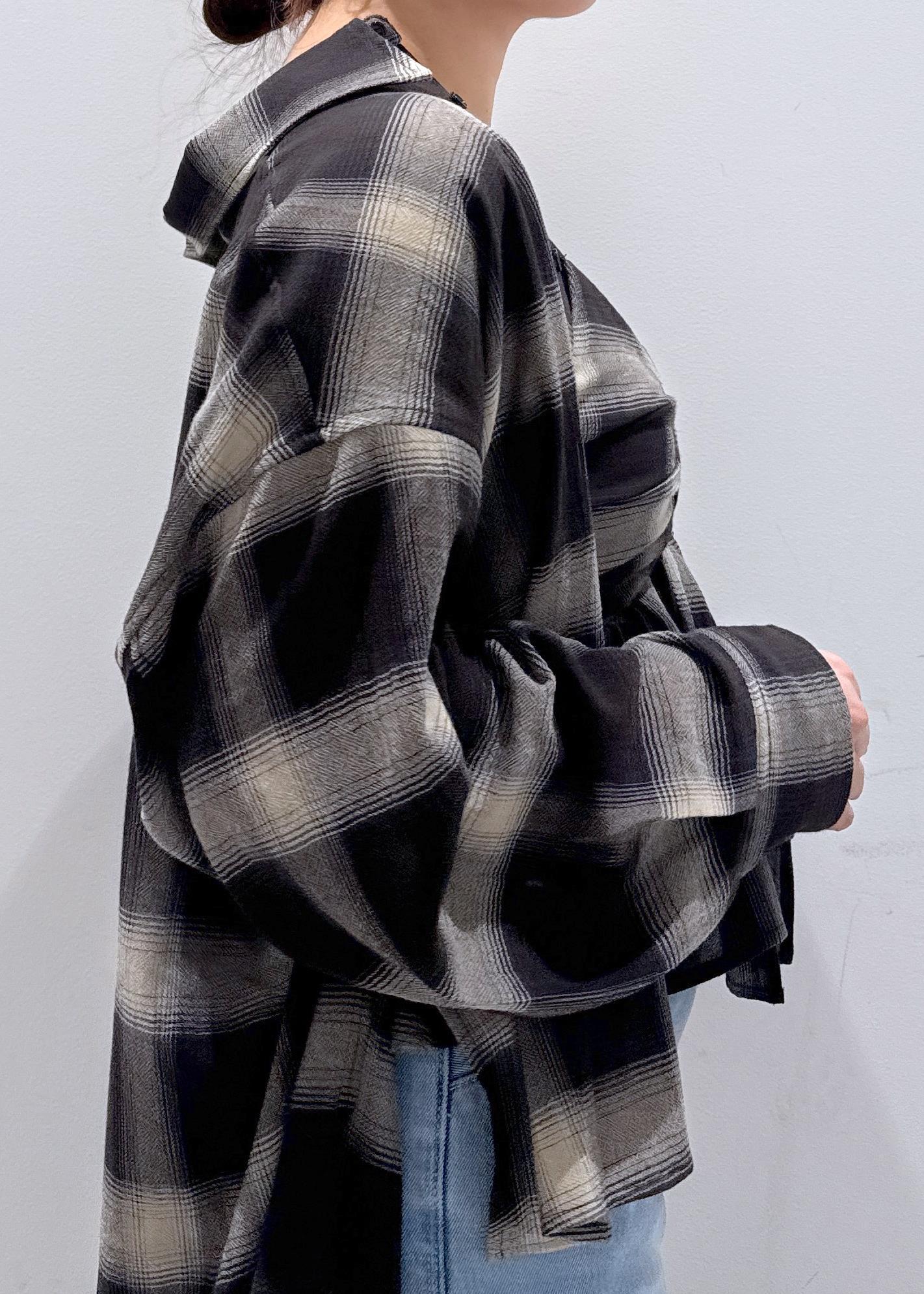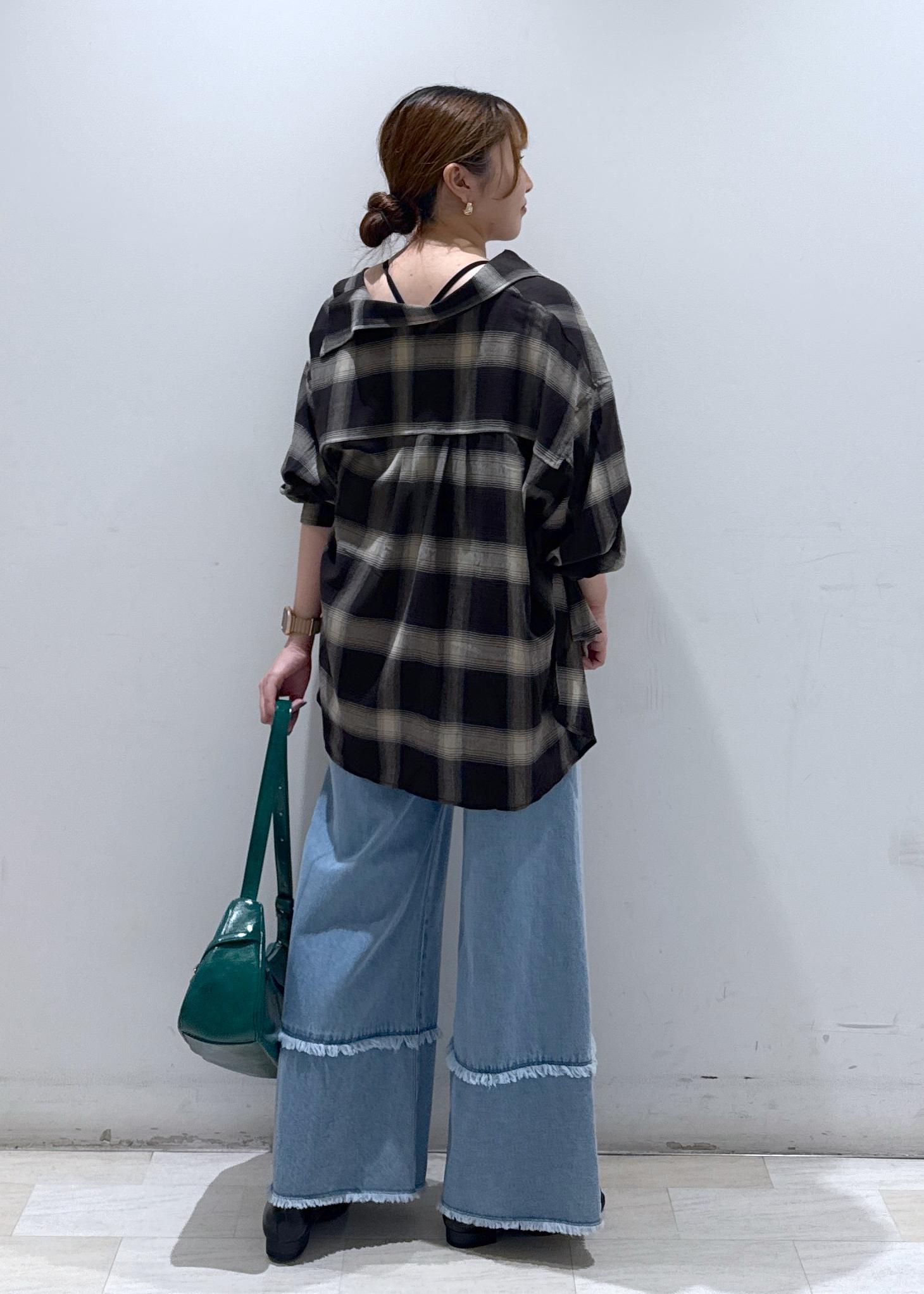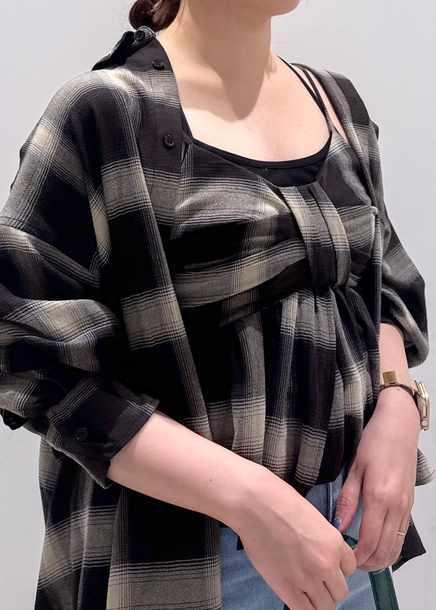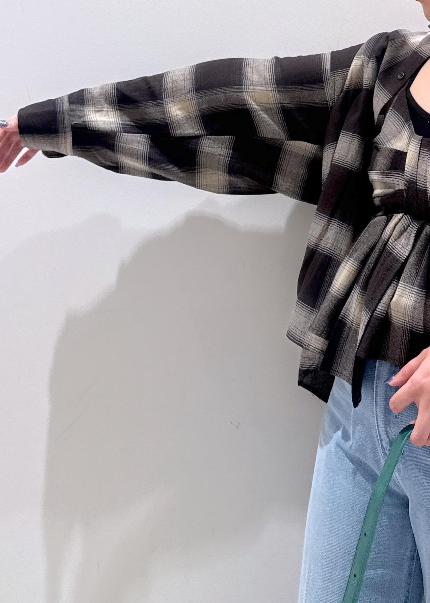 チェックシャツですと生地が分厚く重たいかなと思いましたが、見た目以上にサラッとしていて軽くて薄いです。なので今からの時期ですと肩に巻いたり腰に巻いたりアレンジに使うことができます。少し肌寒くなりましたらカーディガン代わりに前開きで羽織ってもOK◎