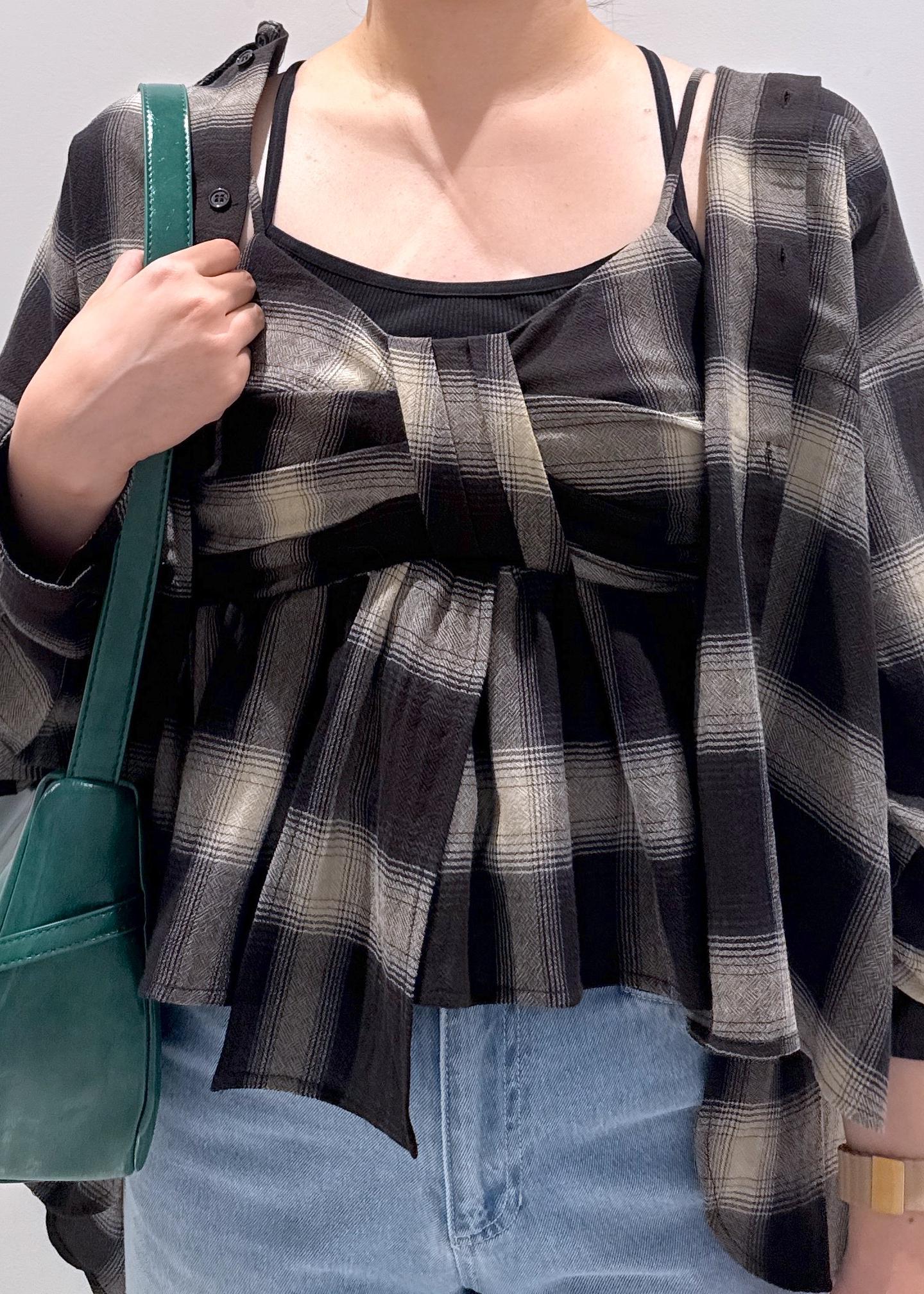 ねじれリボンが可愛いチェックビスチェ⭐︎チェック柄ですと少し生地が重たいイメージがありますが、こちらは薄手の素材で軽いので重たくならずに早く秋を楽しみたい方にオススメです!肩紐のアジャスターでバストの位置を調節することができ、後ろがゴムでつくられているので伸び感があったので骨格ストレートの上半身分厚い身体の私でも着ることができました。