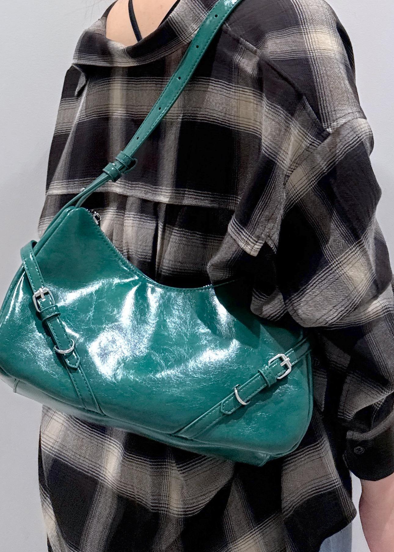 合皮のエナメルのような素材感で見た目はツルッとしています!ベルトのようなデザインがお洒落で私はグリーンの色が可愛くておすすめしています♡待ち手の部分は長さが調節できるので気分によって変えることができます!バッグの容量してはお財布、携帯、タオル、ポーチ、お化粧ポーチ、ミラー、500mlのペットボトルなど荷物がたくさんある方でも使いやすいと思います。