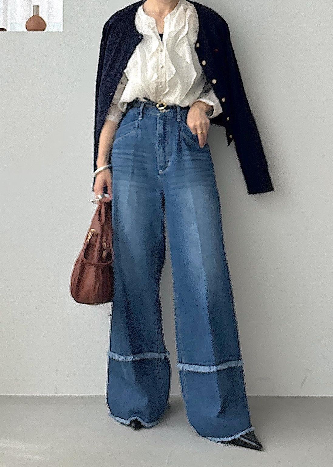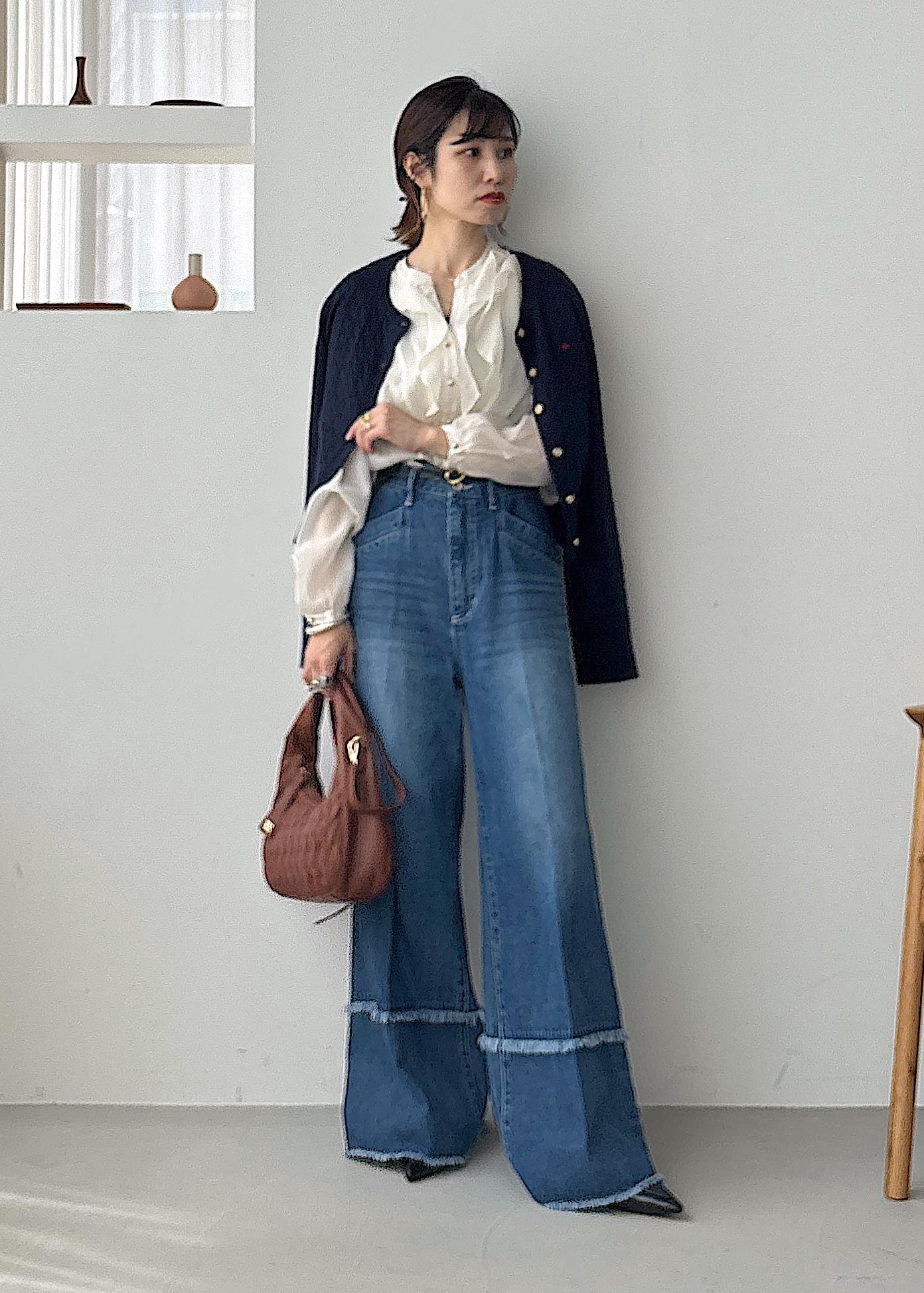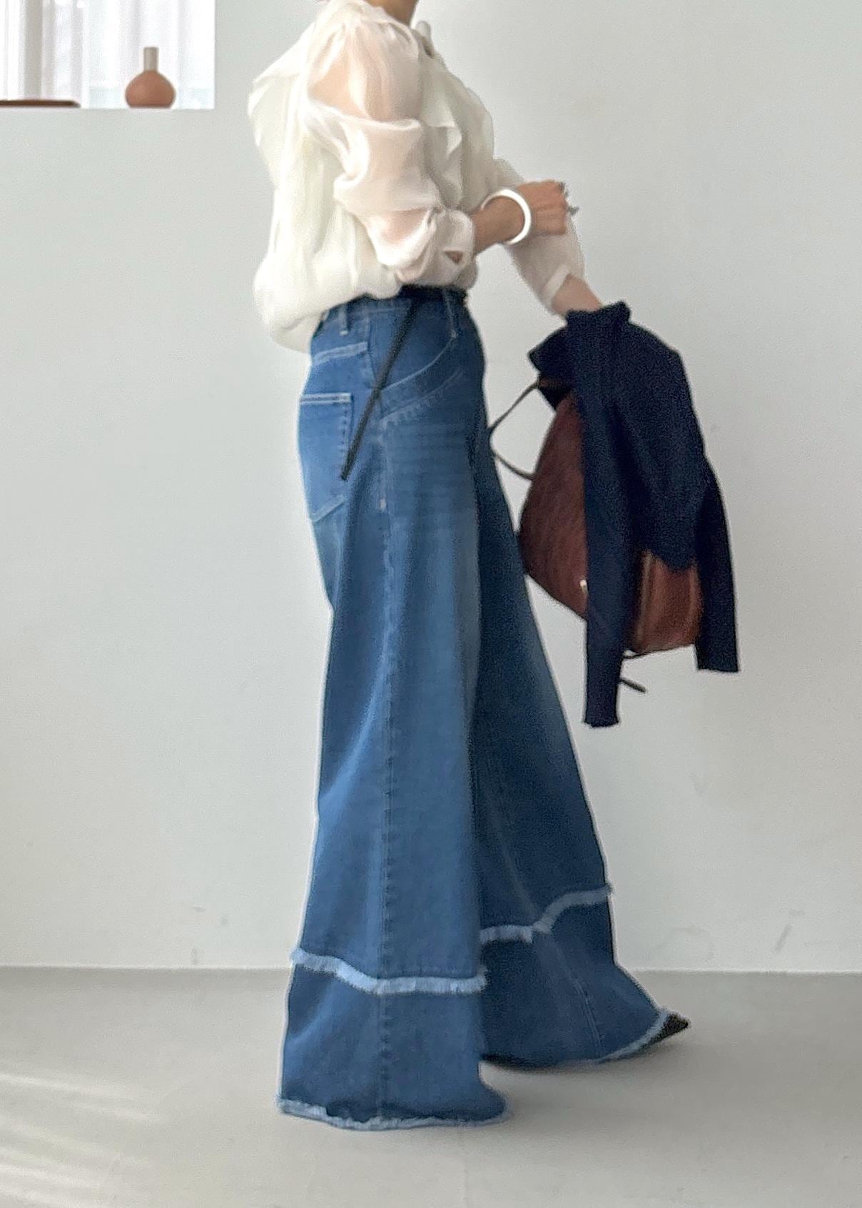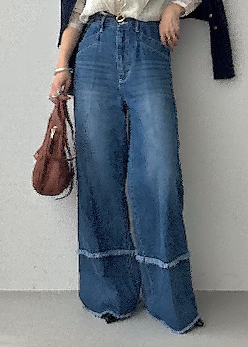 VISフリンジフレアデニムブルー系 / M¥4,395レビューフリンジデザインがポイントのフレアデニム♪裾と膝の間にもデザインが入っているので、デニム好きの方は今年らしいアップデートが叶うアイテムです。幅のあるフレアラインが身体のシルエットを拾いすぎない、大人可愛いデザインです◎厚すぎず、薄すぎずとちょうど良い。普段Sサイズですがサンプルの為Mサイズ着用、全体的にゆったりしていて、着丈は足首が隠れる長さ。4cmヒールを履いて裾がつかないくらいの長さになりました。