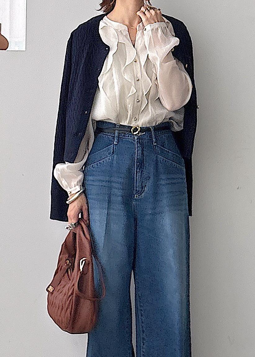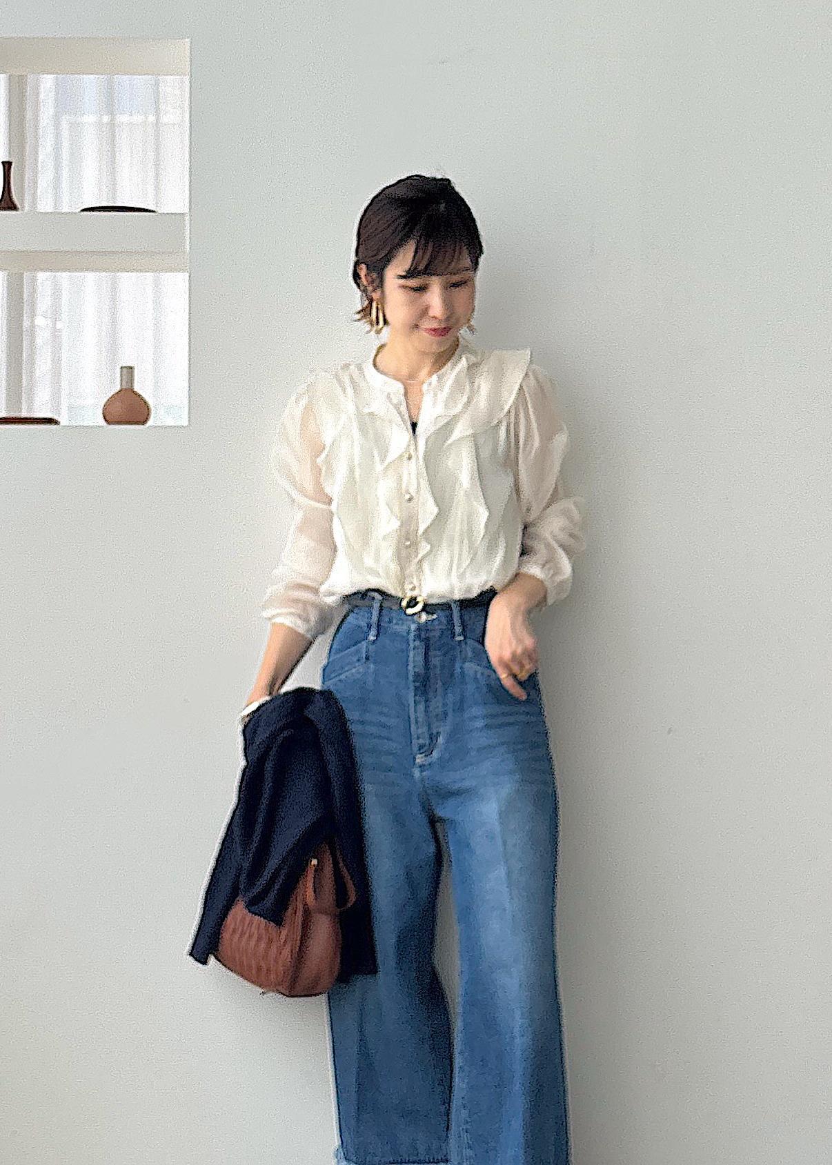 ラッフル調が今年らしく、縦に入っている事でボリュームが抑えられ、スタイルがとてもキレイに見えます◎身頃には裏地がついているので透け感を抑えられるのも嬉しいポイント◎軽くてさらっとした着心地で、春から夏まで着回せます。全体的に程よくゆったり、着丈は腰が隠れる位の長さでインスタイルと出来ます。 -