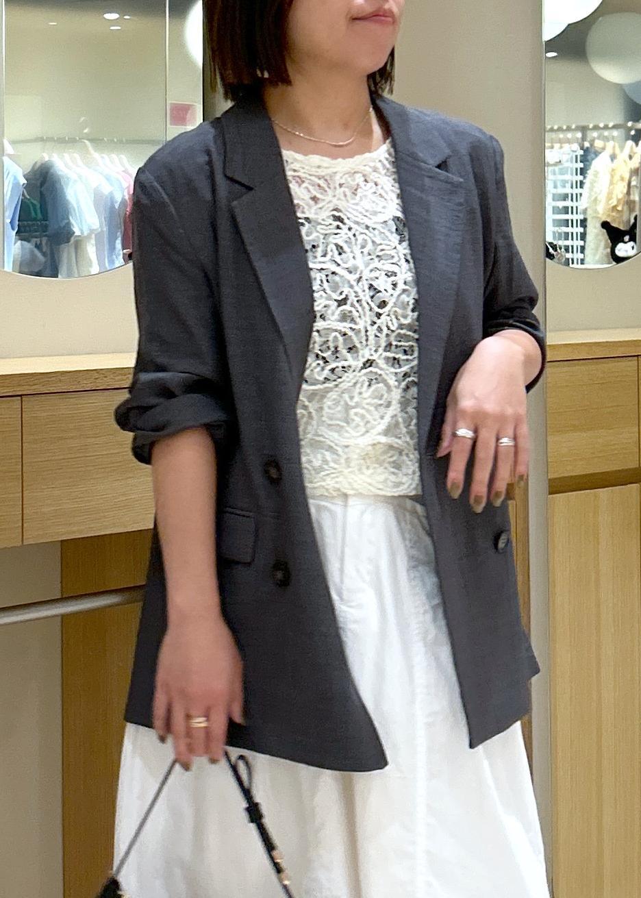 コード刺繍のレーストップスとフレアスカートを合わせて