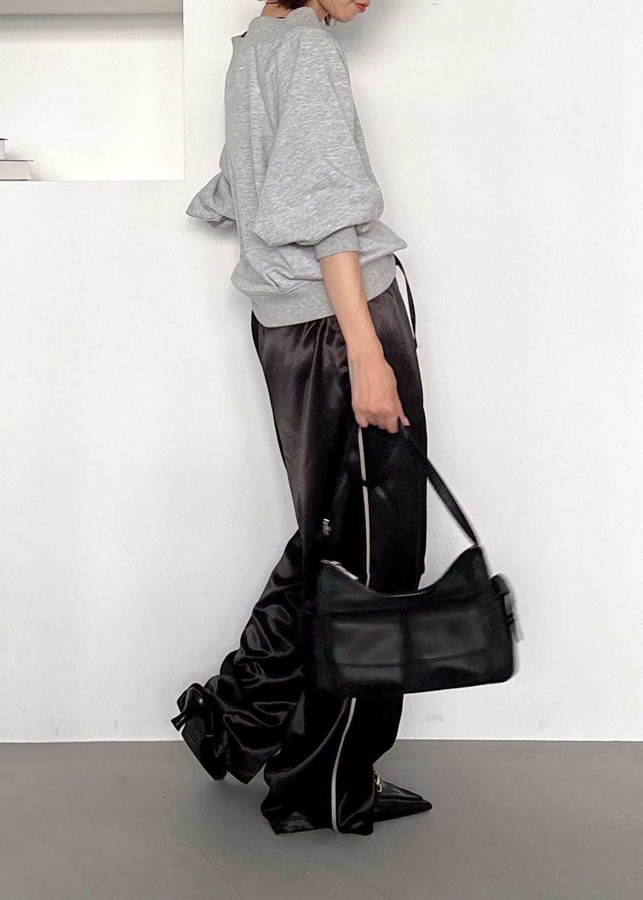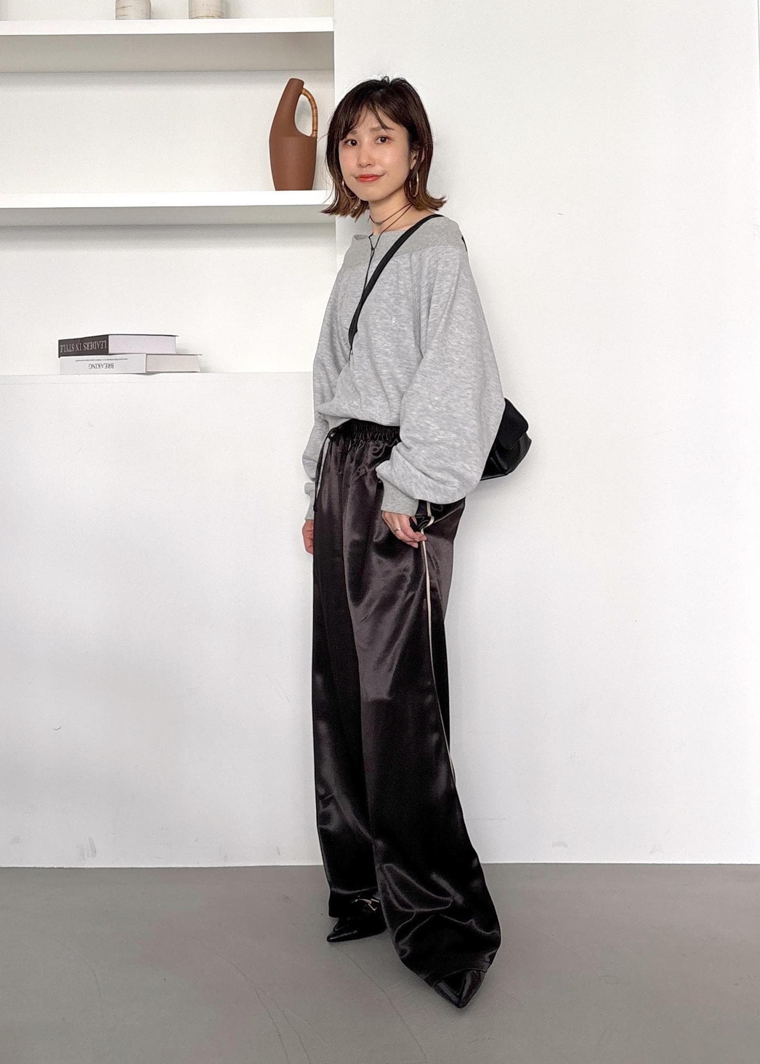 今年らしいサイドラインのサテンパンツ♪柔らかな素材で動きやすく、とても着やすいです。程よい光沢感が大人可愛い印象で、スポーティーさもモード感も叶うのでとても好み◎ウエストはドロストコードで調整が可能です。全体的にゆったりめ、着丈は足首が隠れる長さでした。