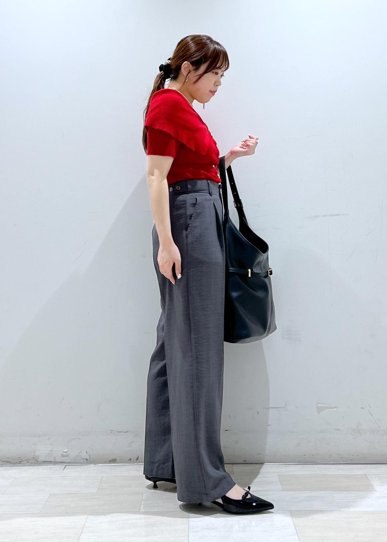 私は身長155㎝で今回Mサイズの着用で、少し着丈は長めですがこなれ感を出すためにこちらを着用しています。 -