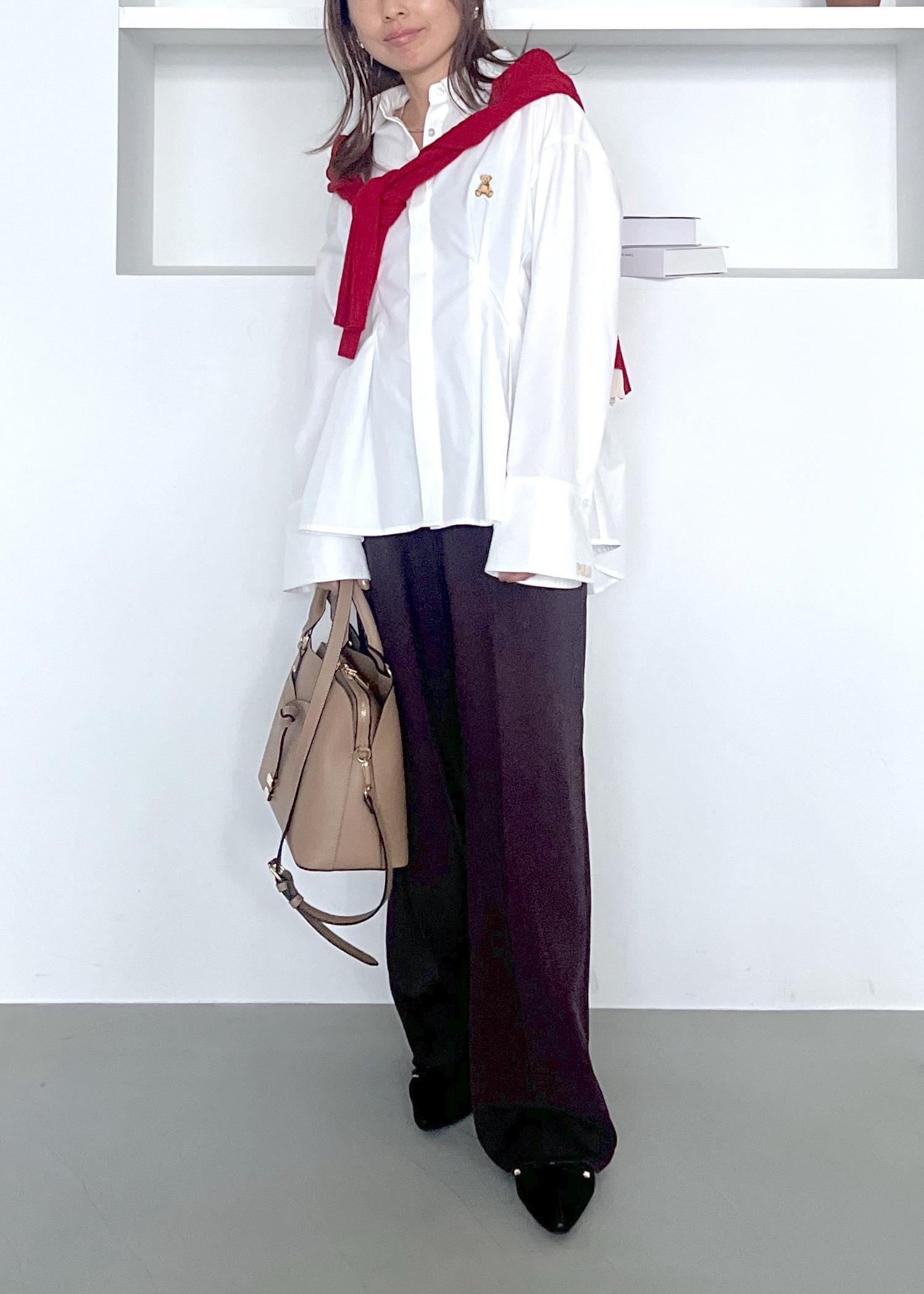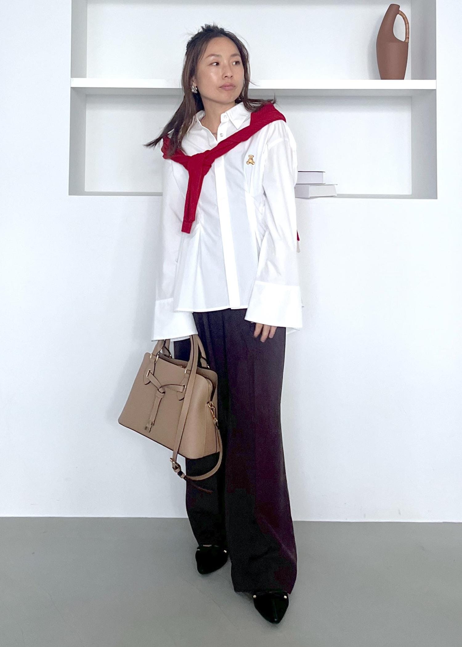 トレンドの赤を効かせて、大人可愛い着こなしに仕上げました。