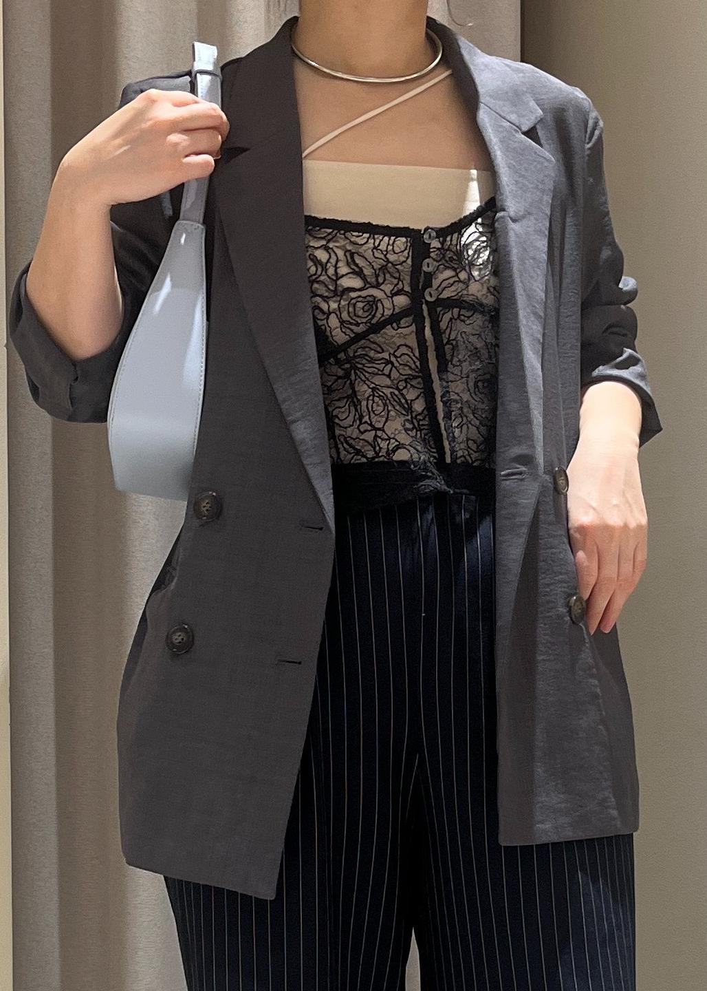 シルエットはゆるっとですが、レースのディテールや小物で華やかさを取り入れたジャケットスタイルです。