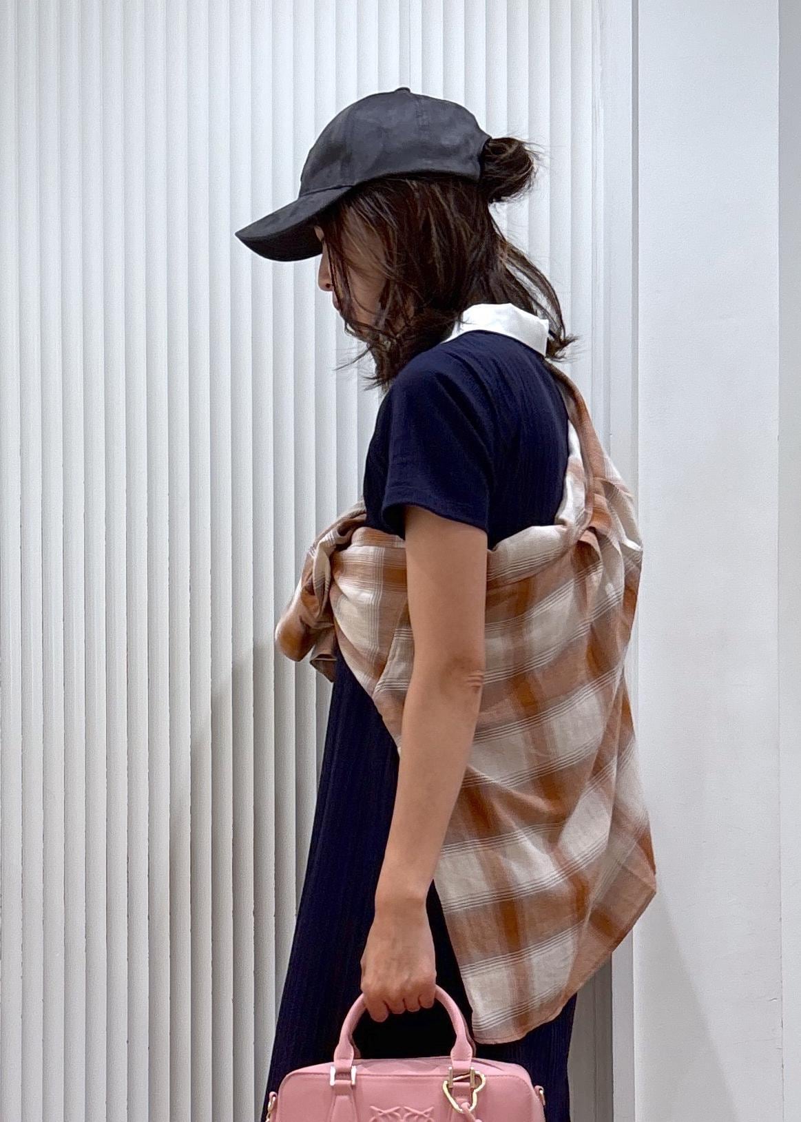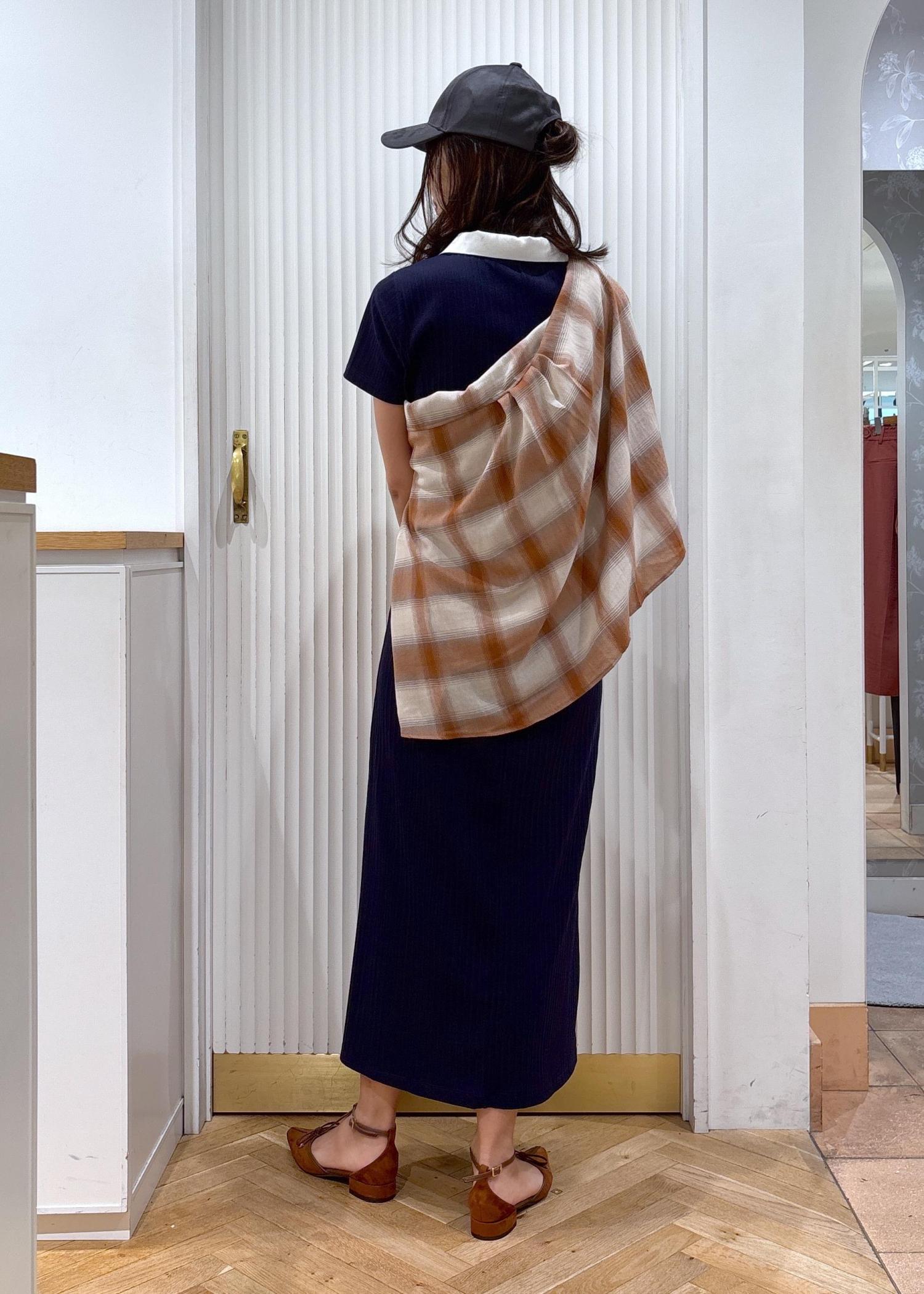 身体のラインを綺麗にみせてくれる細リブのワンピースにチェックのシャツをアクセントにしたコーディネートです。
