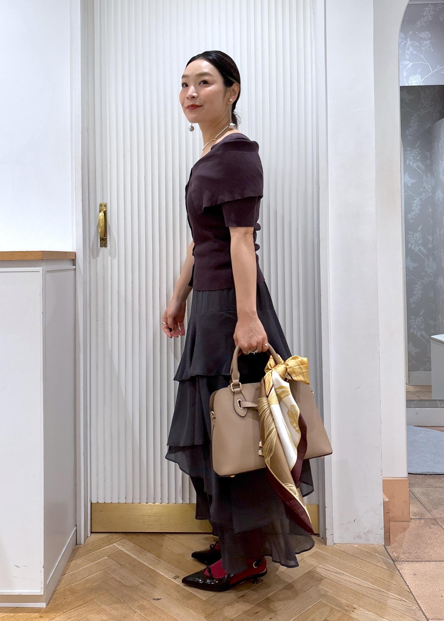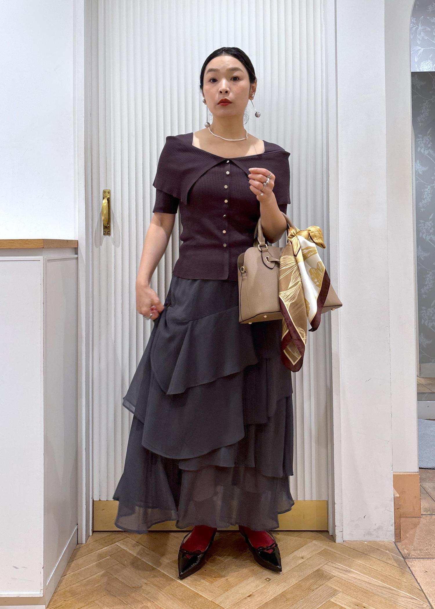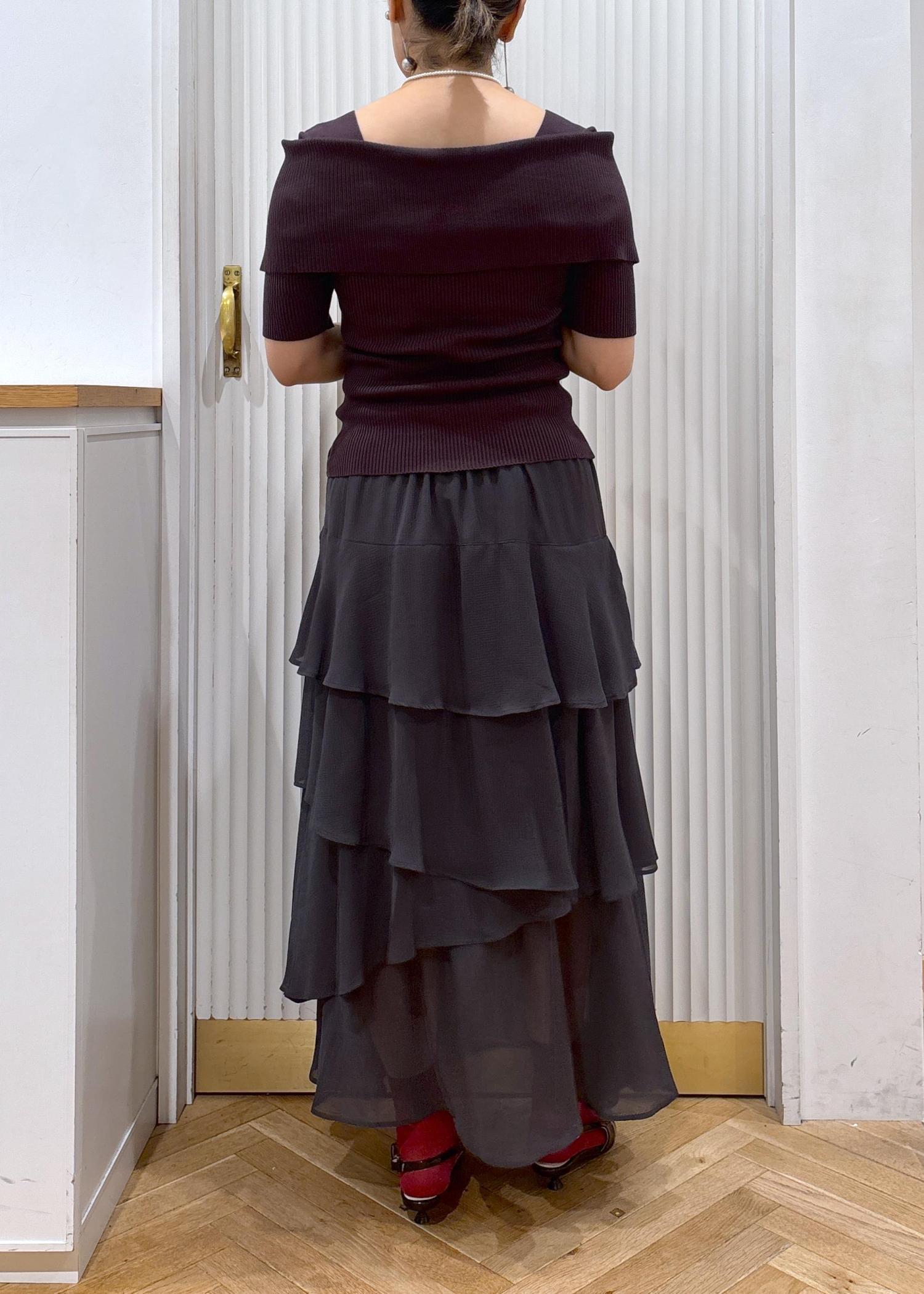 こちらのオフショルのニット、入荷からとっても人気!ティアードのスカートに合わせて大人レディコーデ♫