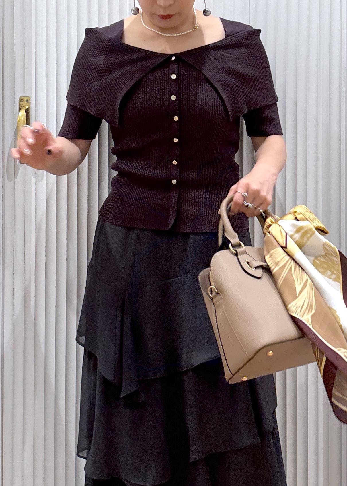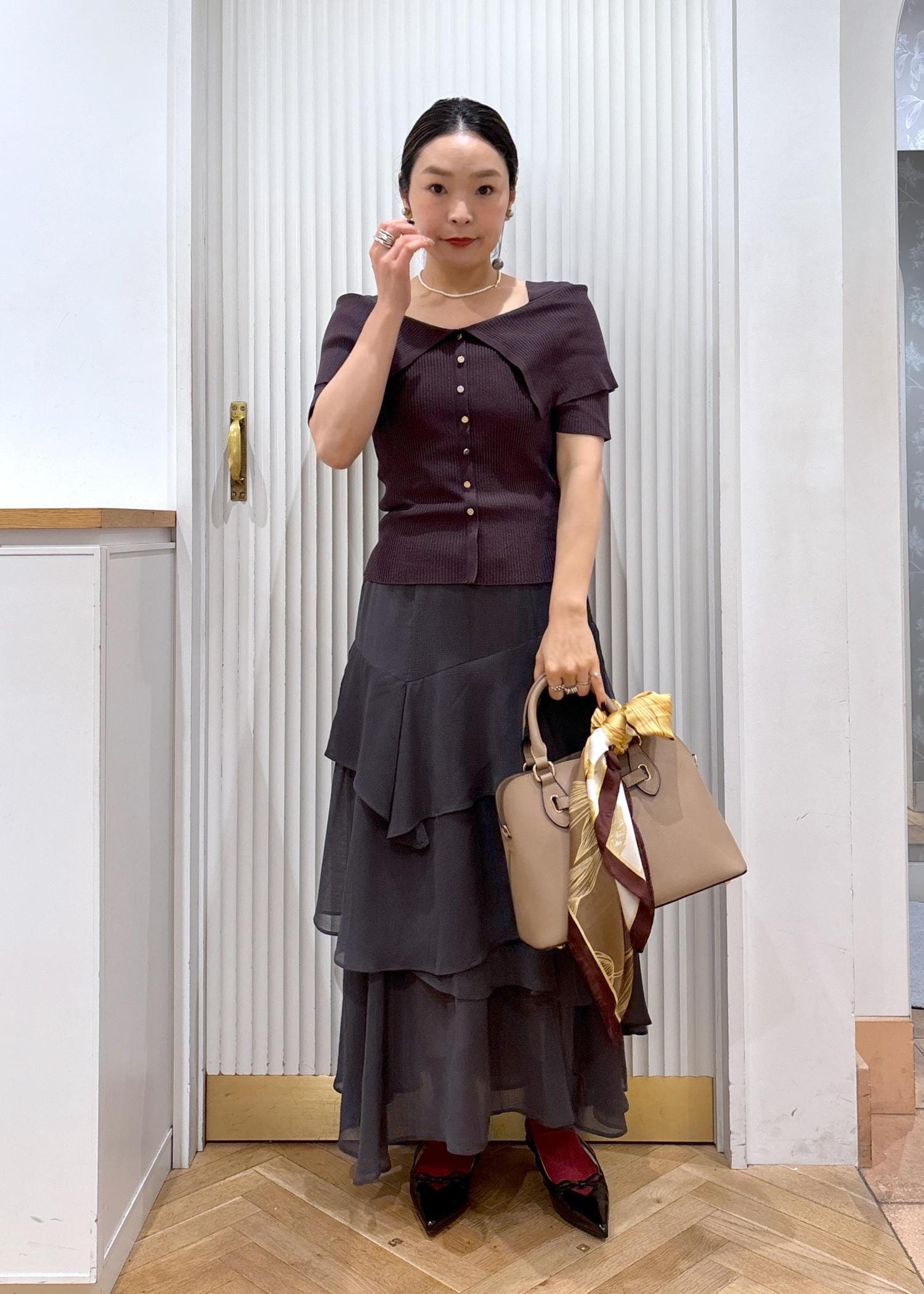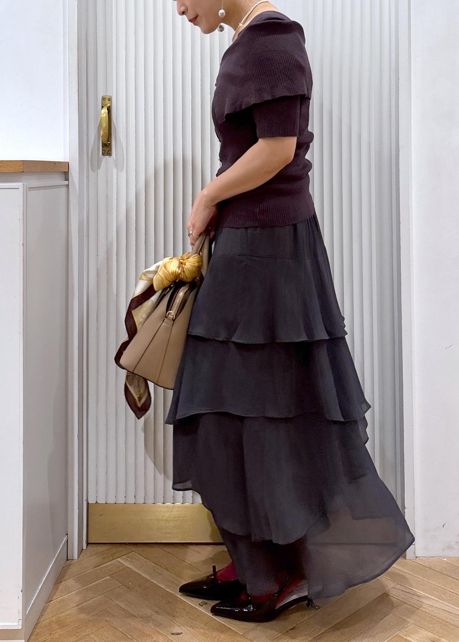 こちらのオフショルのニット、入荷からとっても人気!ティアードのスカートに合わせて大人レディコーデ♫