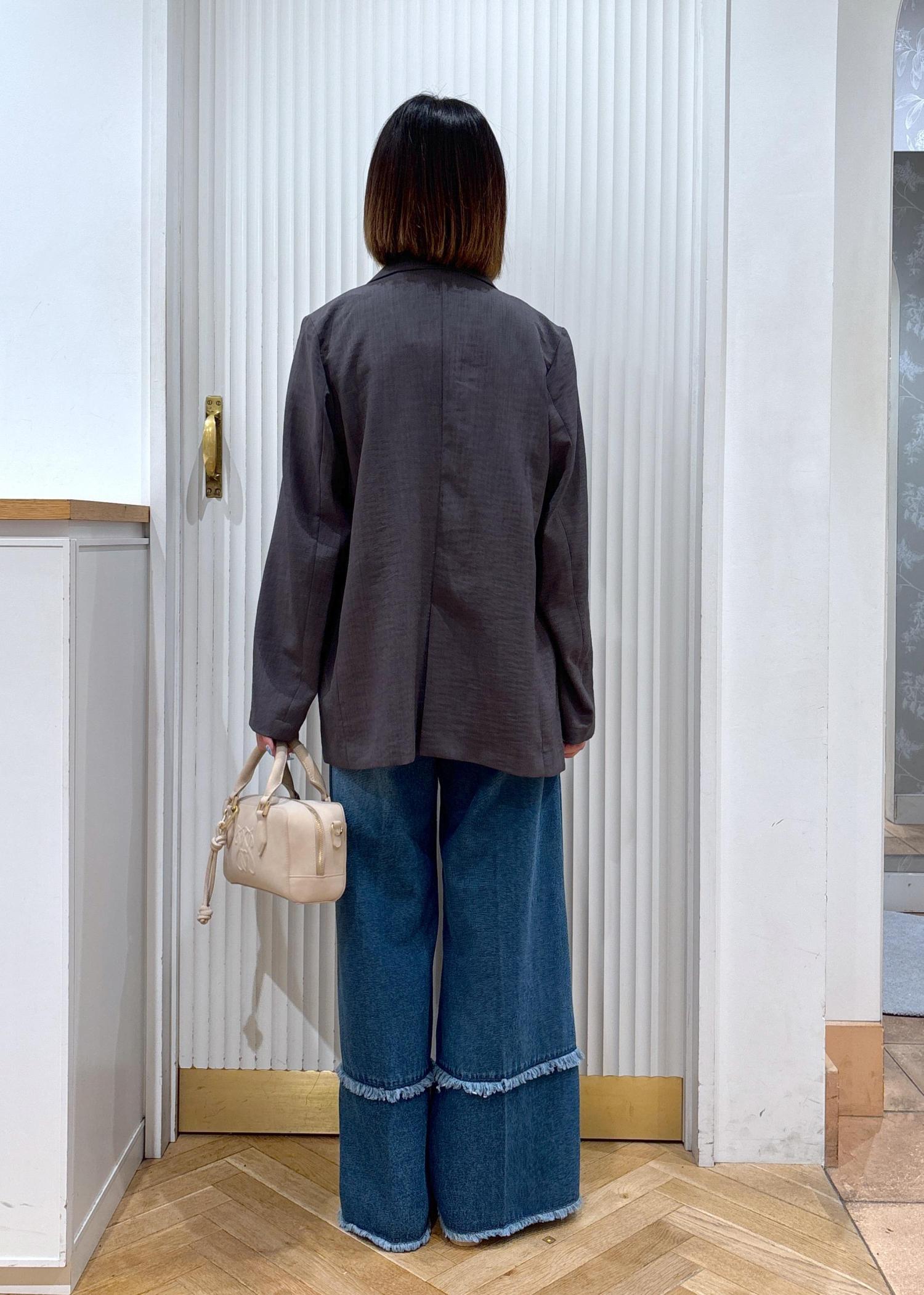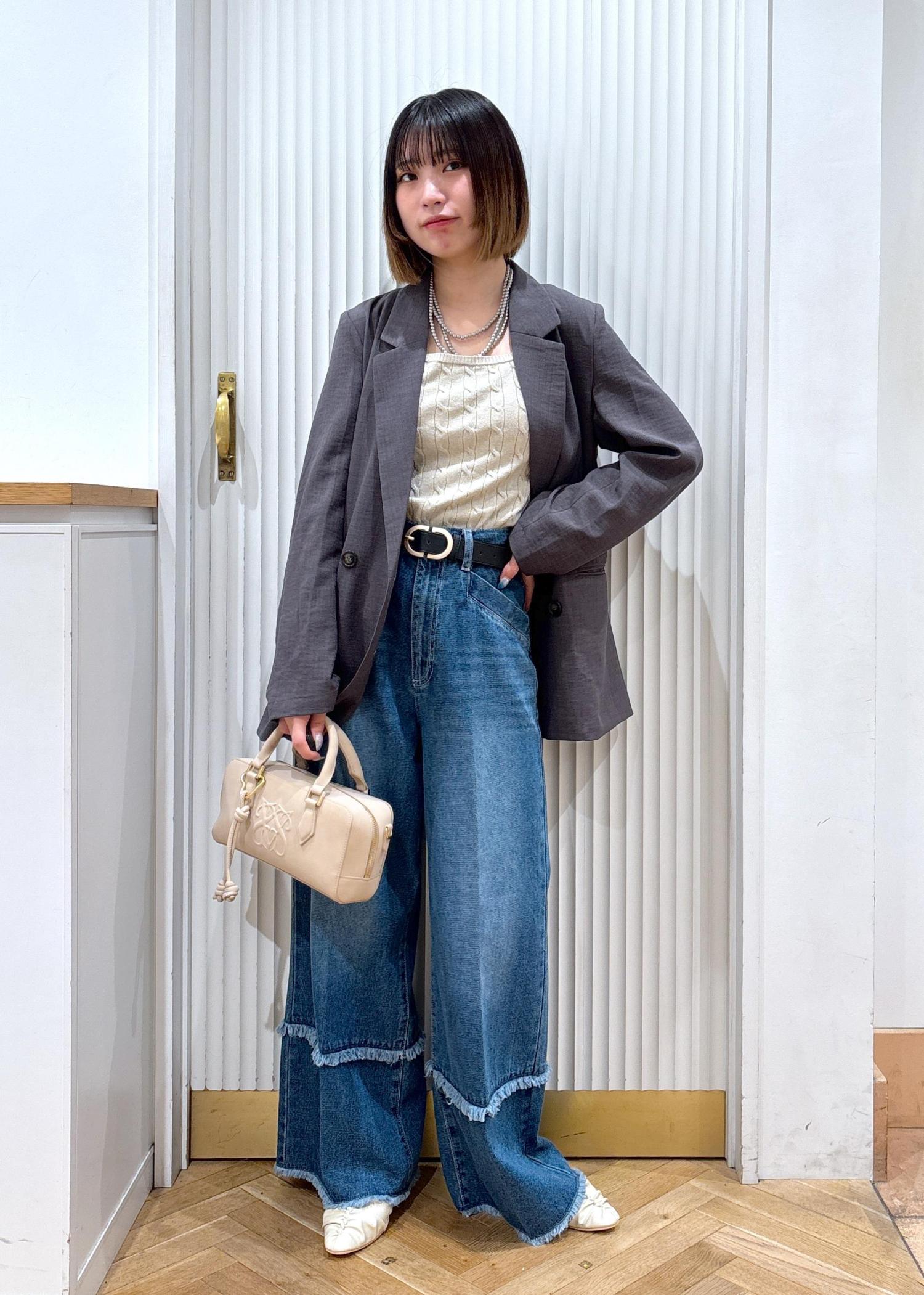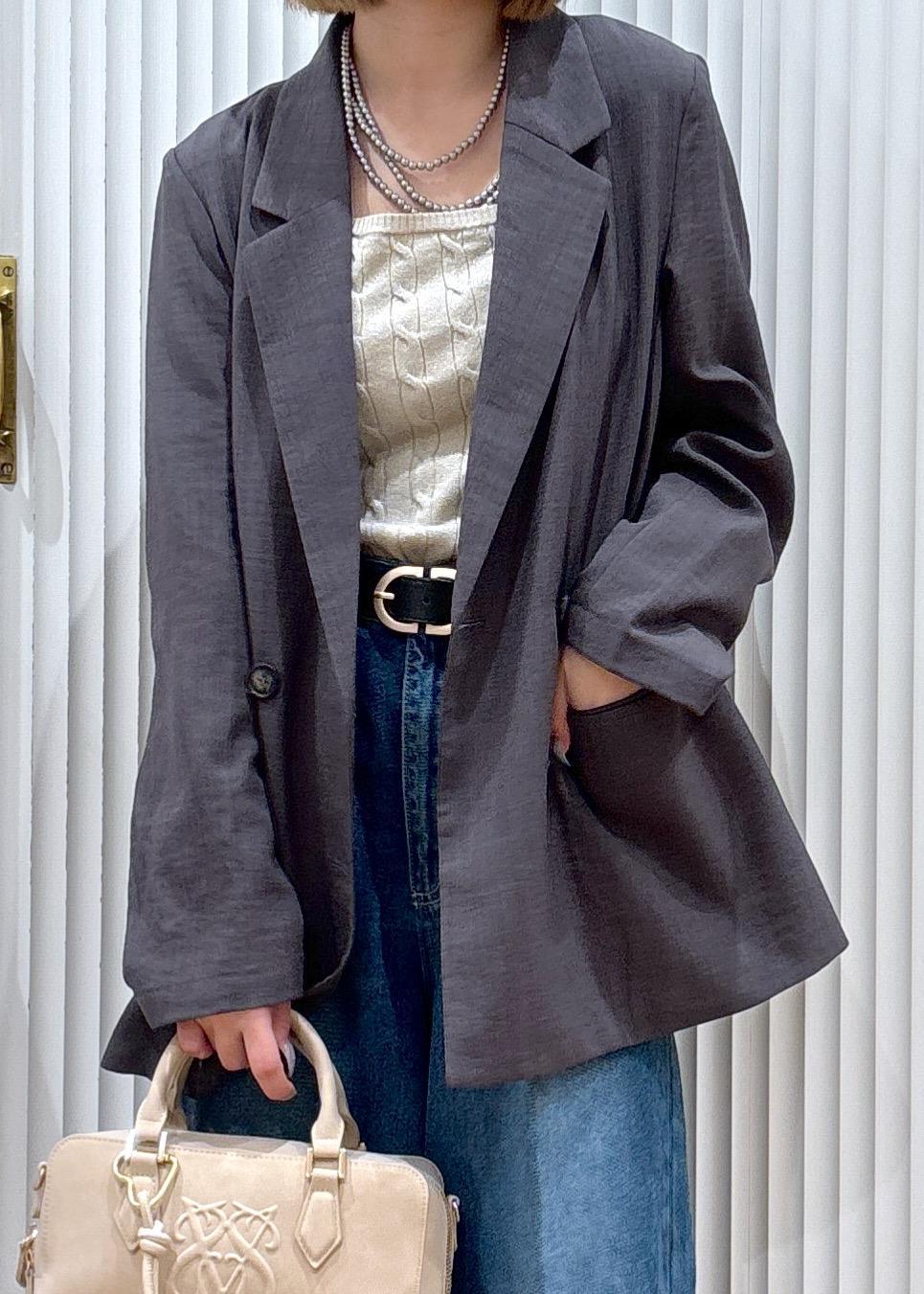 美easyのジャケットにデニムを合わせることで秋らしいコーディネートになります。中にラメ感のあるケーブルニットを入れることでより秋らしさがアップします!