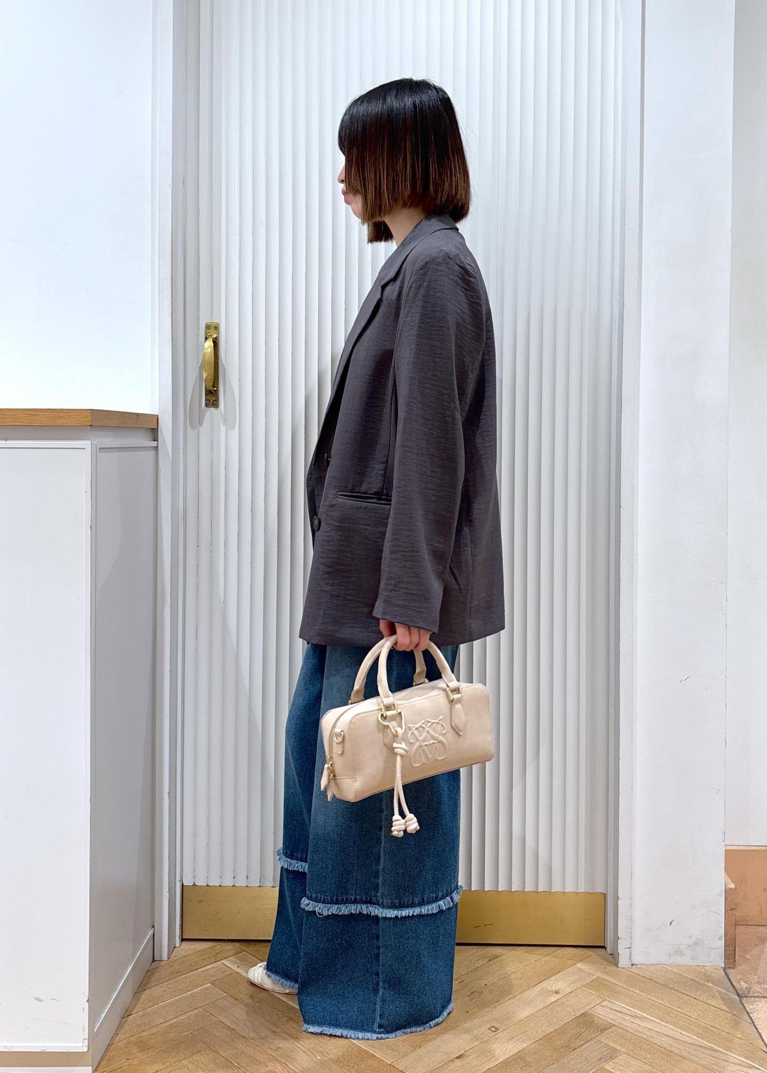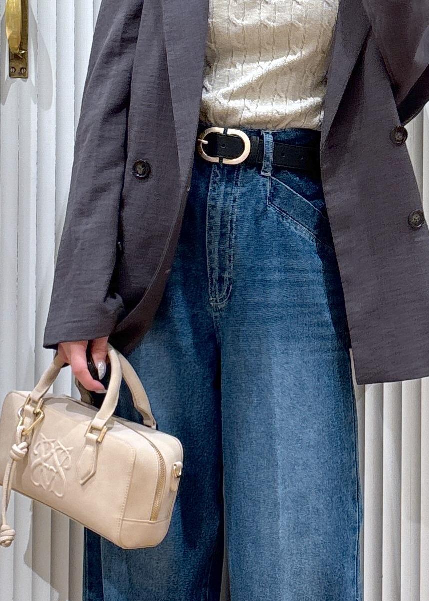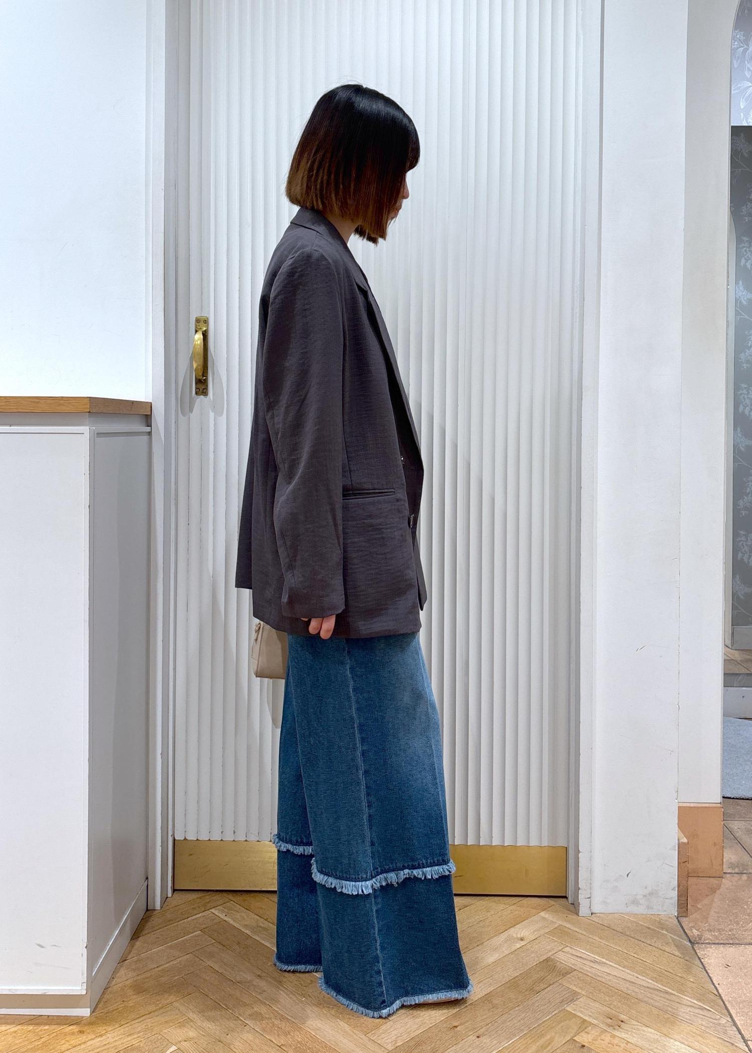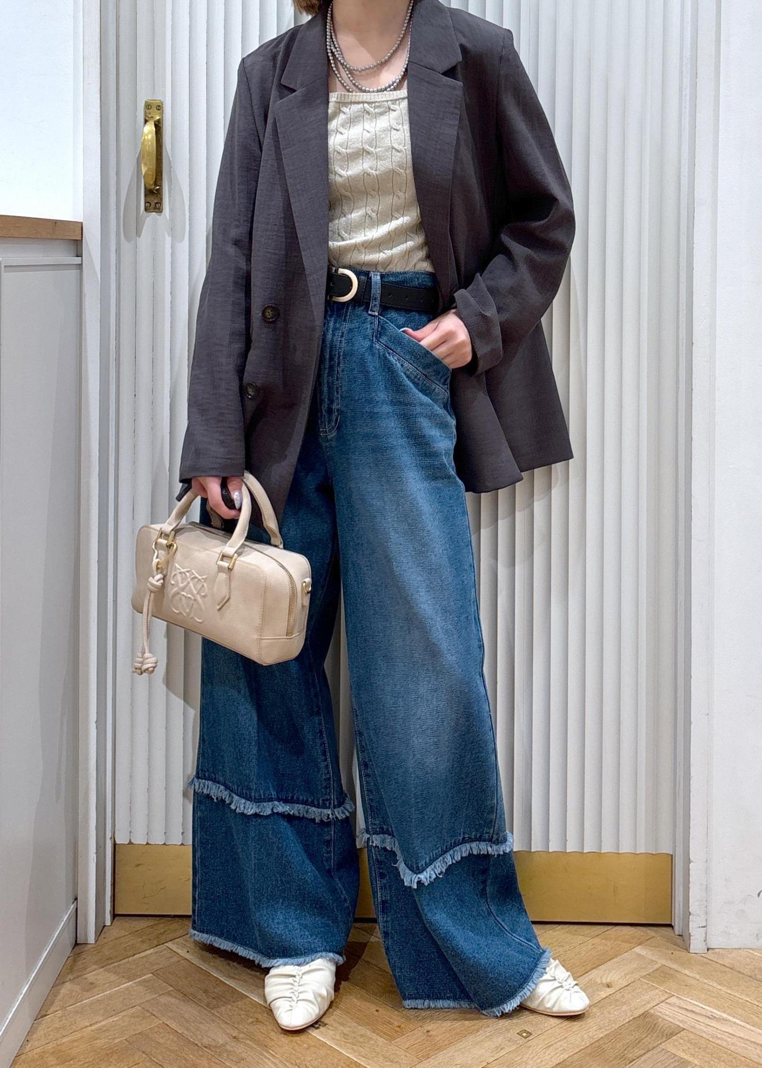 美easyのジャケットにデニムを合わせることで秋らしいコーディネートになります。中にラメ感のあるケーブルニットを入れることでより秋らしさがアップします!
