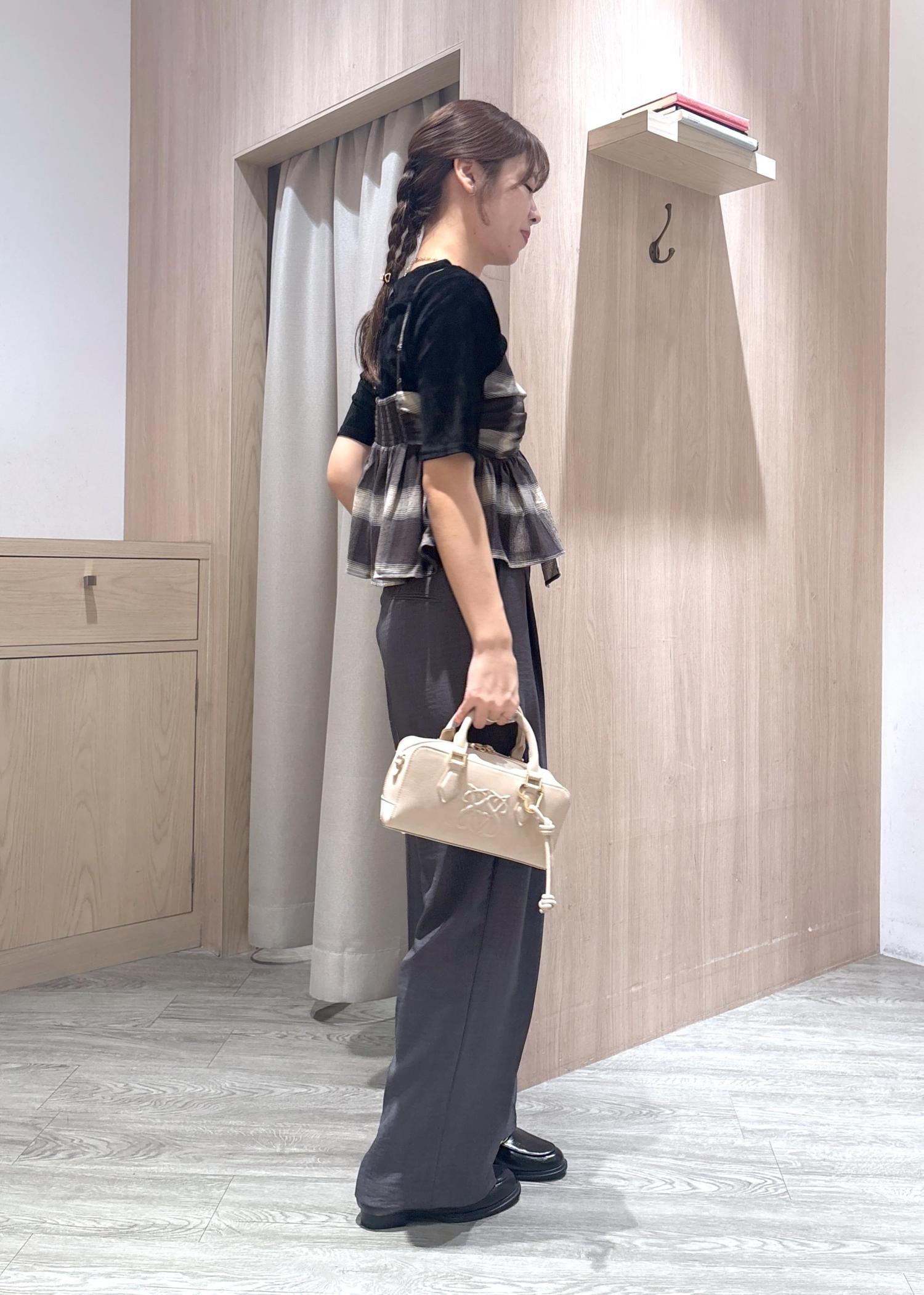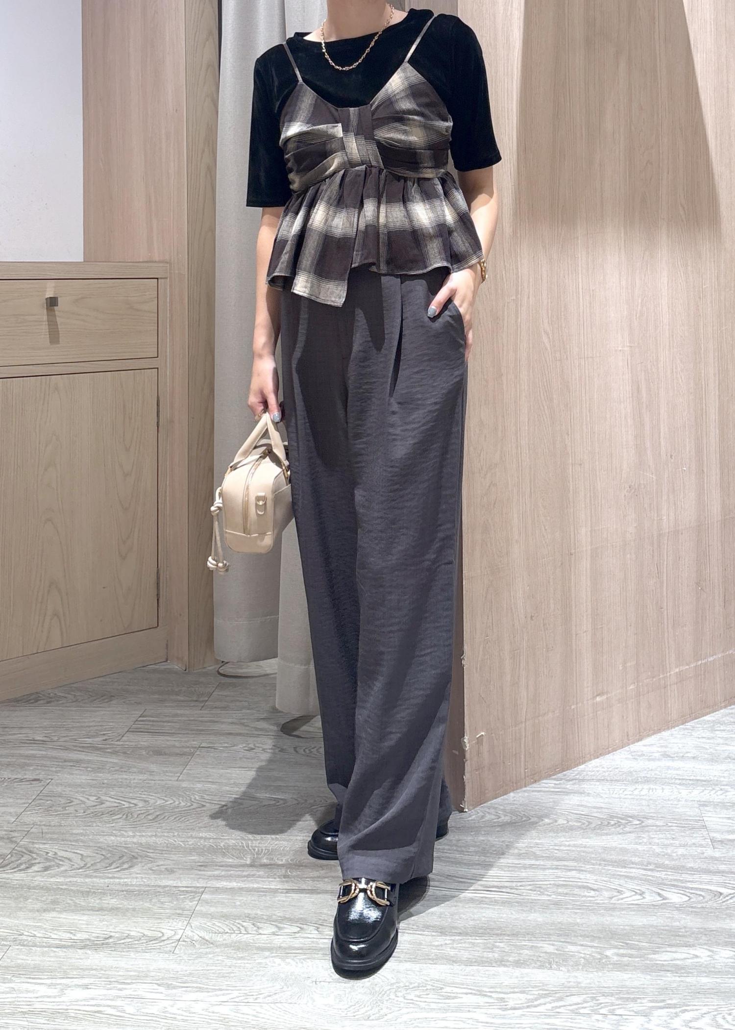 甘くなりすぎないように、ブラックカラーのベロアトップスとグレーのパンツを合わせました!