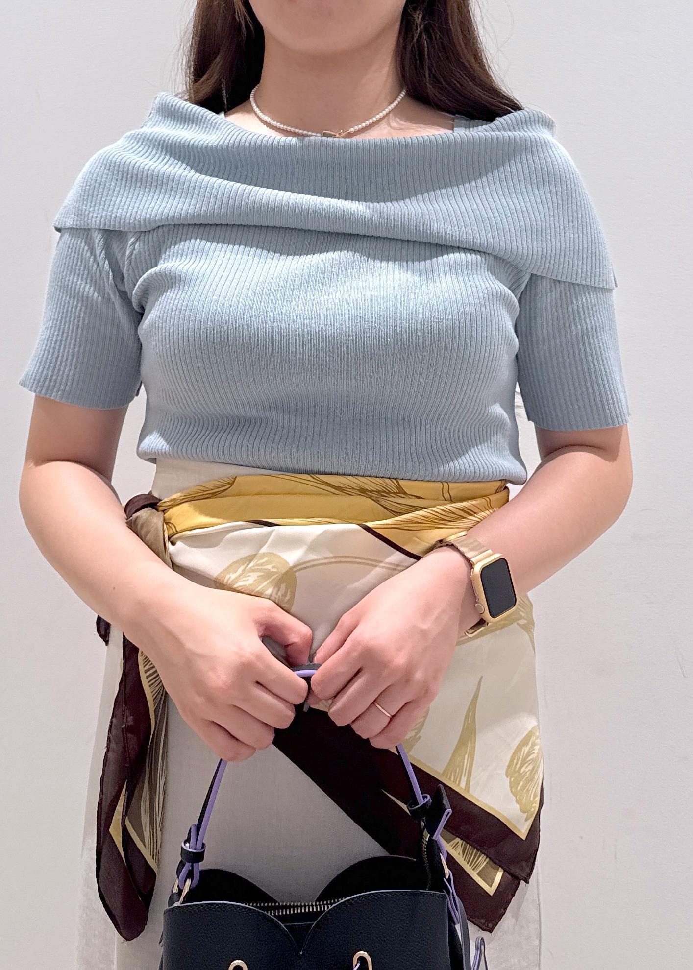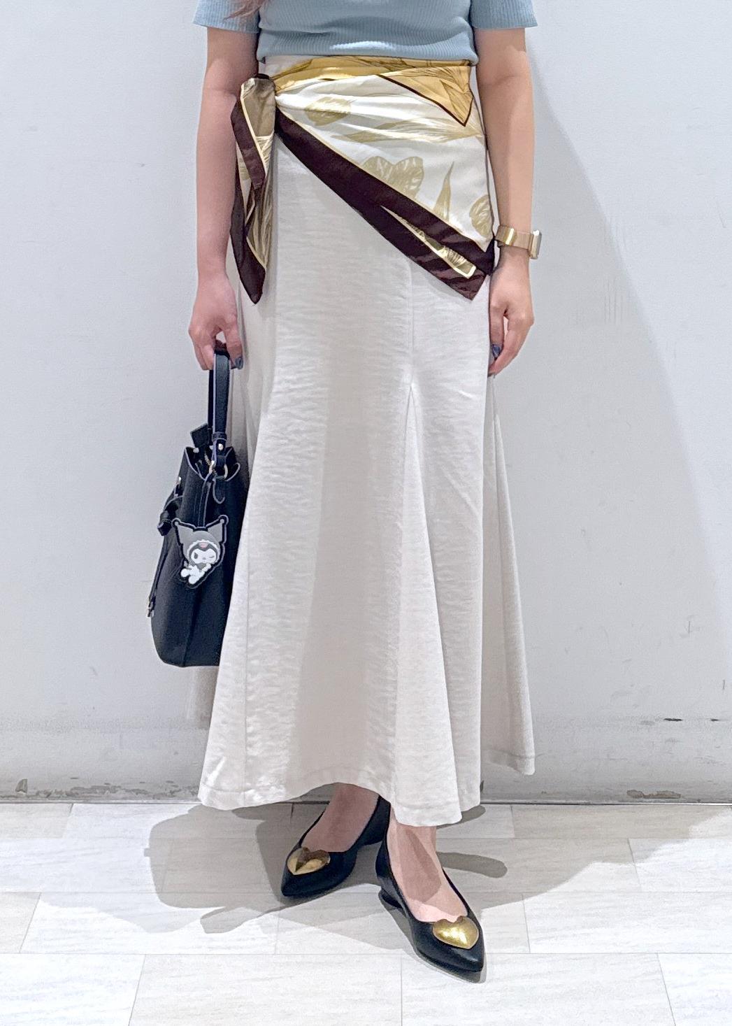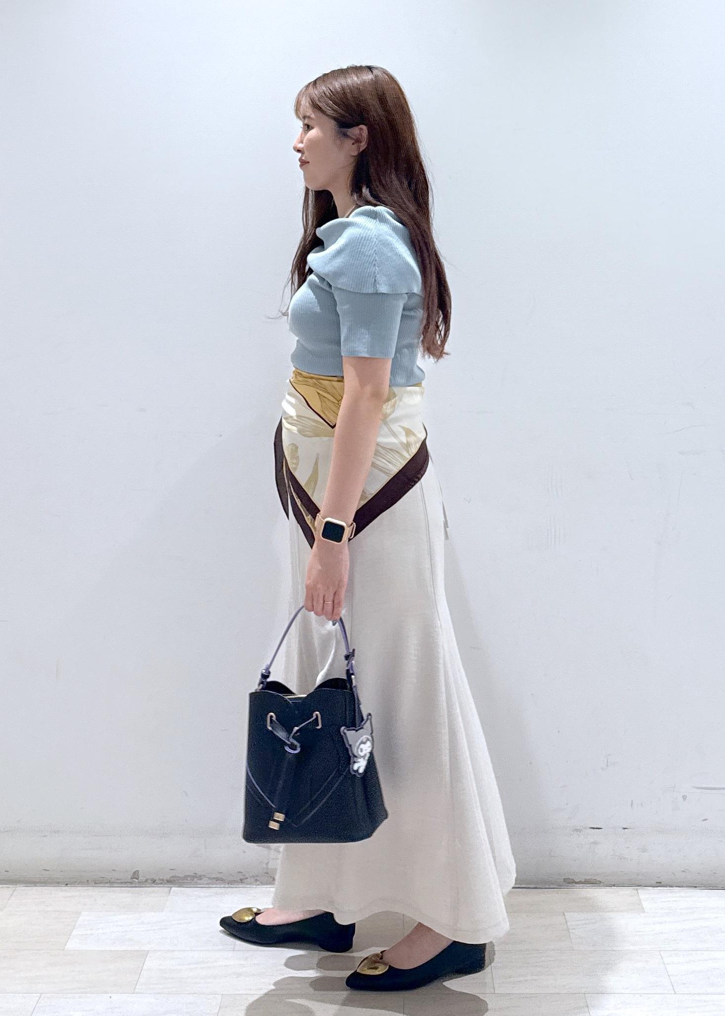 大人気なオフショルハーフスリーブニットに、美easyシリーズのマーメイドスカートと合わせてお仕事でも使える綺麗めなコーディネートにしてみました。スカーフをアレンジして腰に巻き、ちょっといつもと違った雰囲気に◎