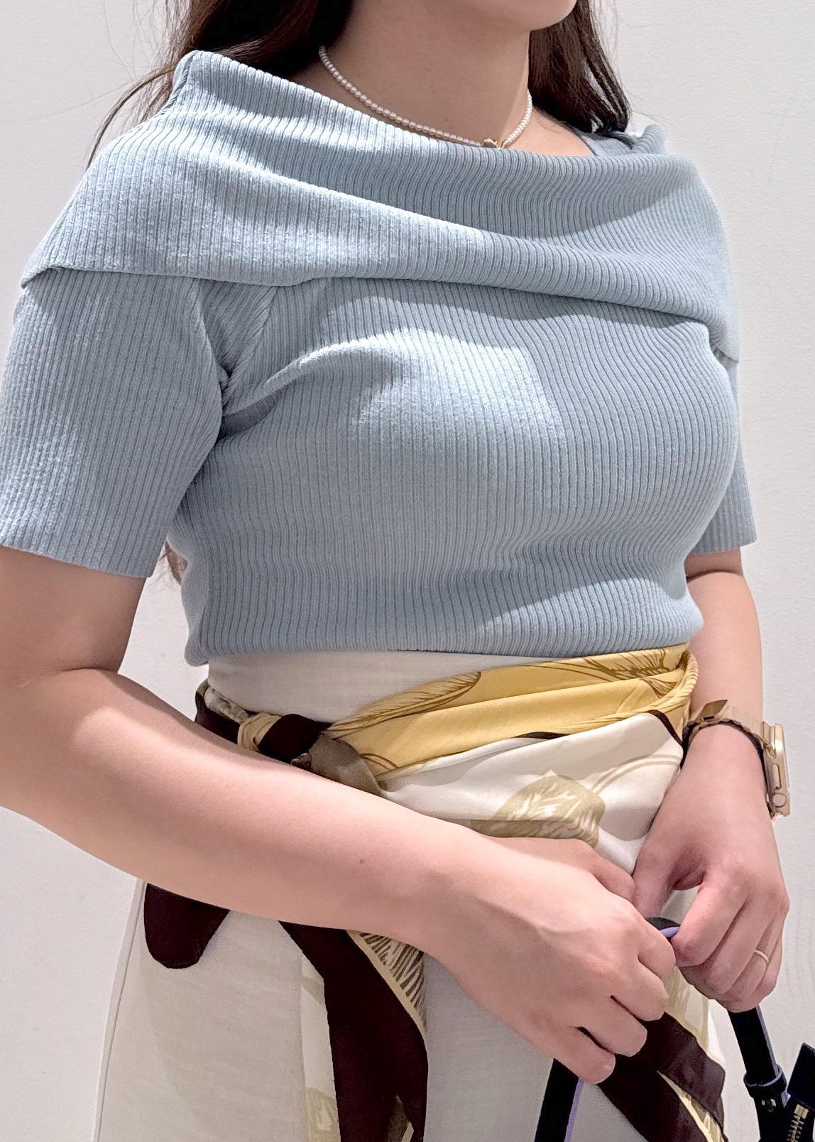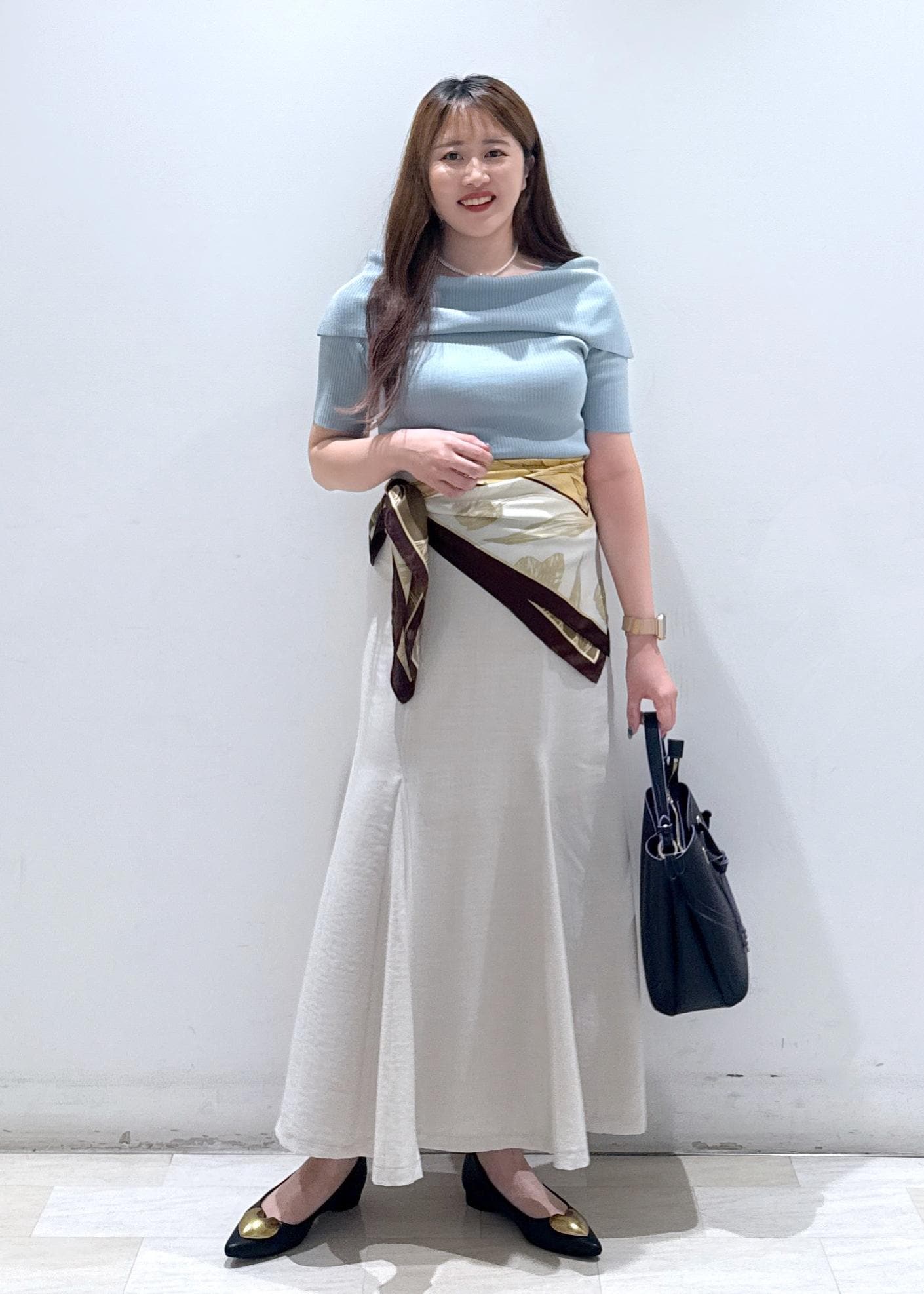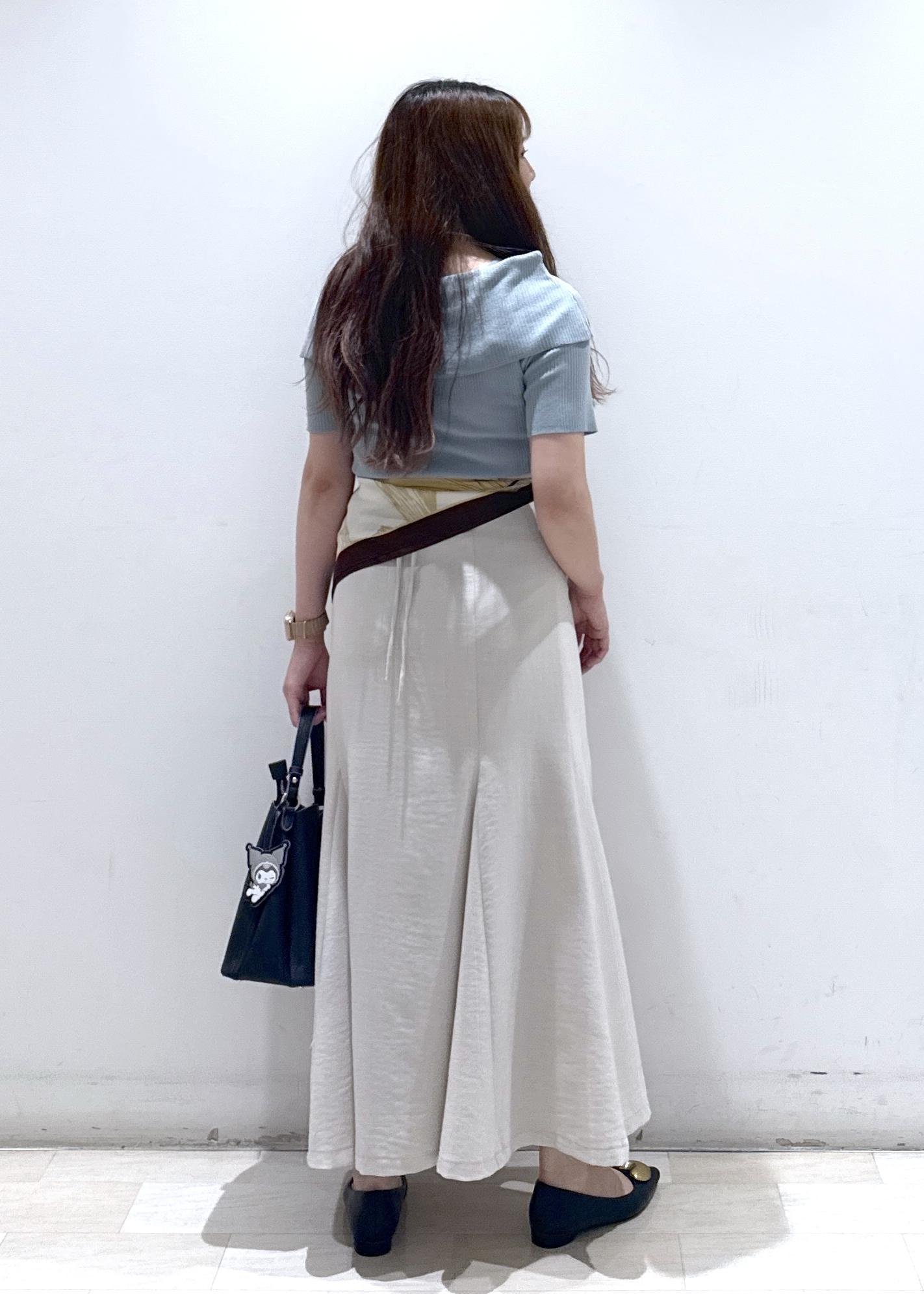 大人気なオフショルハーフスリーブニットに、美easyシリーズのマーメイドスカートと合わせてお仕事でも使える綺麗めなコーディネートにしてみました。スカーフをアレンジして腰に巻き、ちょっといつもと違った雰囲気に◎