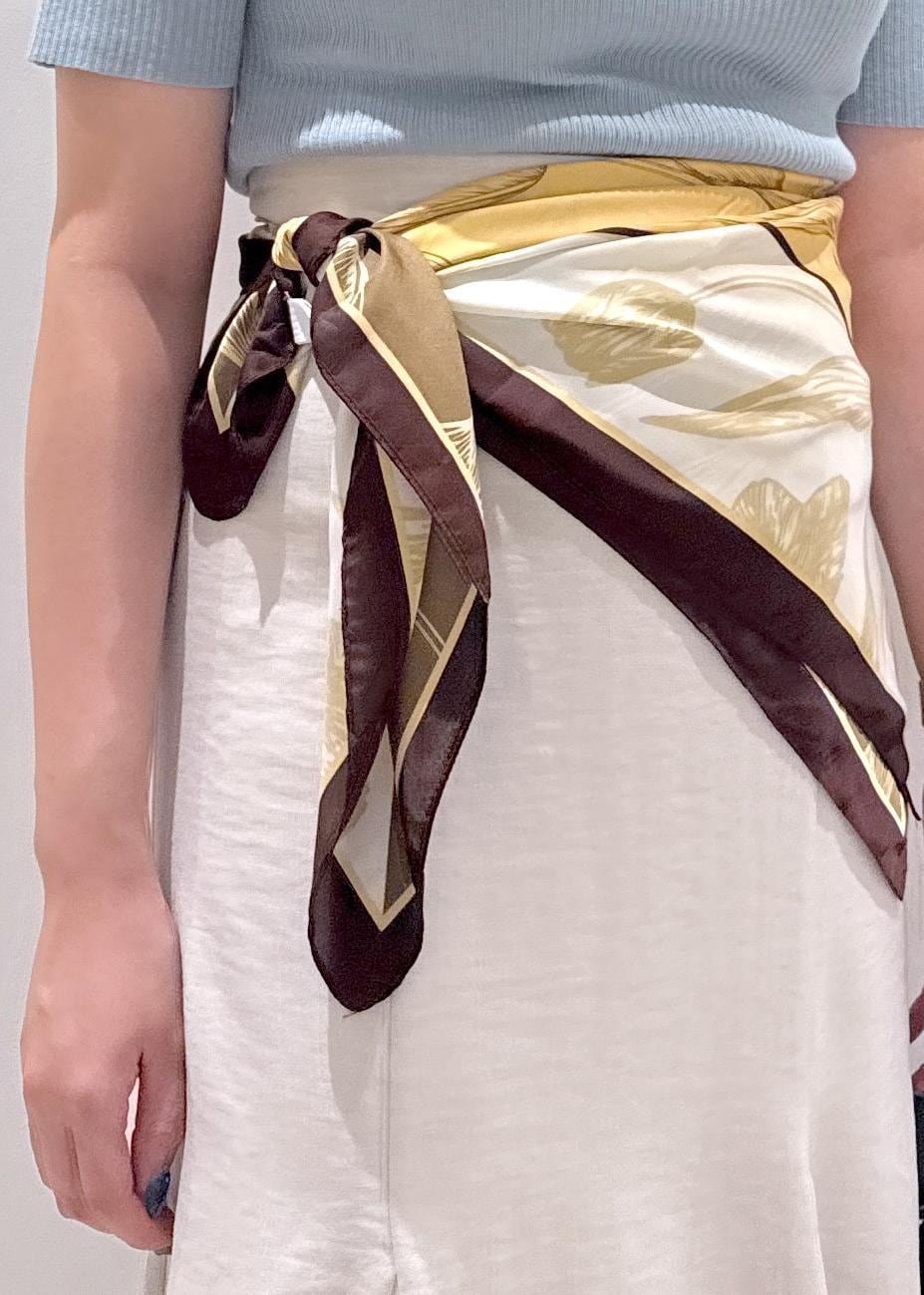 VISチューリップ柄スカーフ90×90cmブラウン系 / F¥2,189レビューポリエステル素材の正方形型の90cmのサイズになります。大判ストールスカーフになるので、腰や肩に巻いてもたっぷり余裕感が有り◎肌触りも柔らかくサラッとしているので巻きやすいです。チューリップ柄なので、綺麗目なコーディネートや甘いフェミニンにもに合いそうです。付けるだけでポイントになるので一枚持っておくとオススメですよ♪