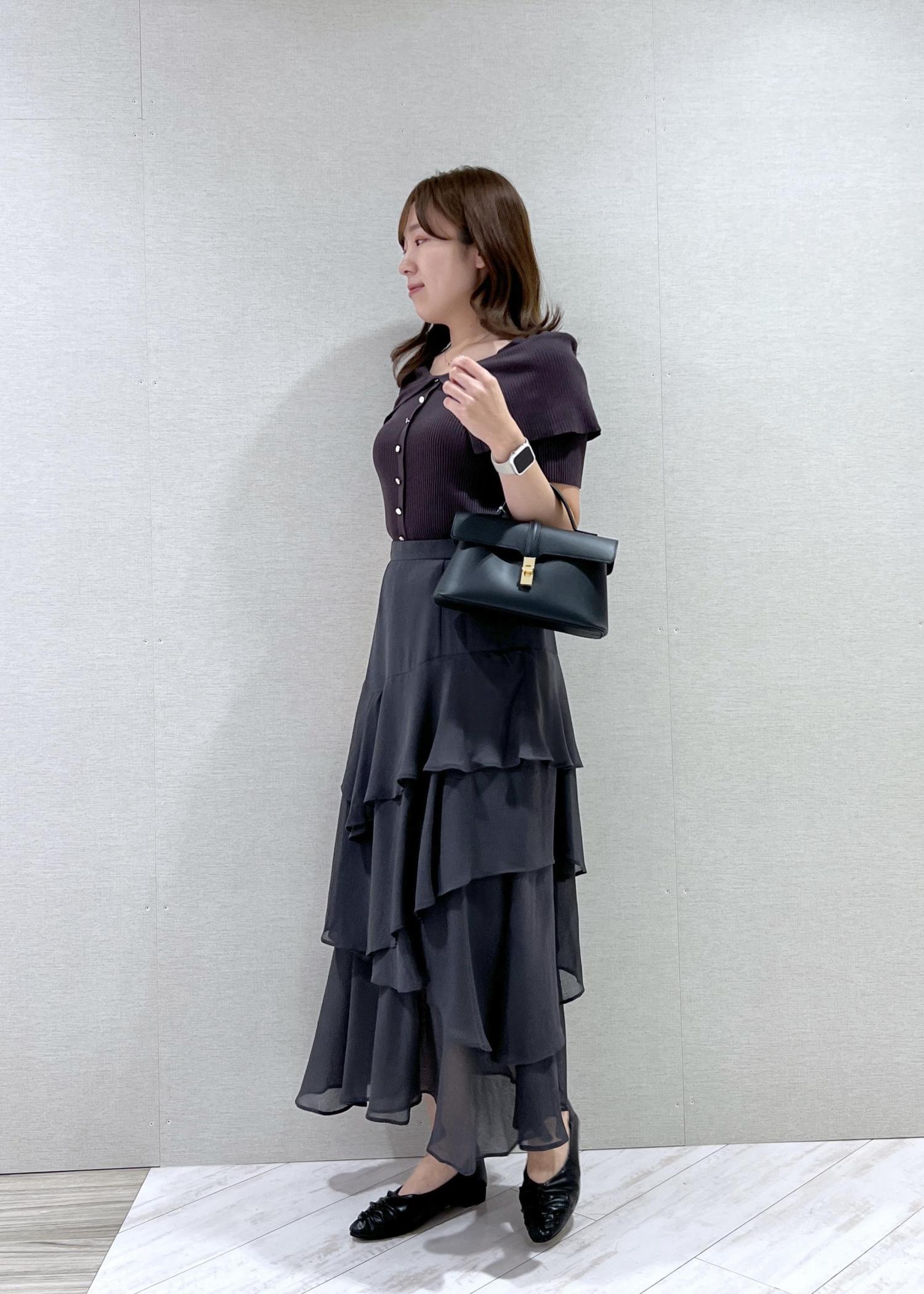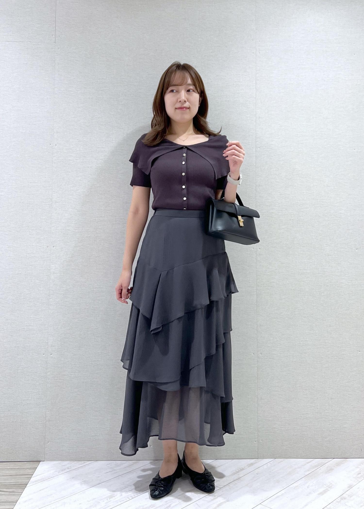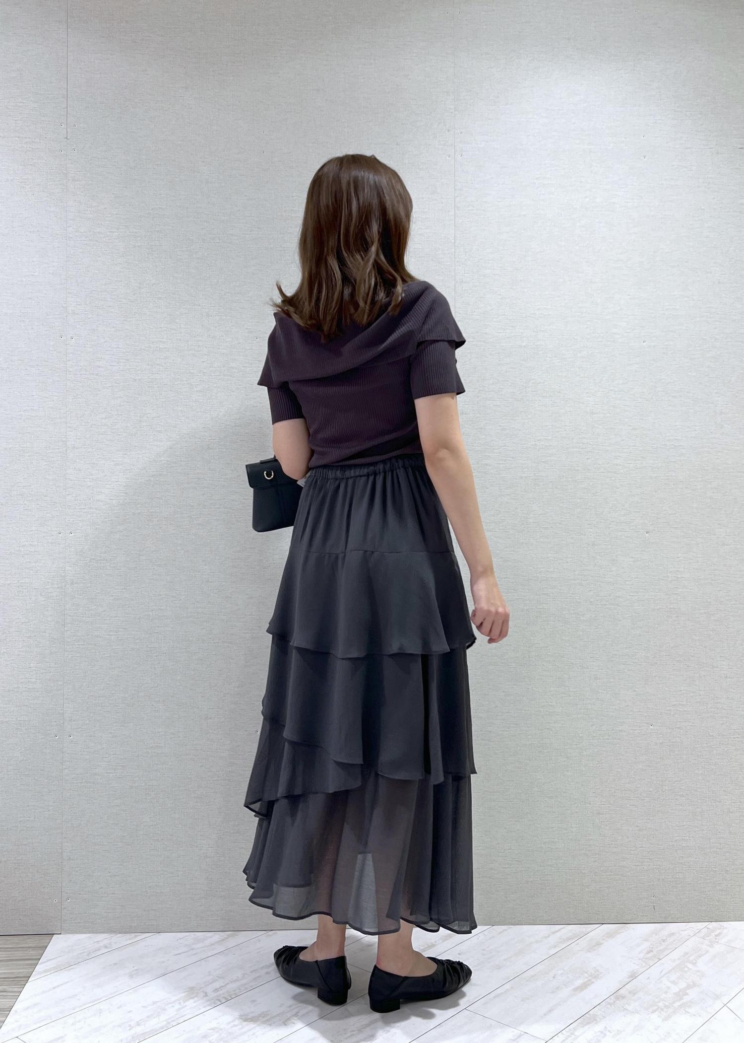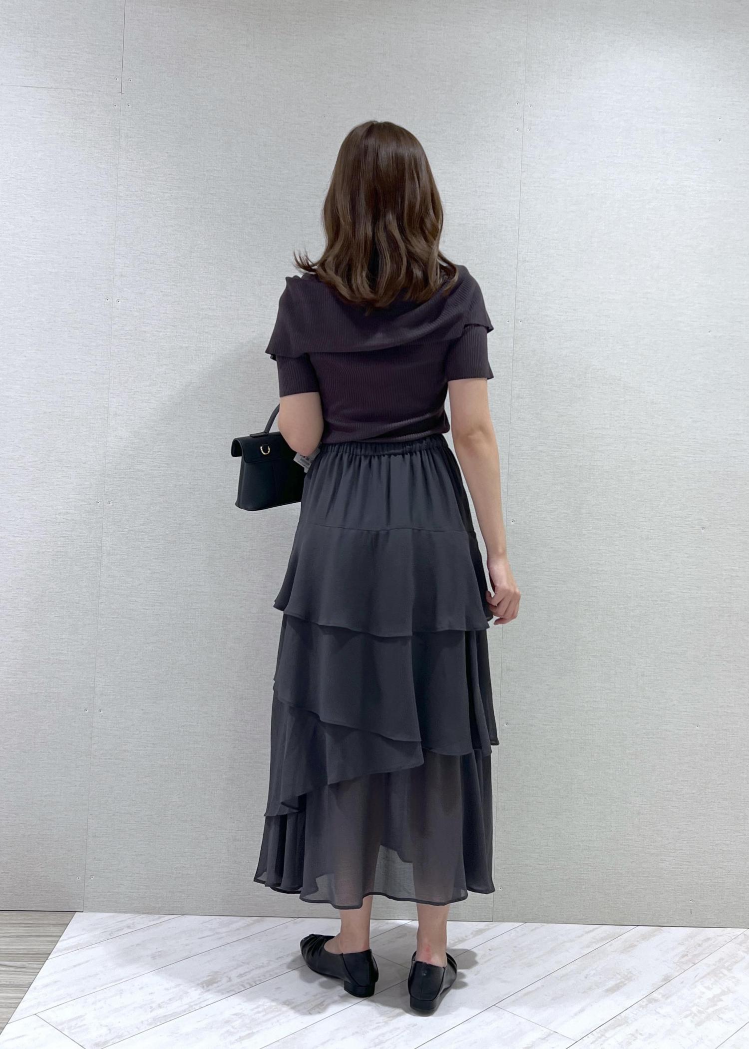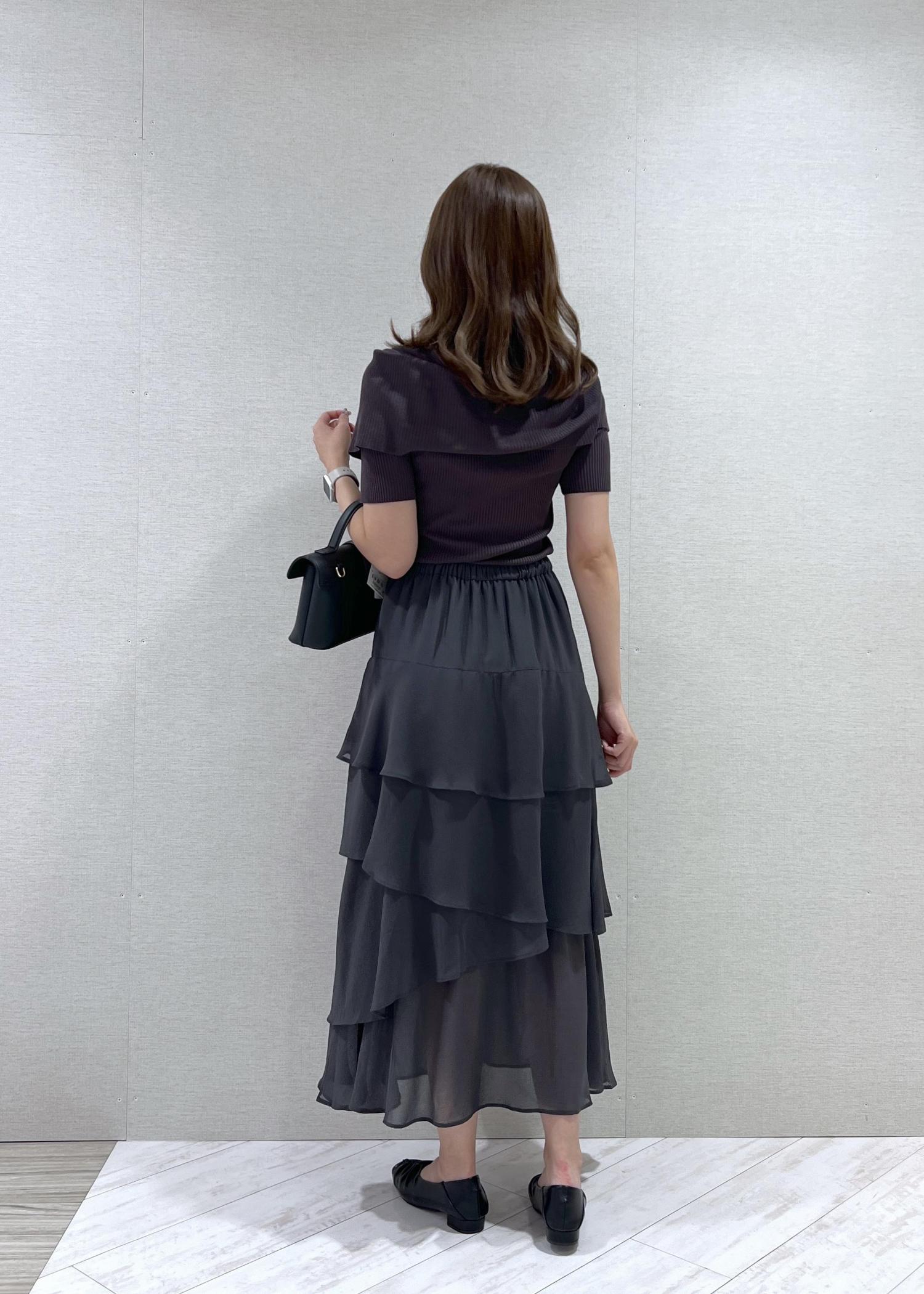 VIS花柄アソート楊柳ティアードスカートチャコール / F¥3,845レビューウエストはゴムですが、前にはギャザーがなくすっきり着られます!身長164cmでくるぶし上の着丈ですが、膝下に透け感があり重たくなりすぎないです◎