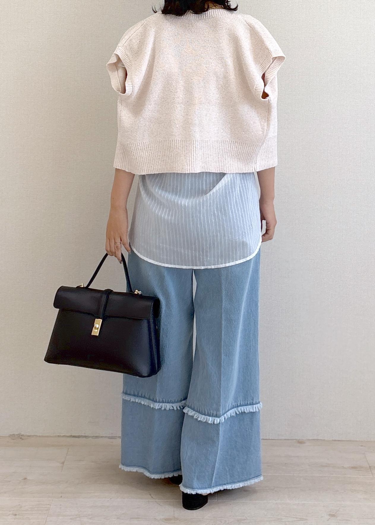 丈感は少し短めな印象ですが、裾にかけて広がりが大きくなり足元はかなりワイドになるので、たるみが無い方が綺麗かなと思います。くるぶしが隠れる程度の短め丈でも程よいカジュアル感はしっかりあるので問題なしです◎