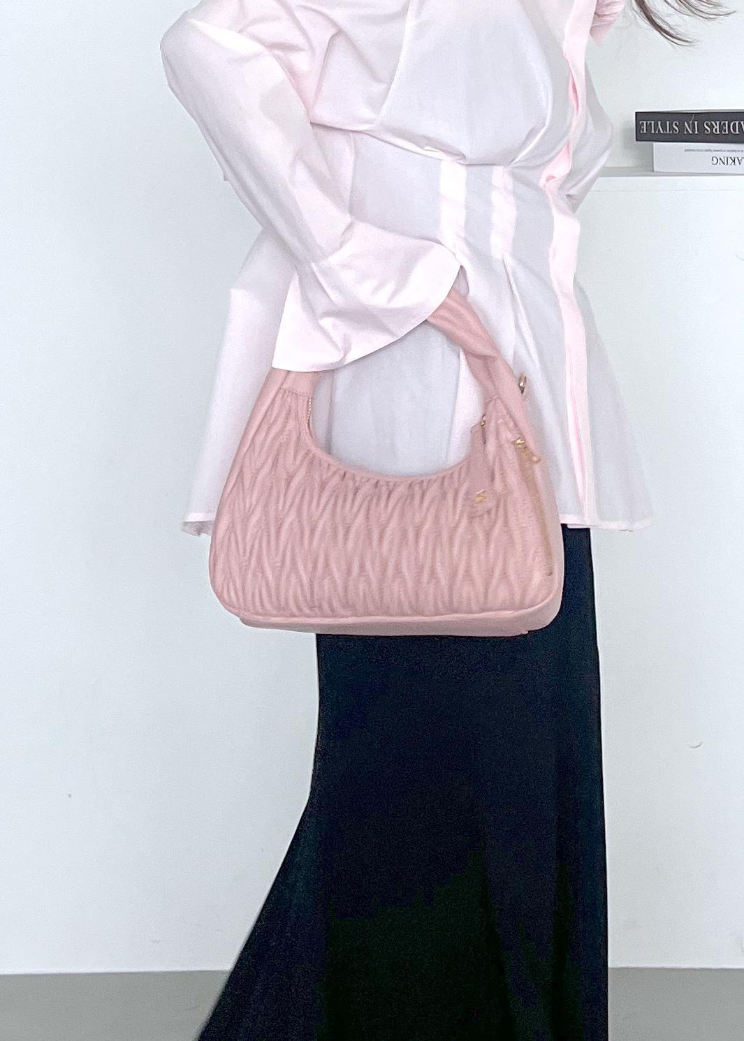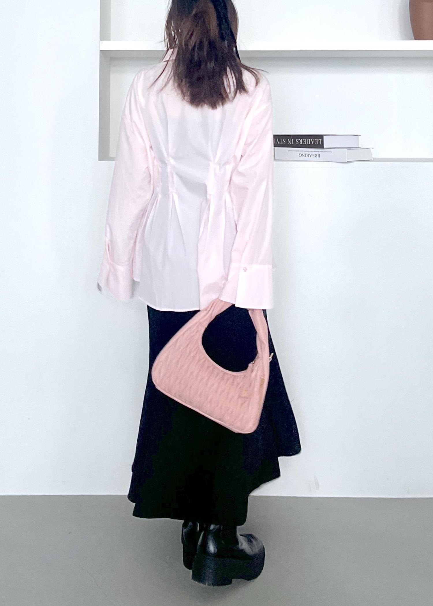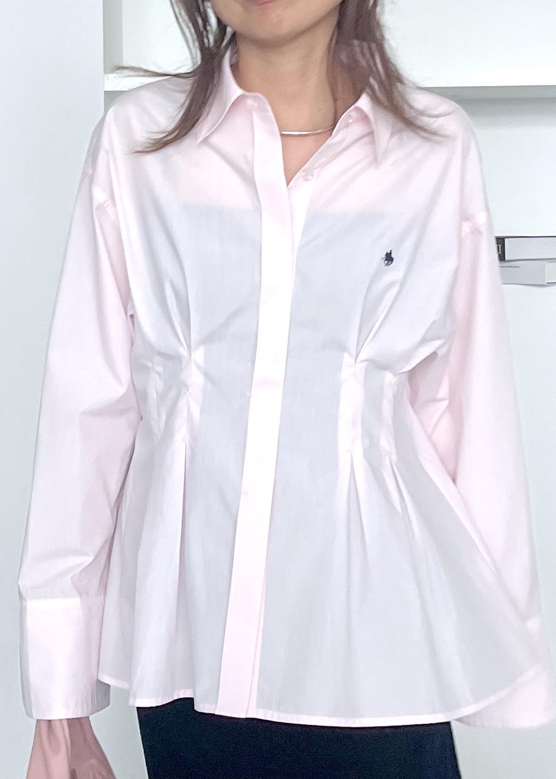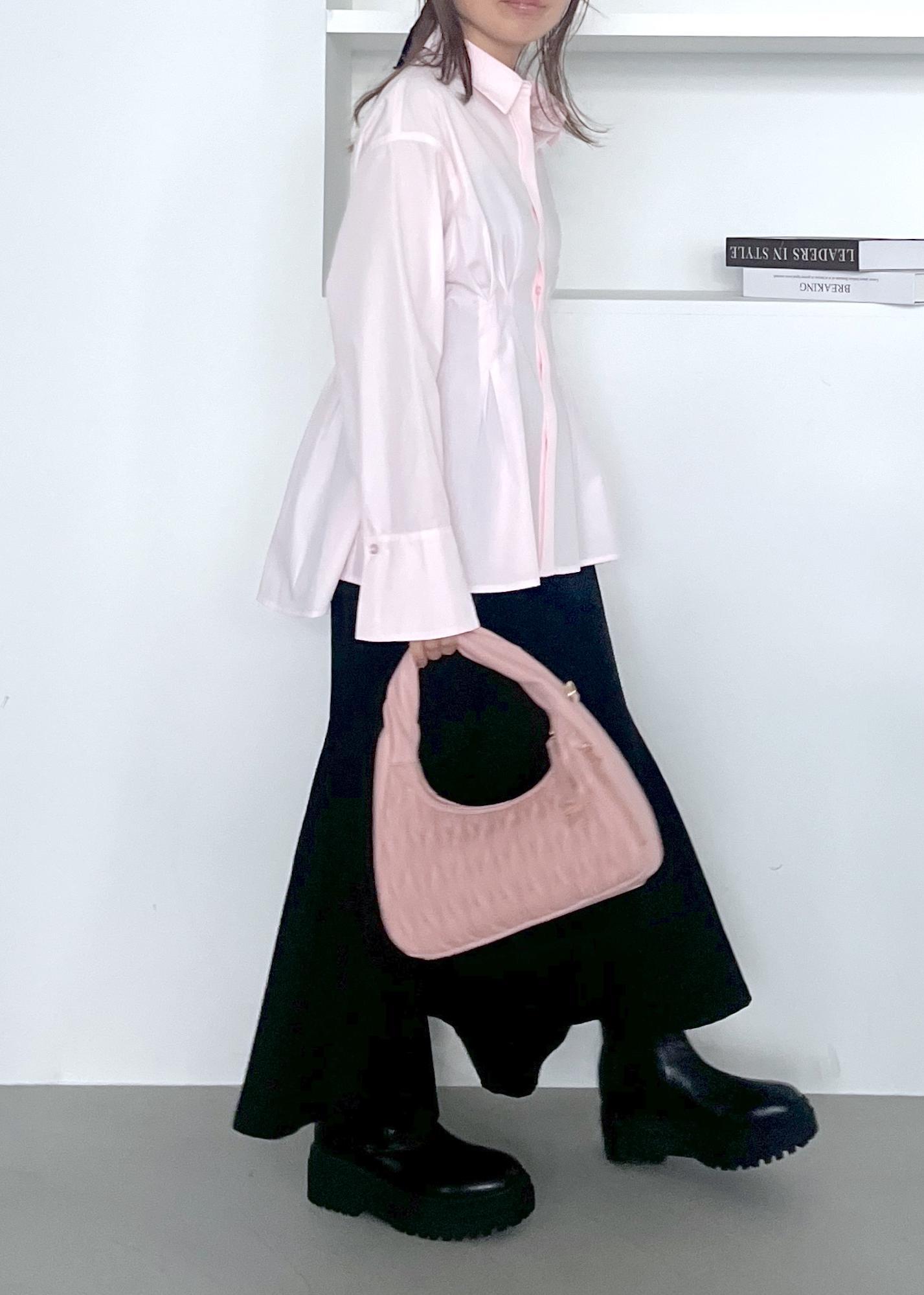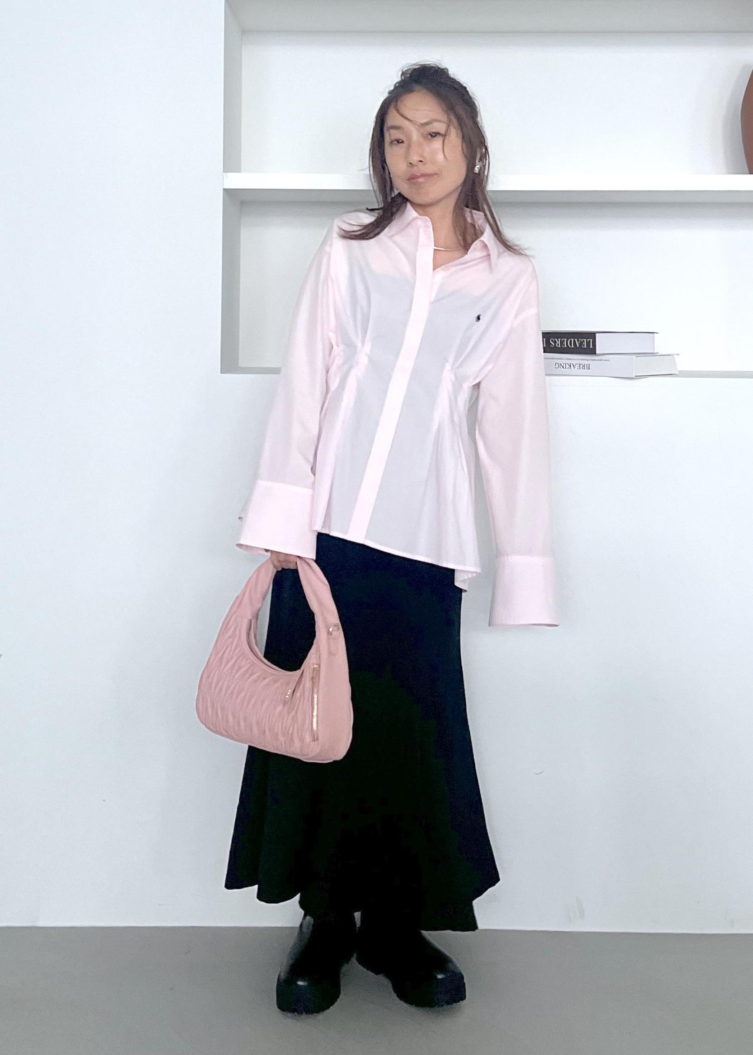 POLO BCS別注のピンクシャツは、ウエストをきゅっと見せてくれる立体シルエットが魅力。淡いカラーでも甘くなりすぎず、大人っぽく着こなせます。ブラックのマーメイドスカートやボリュームブーツで引き締めれば、甘辛バランスが絶妙なスタイリングに。さらにバッグも同系色で揃えれば、統一感のあるフェミニン×モードな仕上がりに。