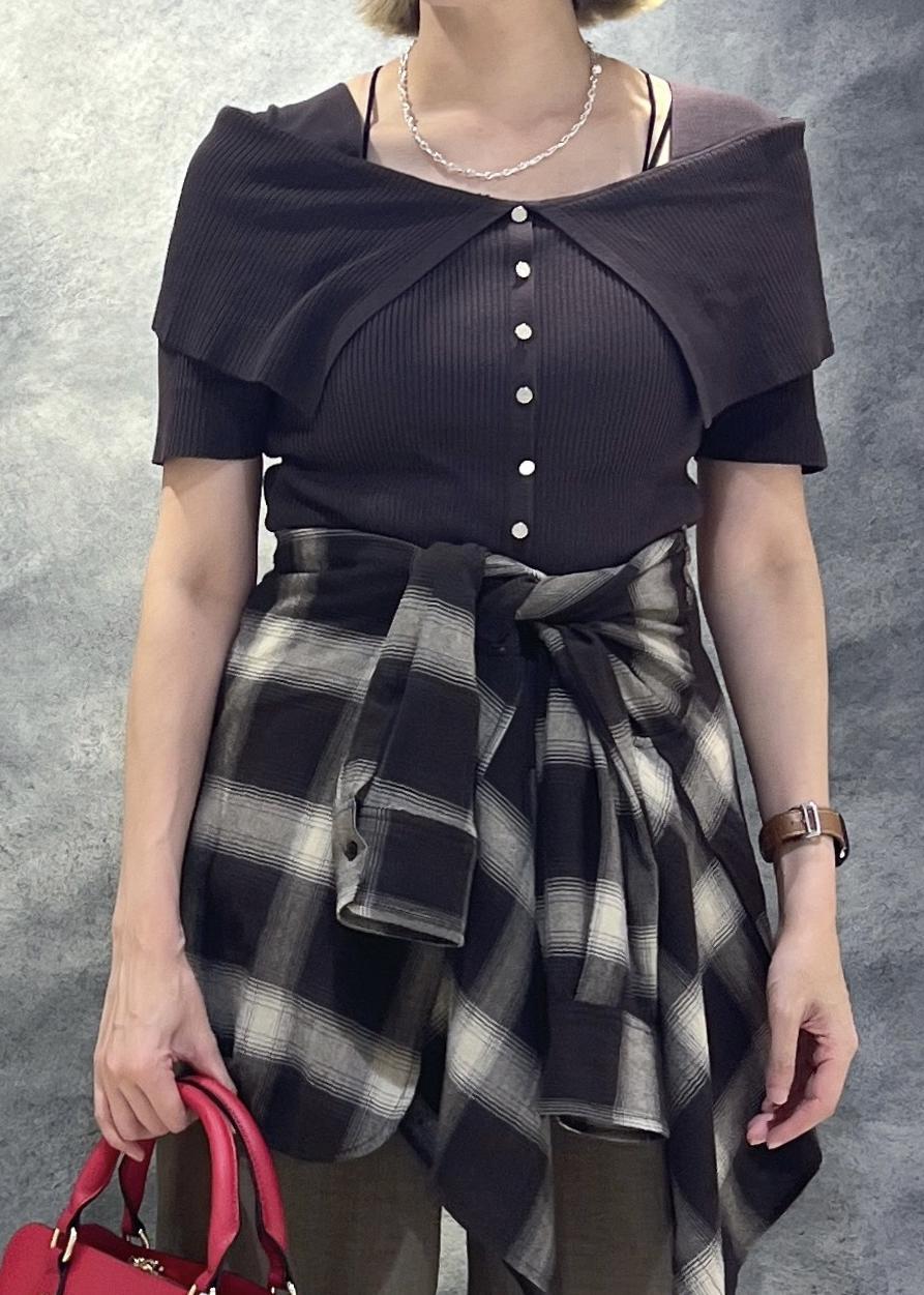 けどこのオフショルは襟がついててフロントにボタンが付いているのと素材感が薄手で伸縮性があるためスッキリ見せやすいんです。