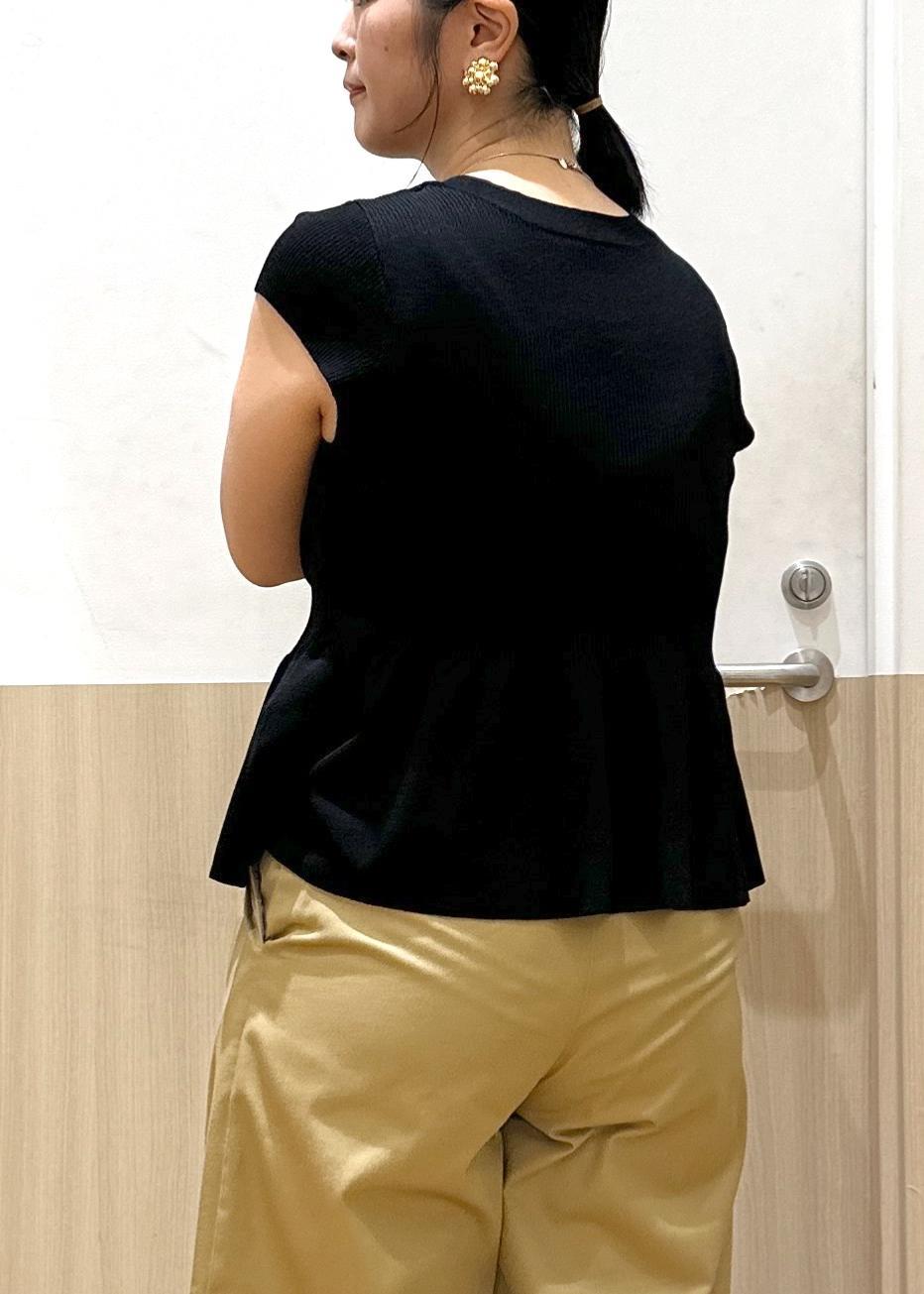 VIS【アンチピリング/洗える】美SMARTショートスリーブペプラムニットブラック / F¥5,489レビュー157センチ、骨格ウェーブヒップが半分近く隠れる着丈。