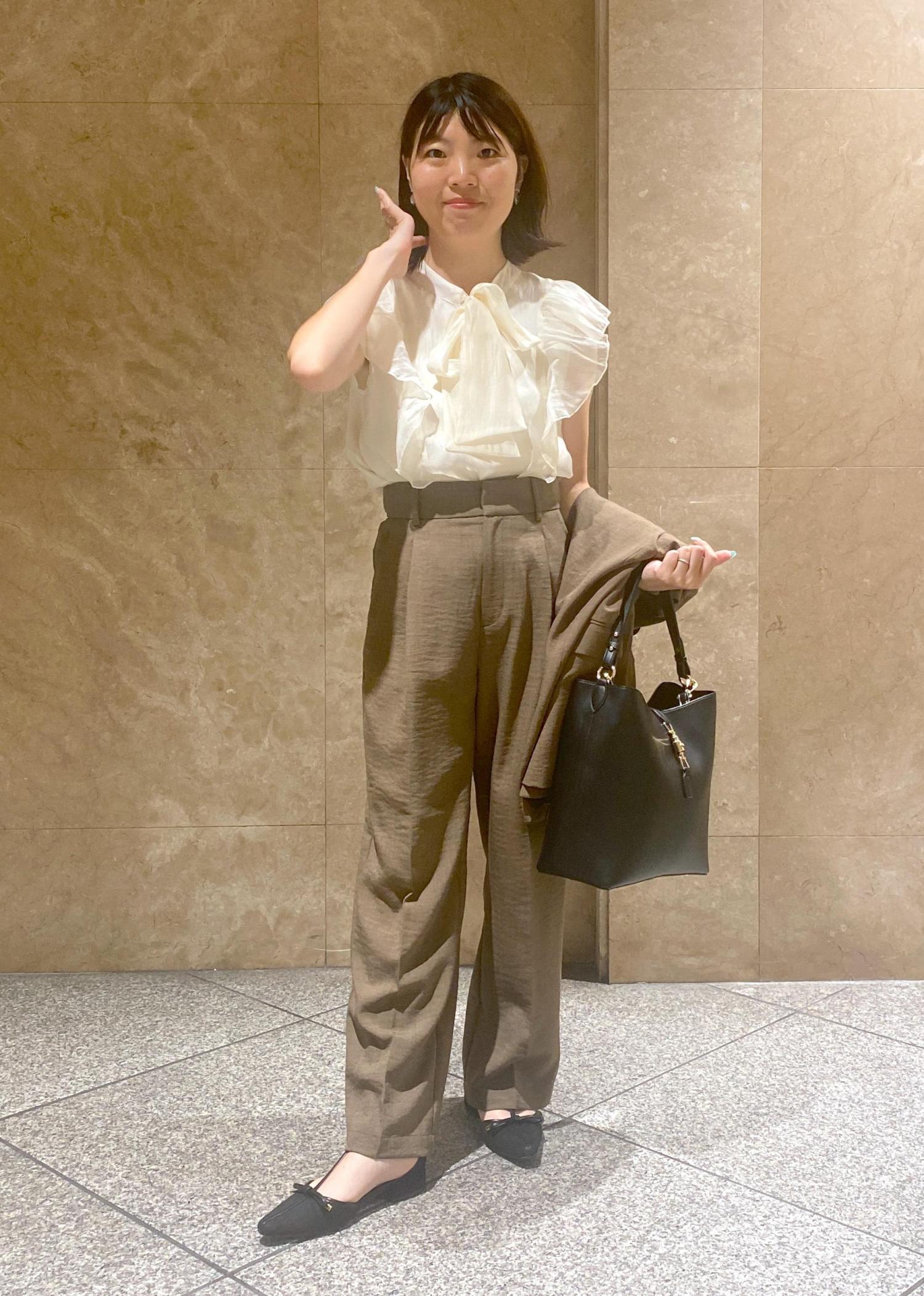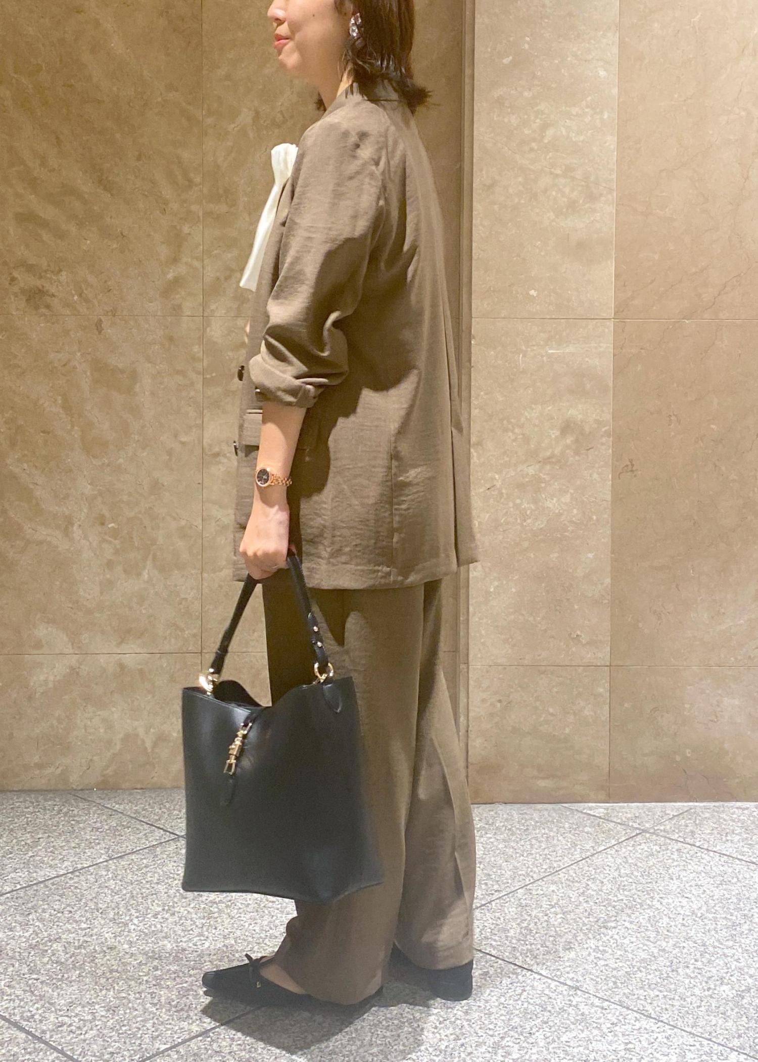 中のトップスはキレイめにノースリーブですがキナリで大人キレイめカジュアルに!!外は暑いけど通勤では少し寒いとなるとジャケット持っていればすぐに羽織れるのでとても便利ですよ◎小物は黒で閉めてみました!