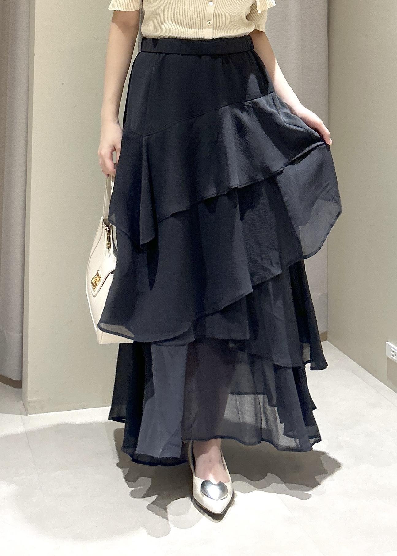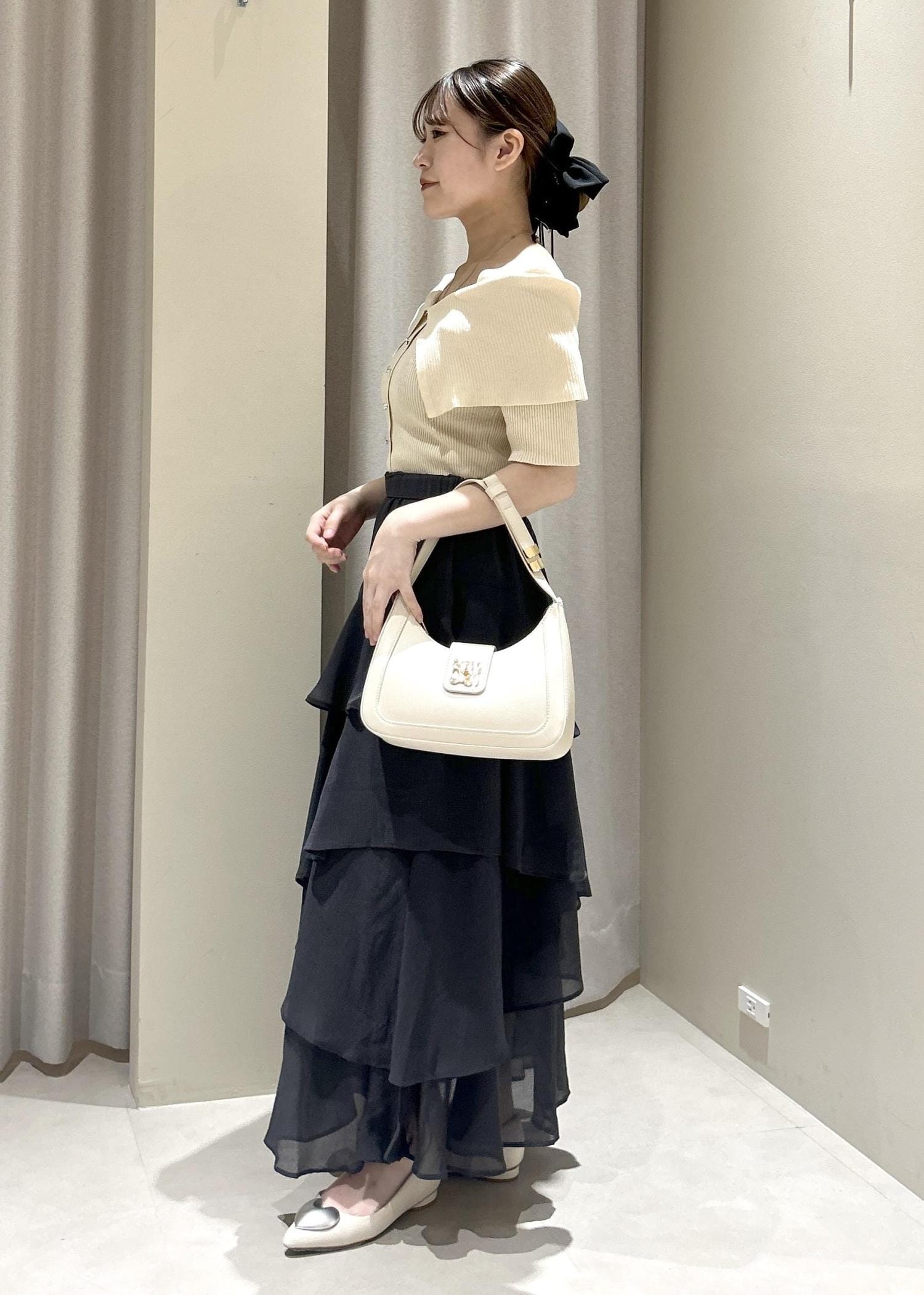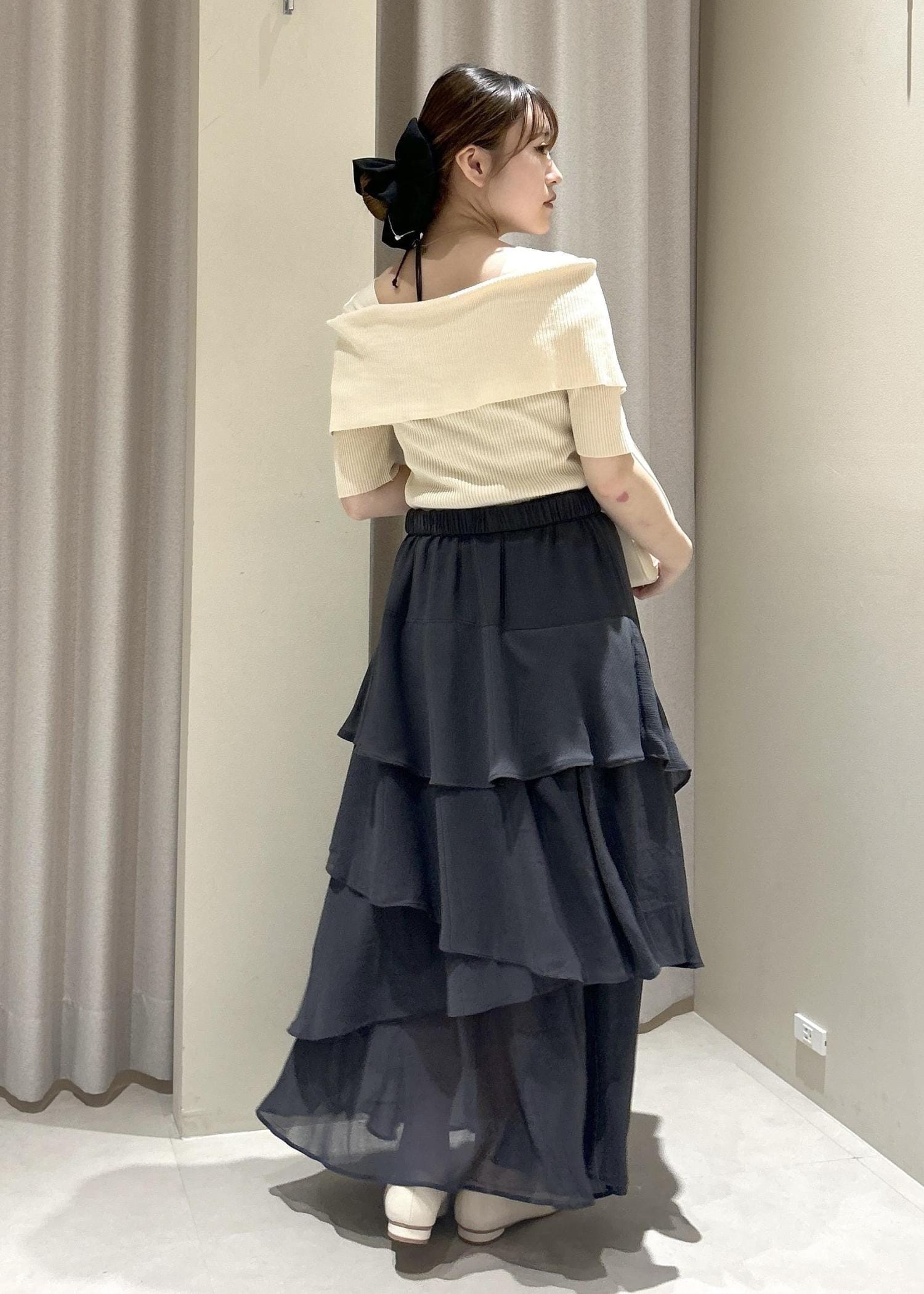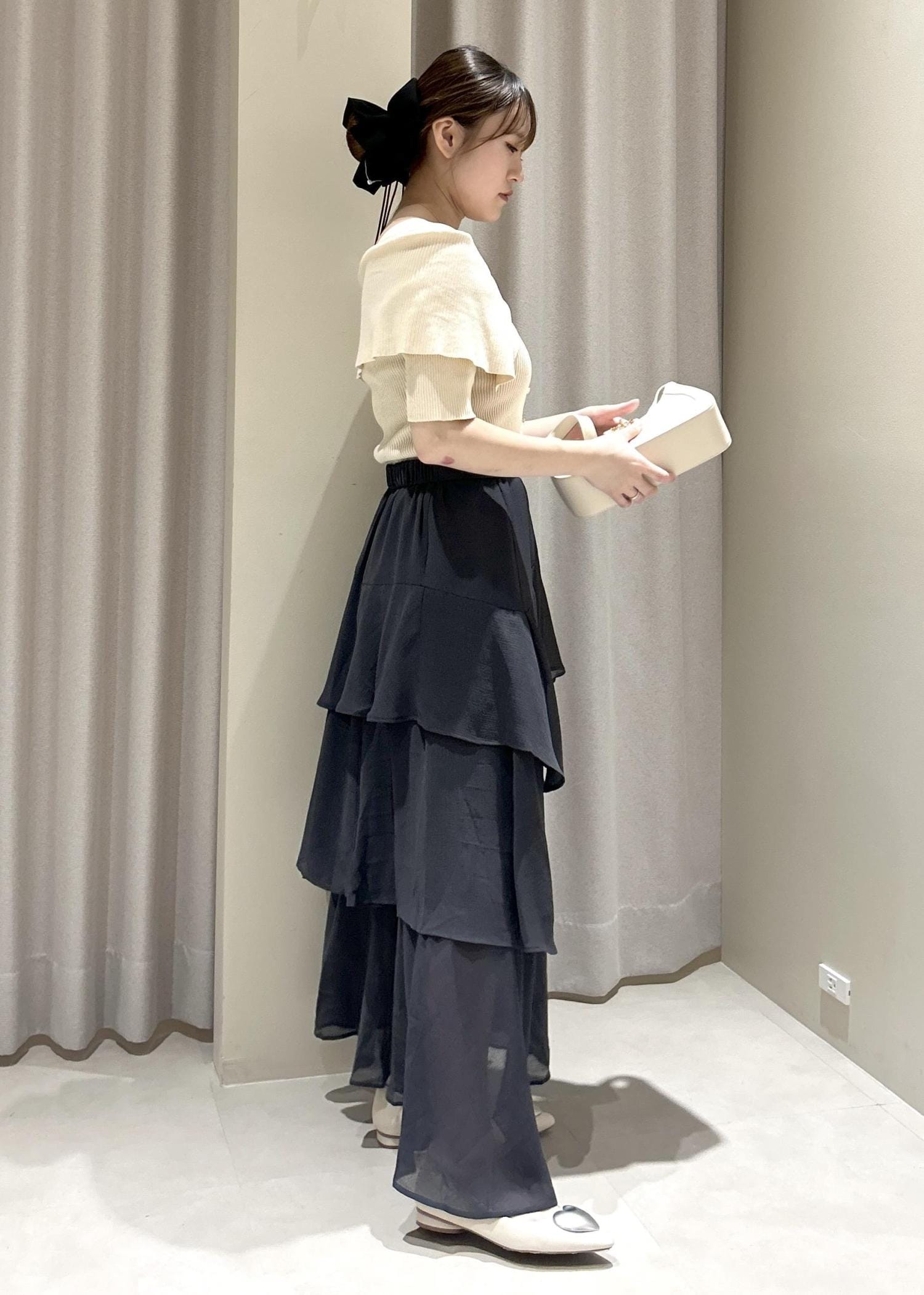 大きめの襟が可愛いオフショルニットはデニム合わせももちろん可愛いですが、私の推しはやっぱりスカート!