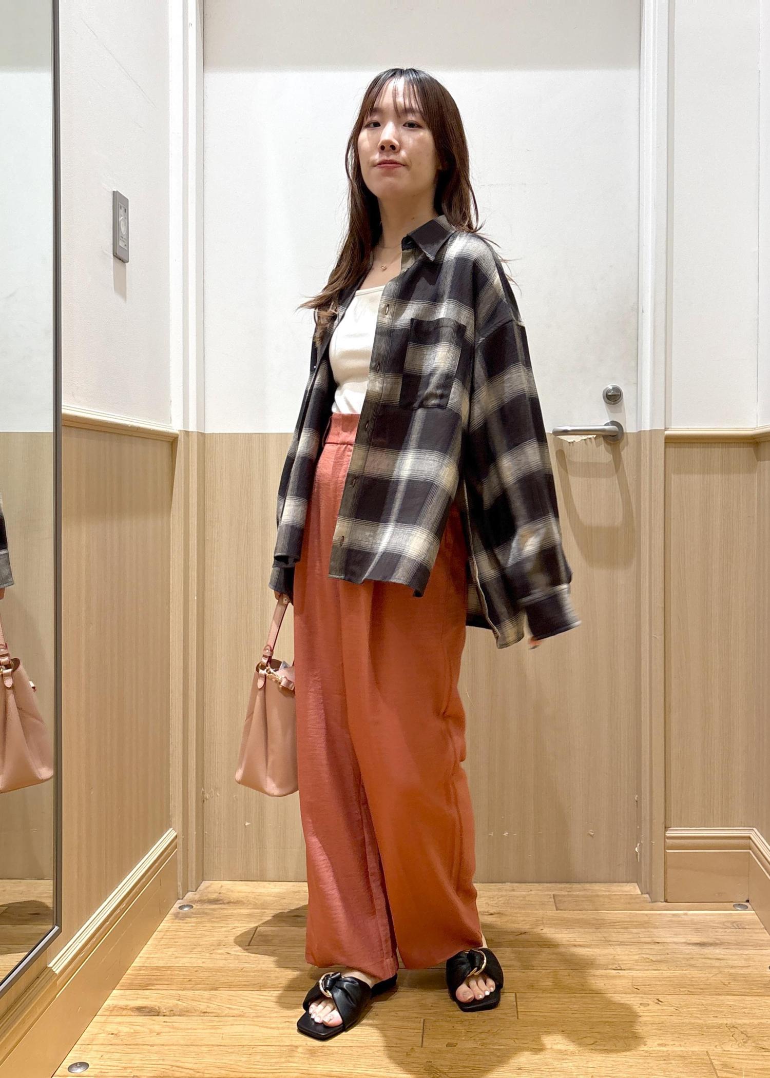 身長156cm、普段SサイズでこちらもSサイズ着用していますが、ウエストはニットをイン出来るくらいのゆとりあり。ヒールなしの靴だとギリギリ下につかない丈感です。