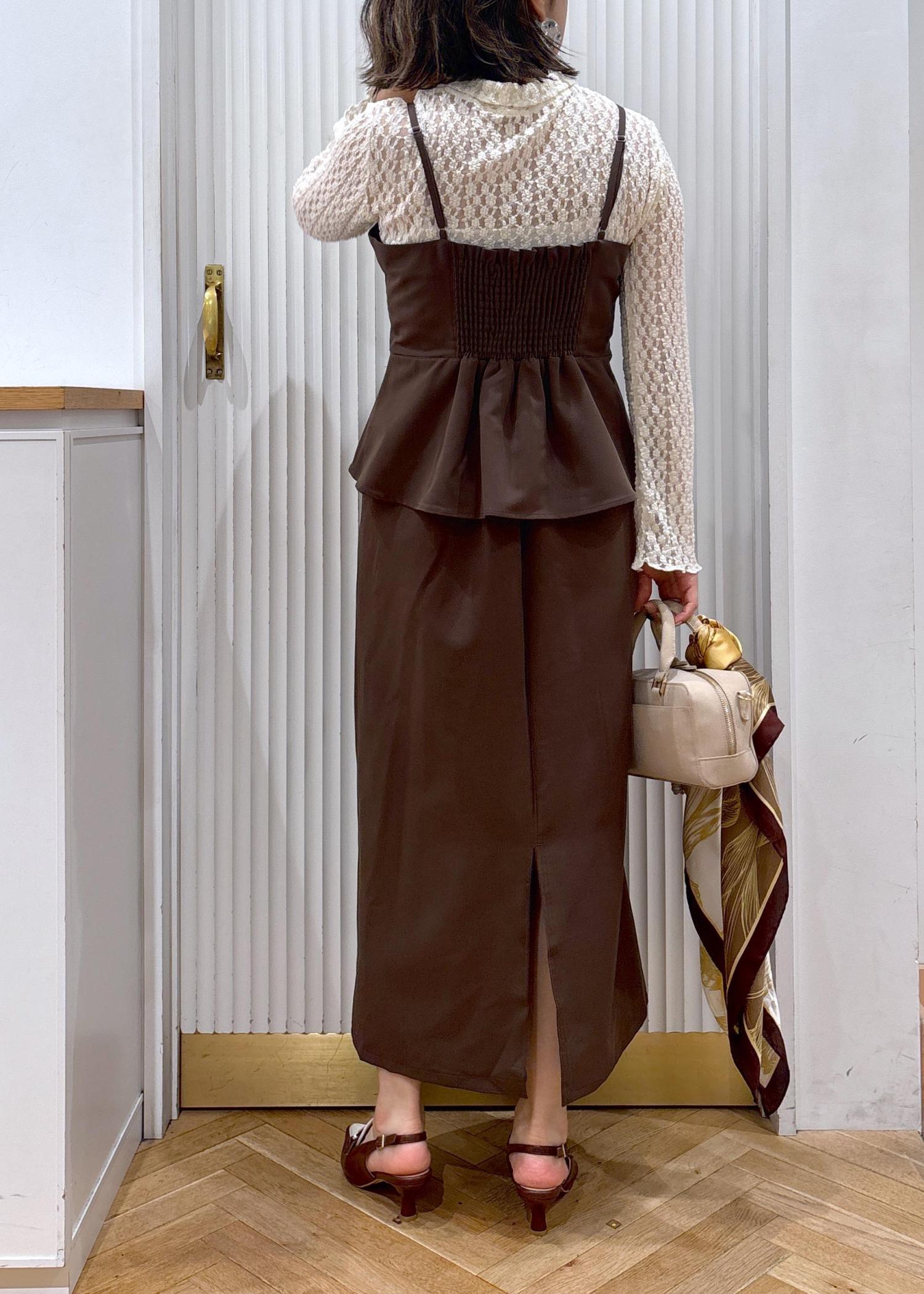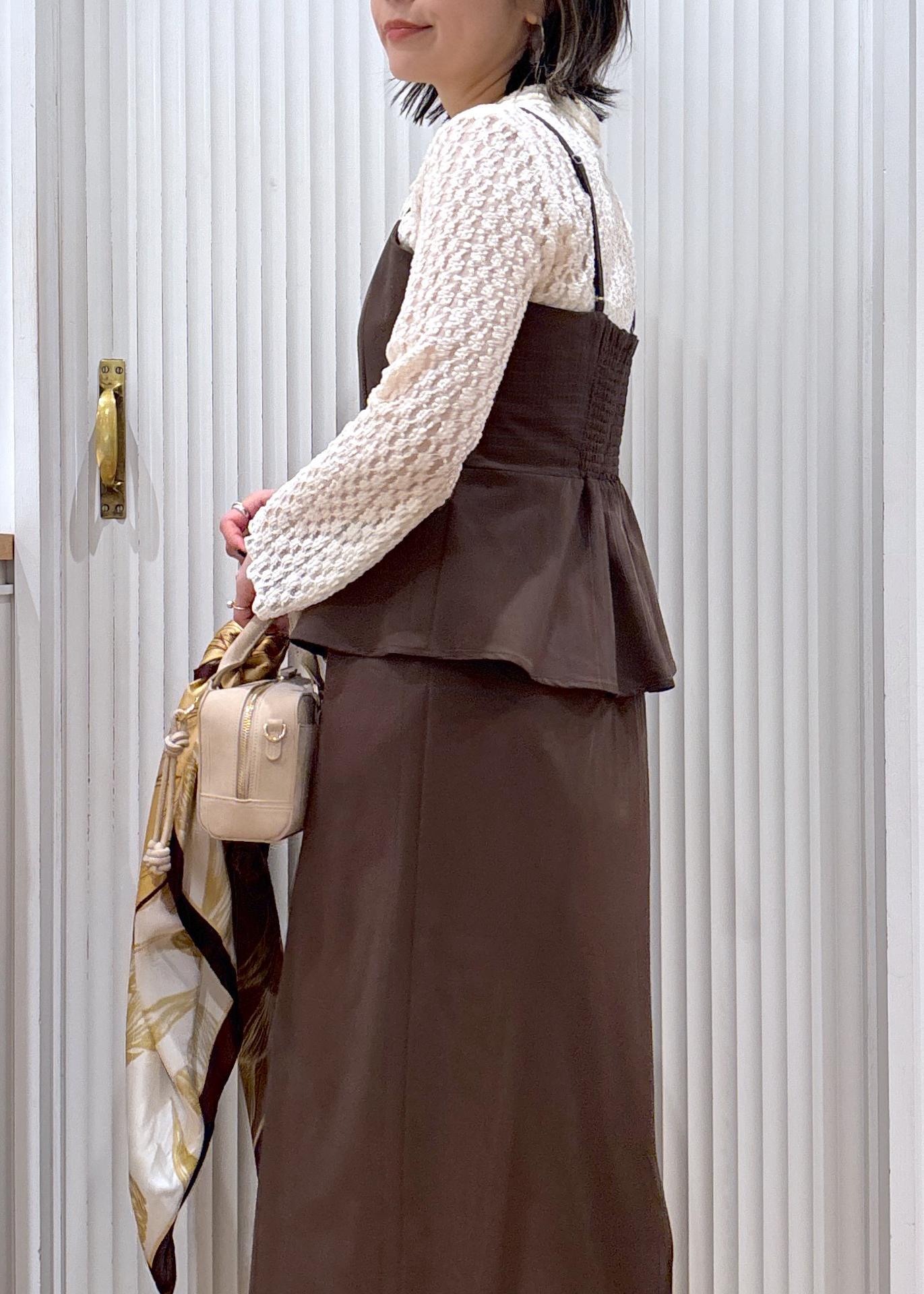 VISビスチェドッキングライクキャミワンピースダークブラウン系 / F¥7,689レビュー落ち感があり程よく厚みのある素材。きちんと見えする表面感の生地で上品さがあり、パーティやお食事にもピッタリ!肩紐は長さ調整が出来ます。身体のラインを拾わないので腰まわりやお腹まわりも気にせず着られ、ポケット付きの優秀ワンピースです。ボウタイブラウスやレースインナー、シンプルなカットソーなどをレイヤードするのがお勧め。