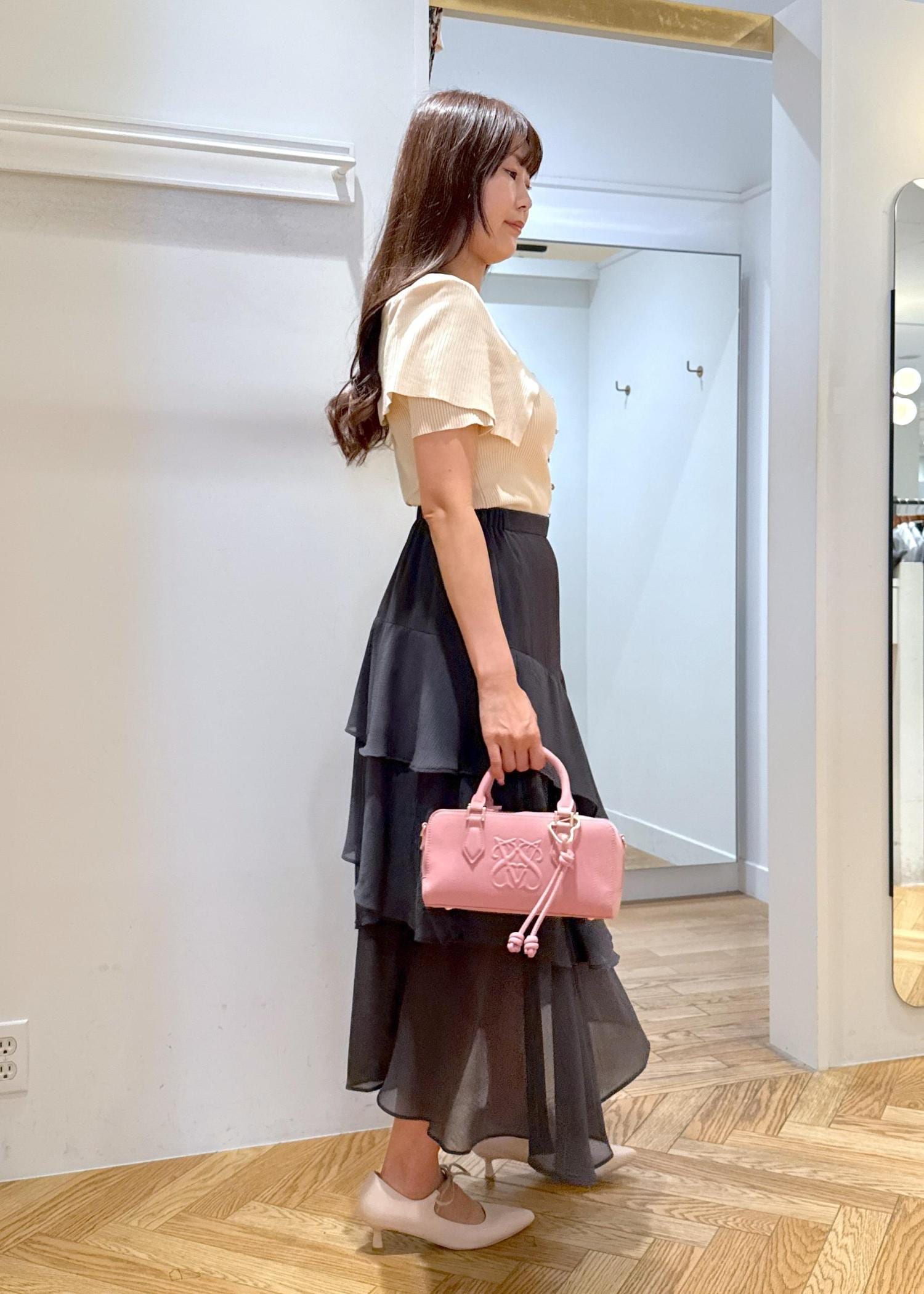 トレンドのオフショルニットにティアードスカートを合わせて大人きれいめコーデに仕上げました。
