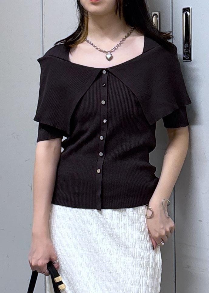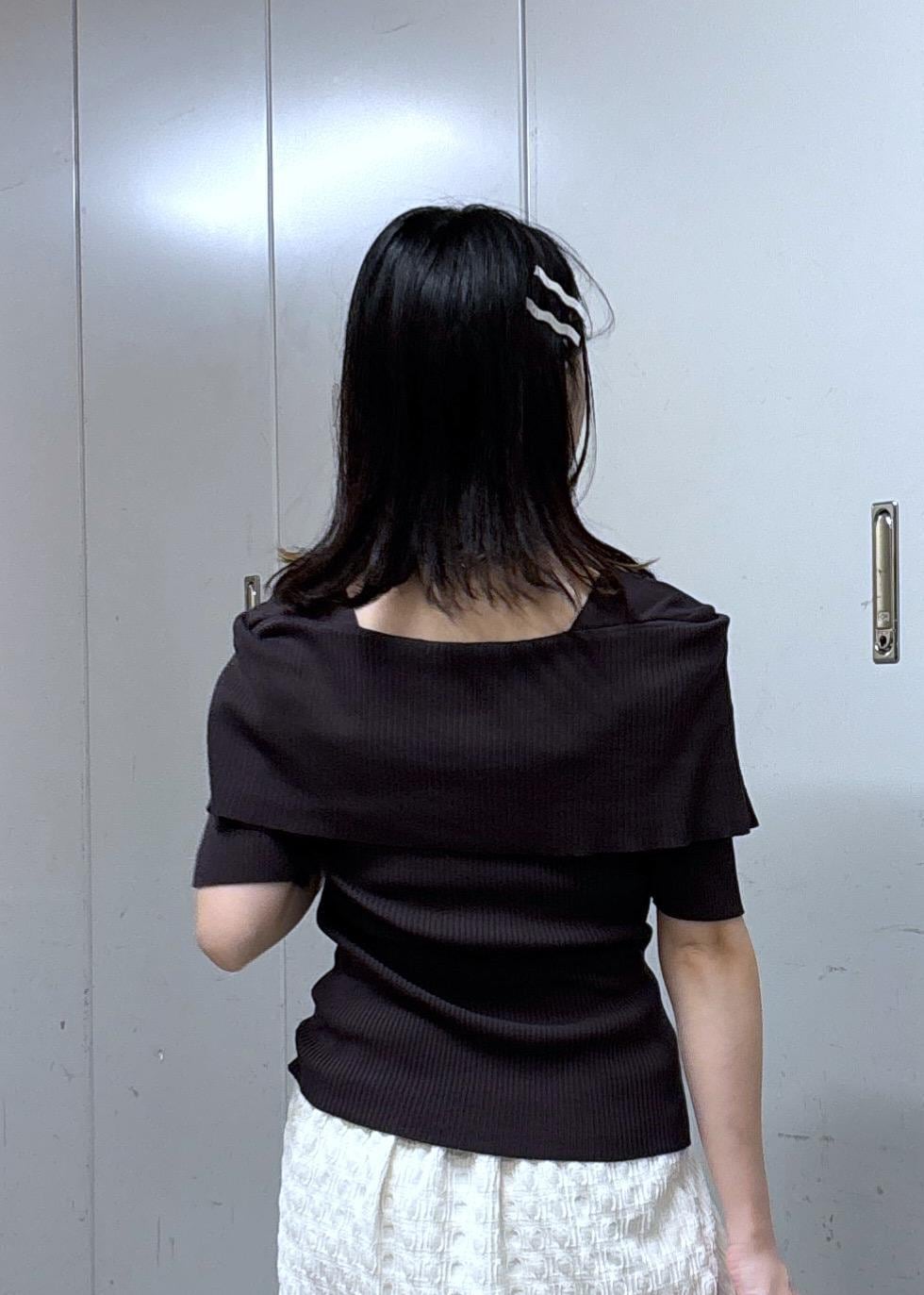 大きな襟がポイントで小顔効果があり、テロっとした素材感なので肩が張ることは無さそうです。