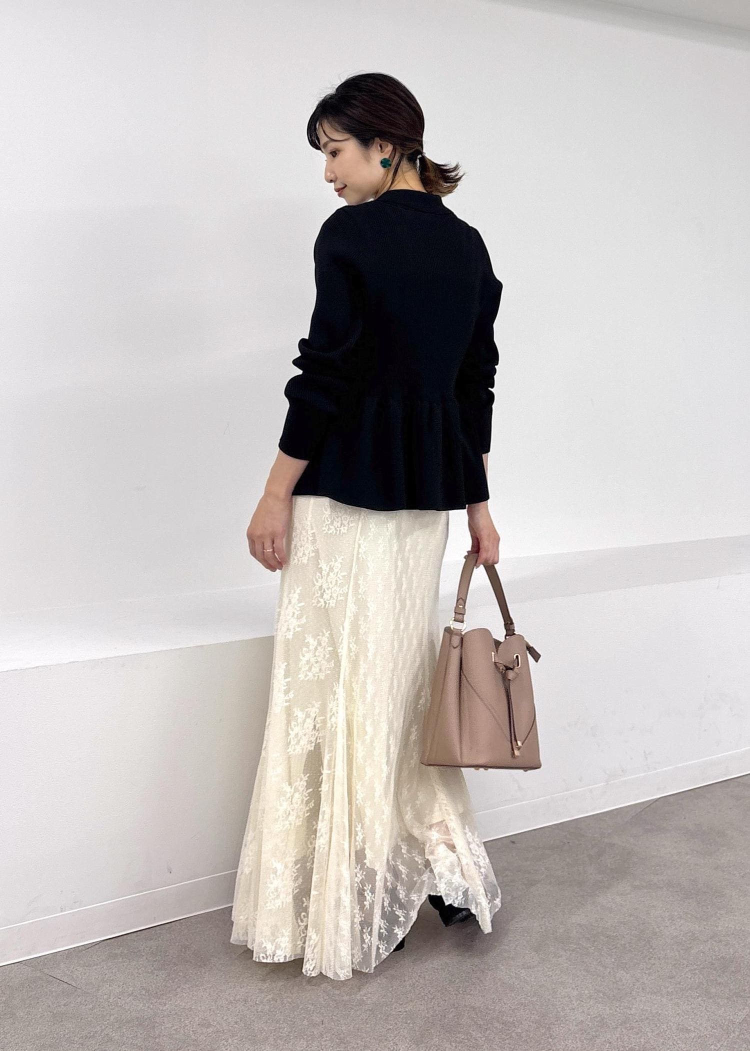 大人気のペプラムカーディガン、秋服バージョンです♪カーディガンは柔らかモチモチ素材で着心地がよく、チクチク感を感じないので気温の難しいまたぎの季節にもピッタリ◎レーススカートと新色ミルクティーチョコのハートバックで女性らしい印象にまとめました。秋にオススメの大人カジュアルコーデ。