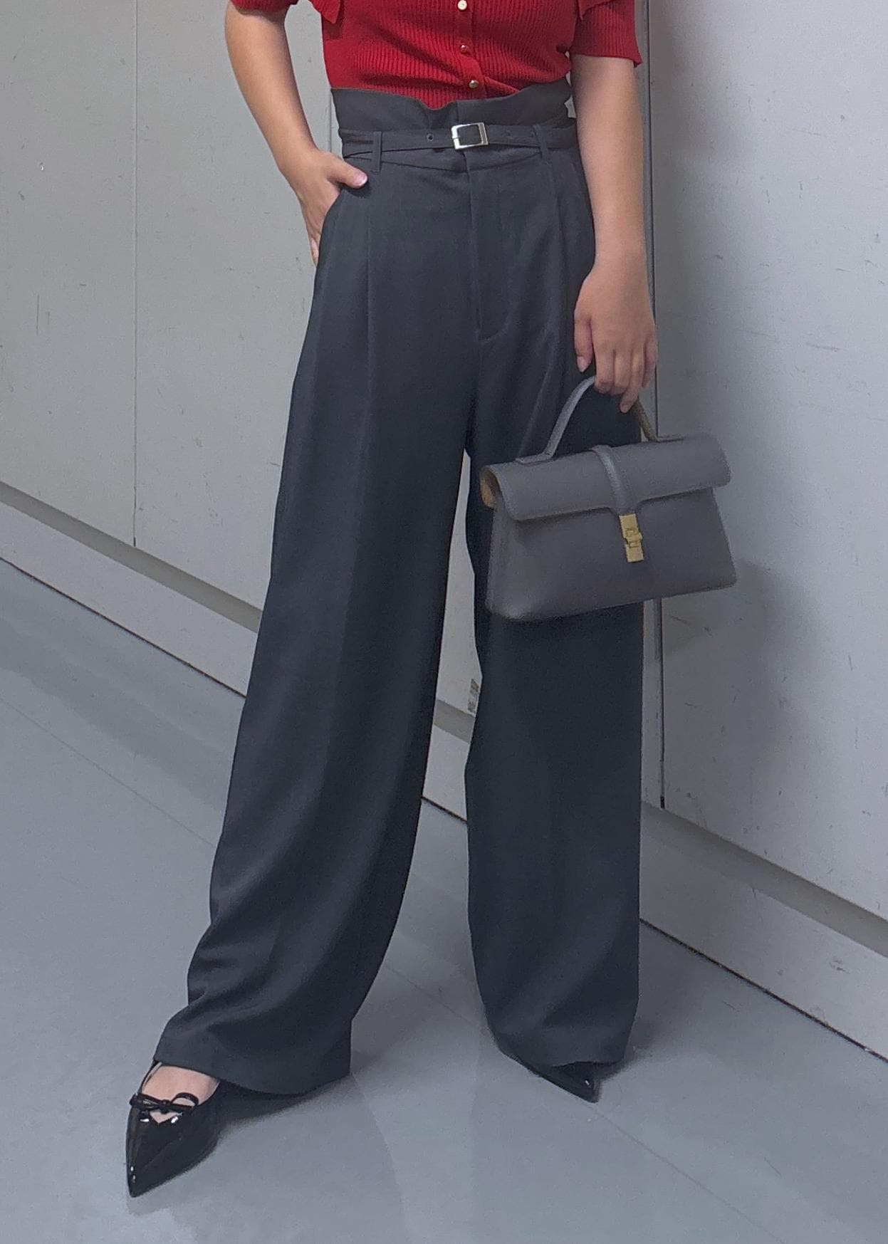 VIS【新色追加】【防シワ/接触冷感】ベルトディテールタックワイドスラックスパンツチャコール / S¥6,589レビュー153cmでSサイズを着用しました。