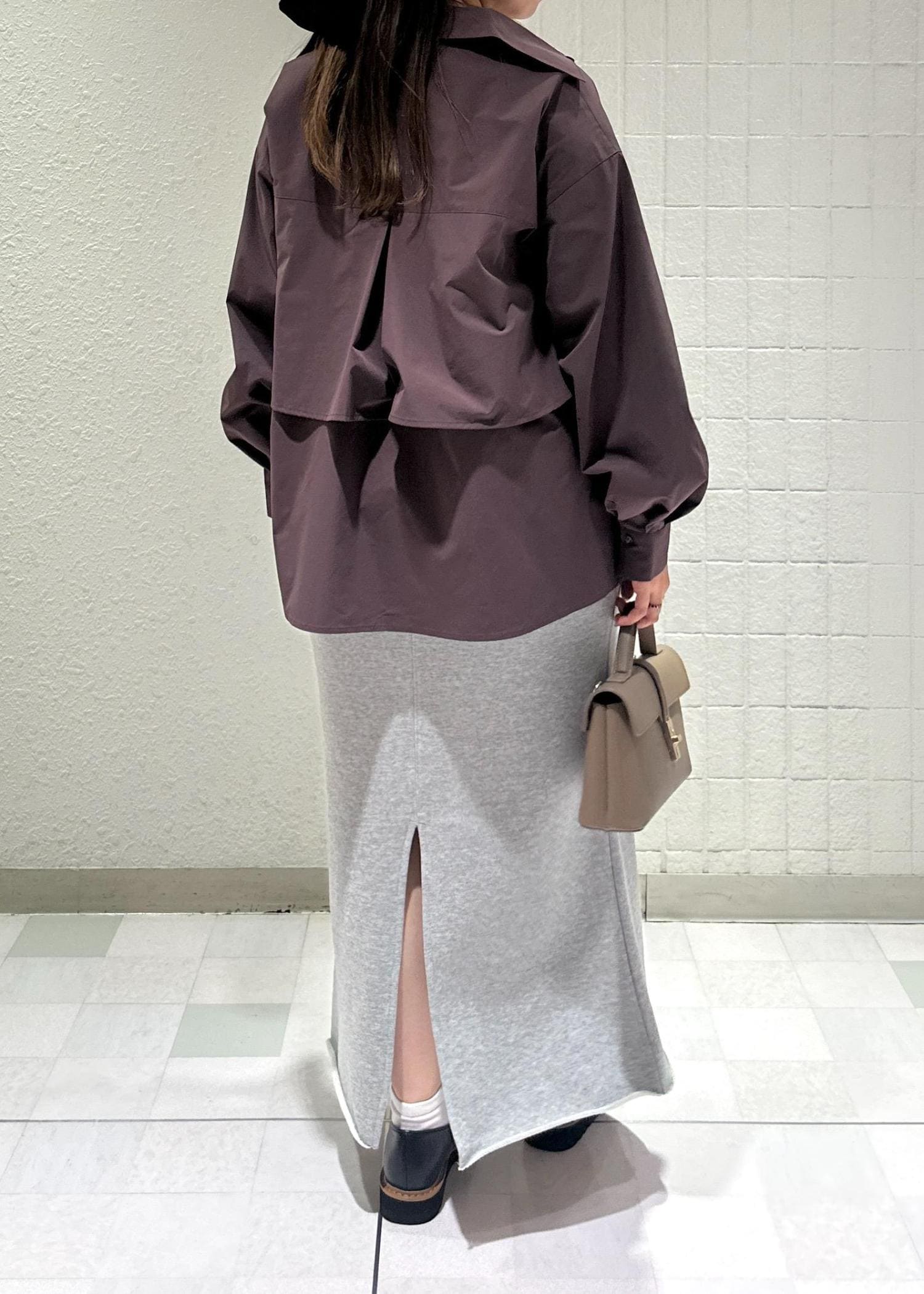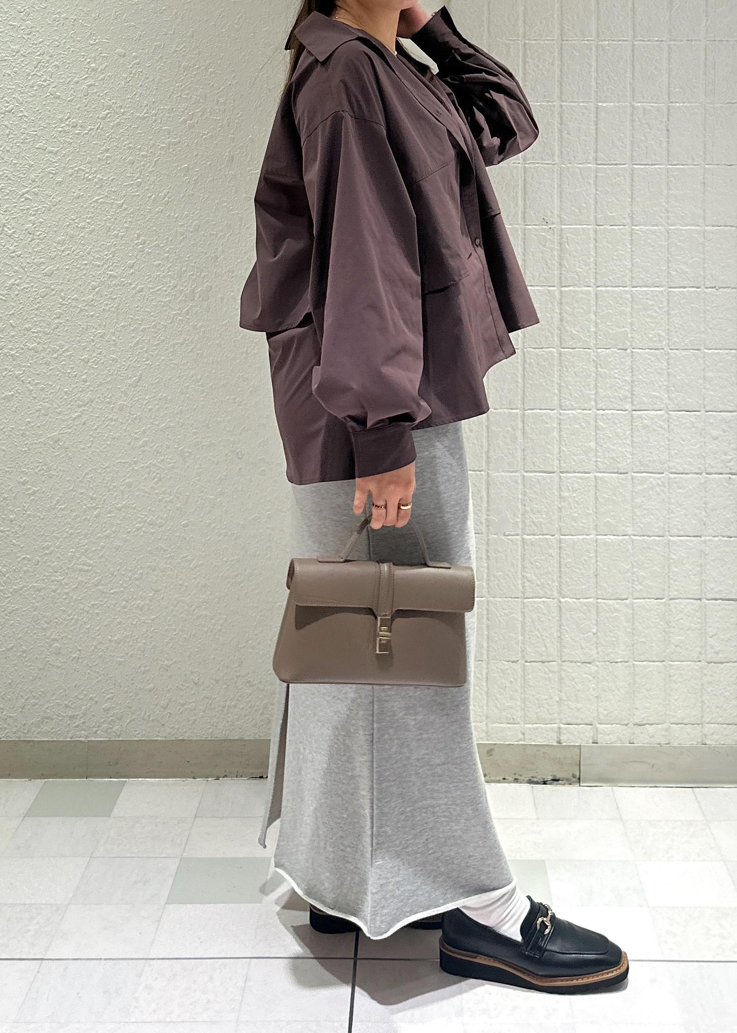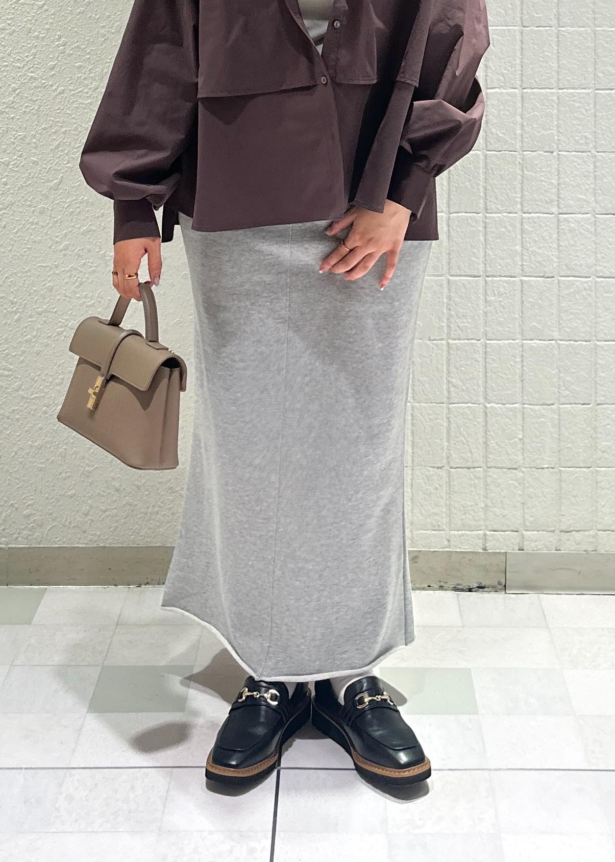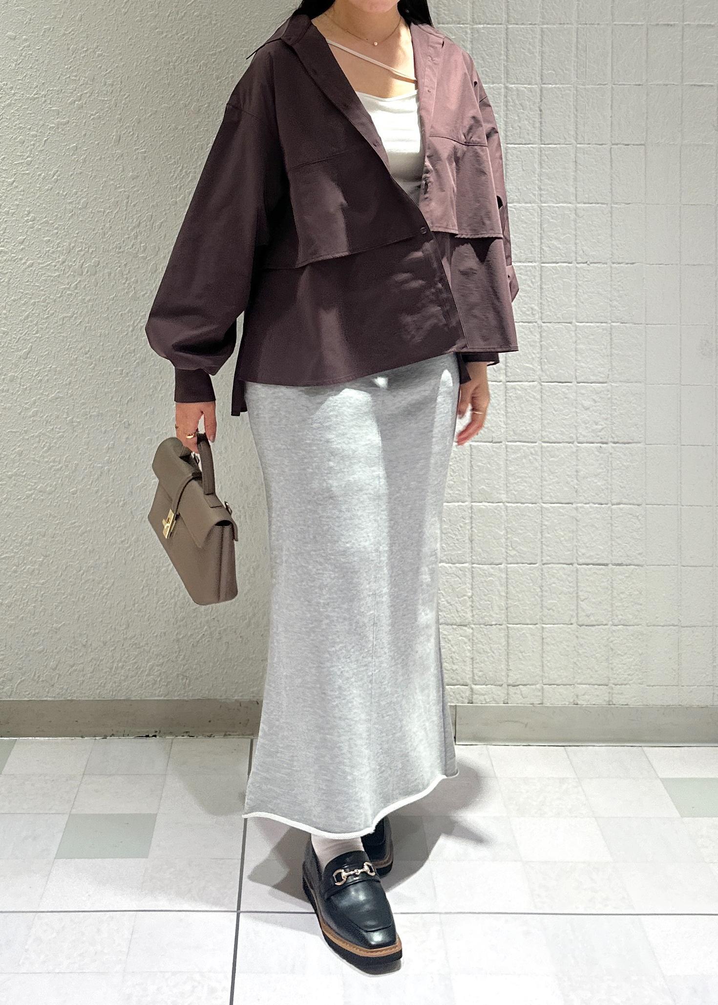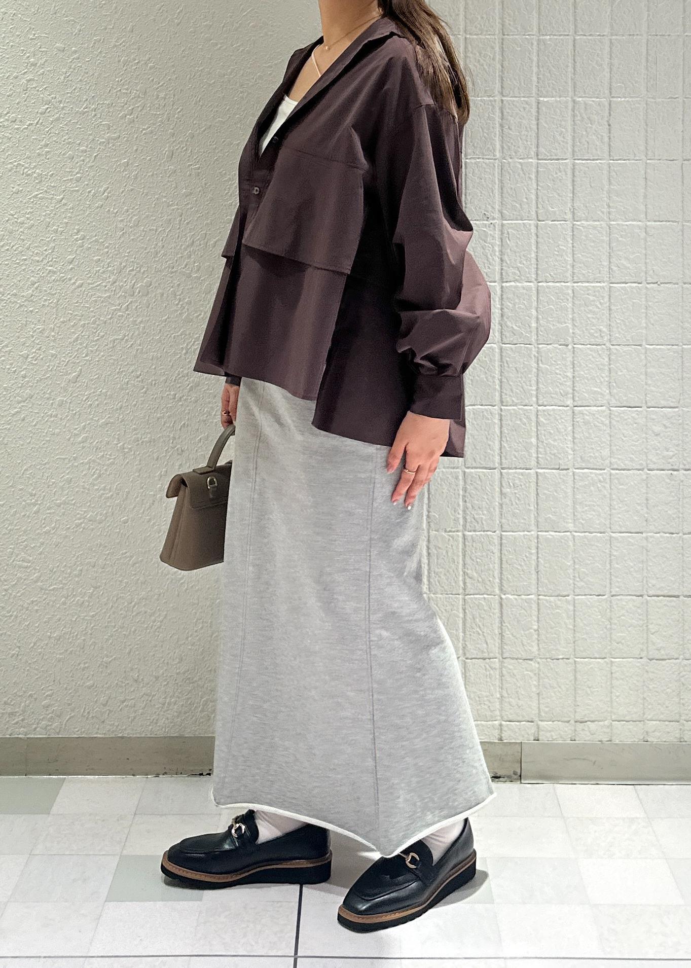 秋らしいブラウンのティアードシャツにスウェットスカートを合わせてカジュアルダウンさせたコーデにしてみました♪