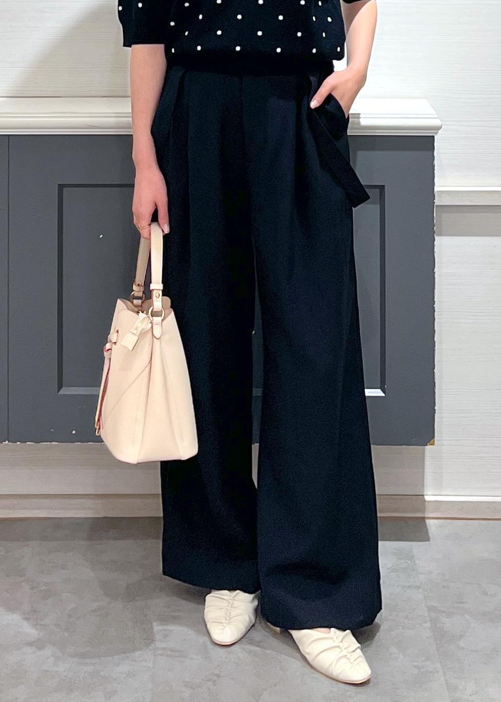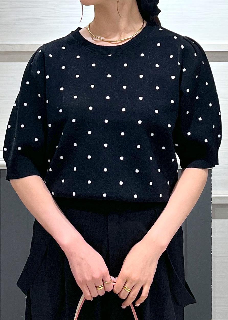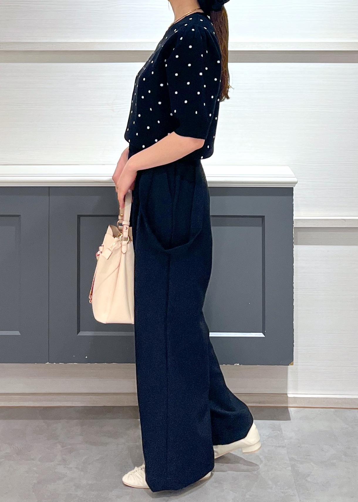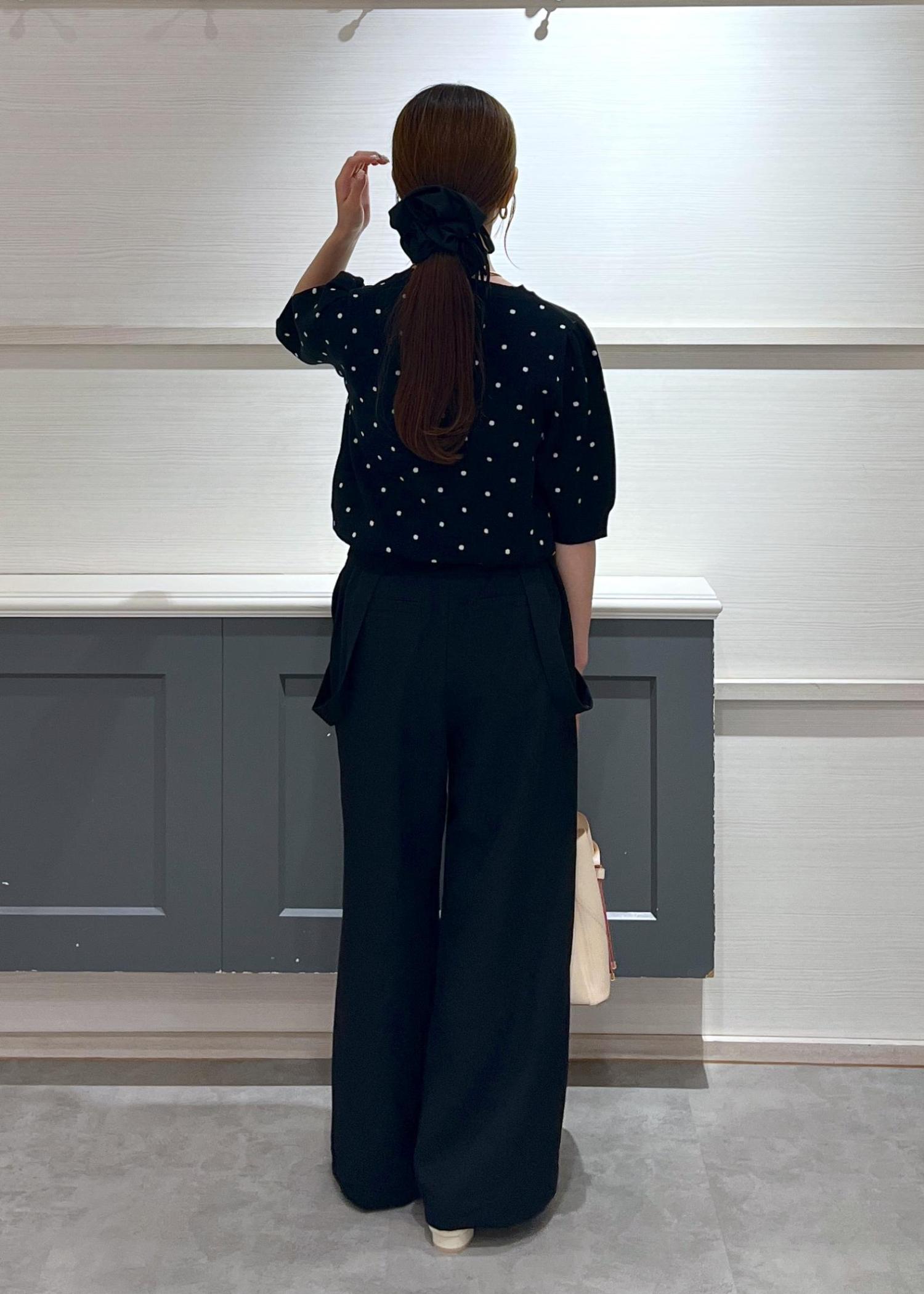 ドットのニットトップスとサスペンダー付きのパンツどちらも黒で合わせました!