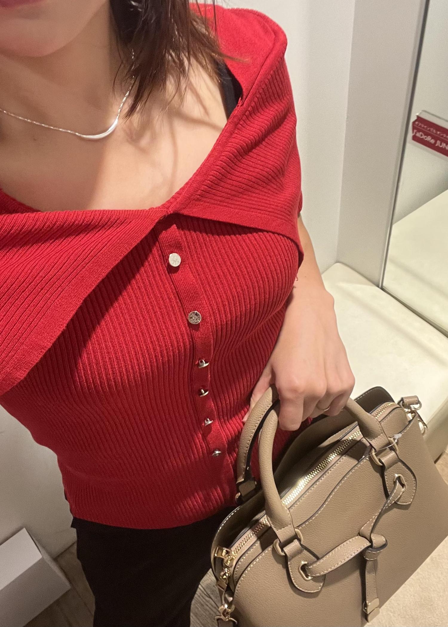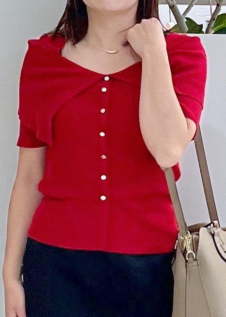VISビックカラーオフショルハーフスリーブニットレッド / F¥2,963レビュービックカラーが気になる二の腕をカバーしてくれます。鎖骨もキレイ見えする嬉しいデザインです。柔らかめの生地で着心地も良く着やすいです。カラーリングが3色で秋らしいカラーです。