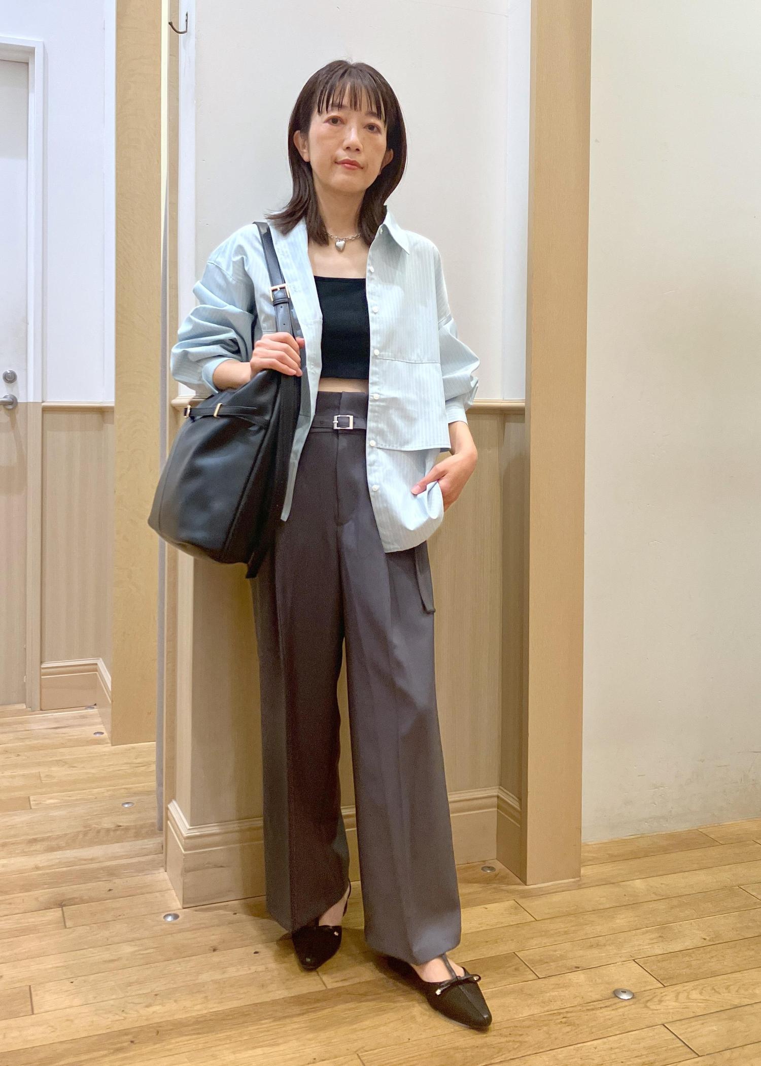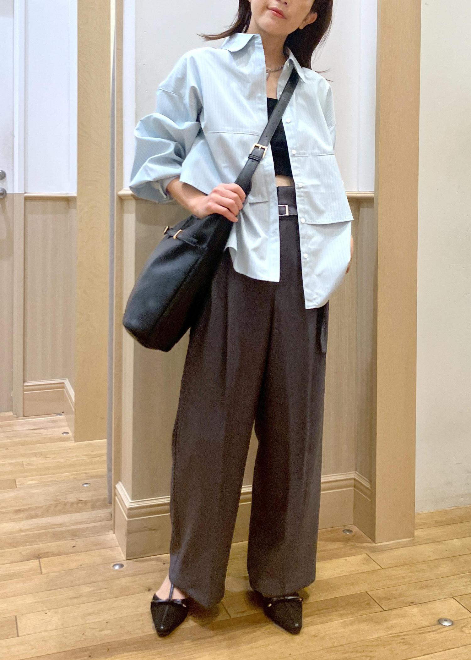 涼しく着られるようインナーをショート丈にしつつ、羽織りアイテムは長袖シャツで秋を意識しました。