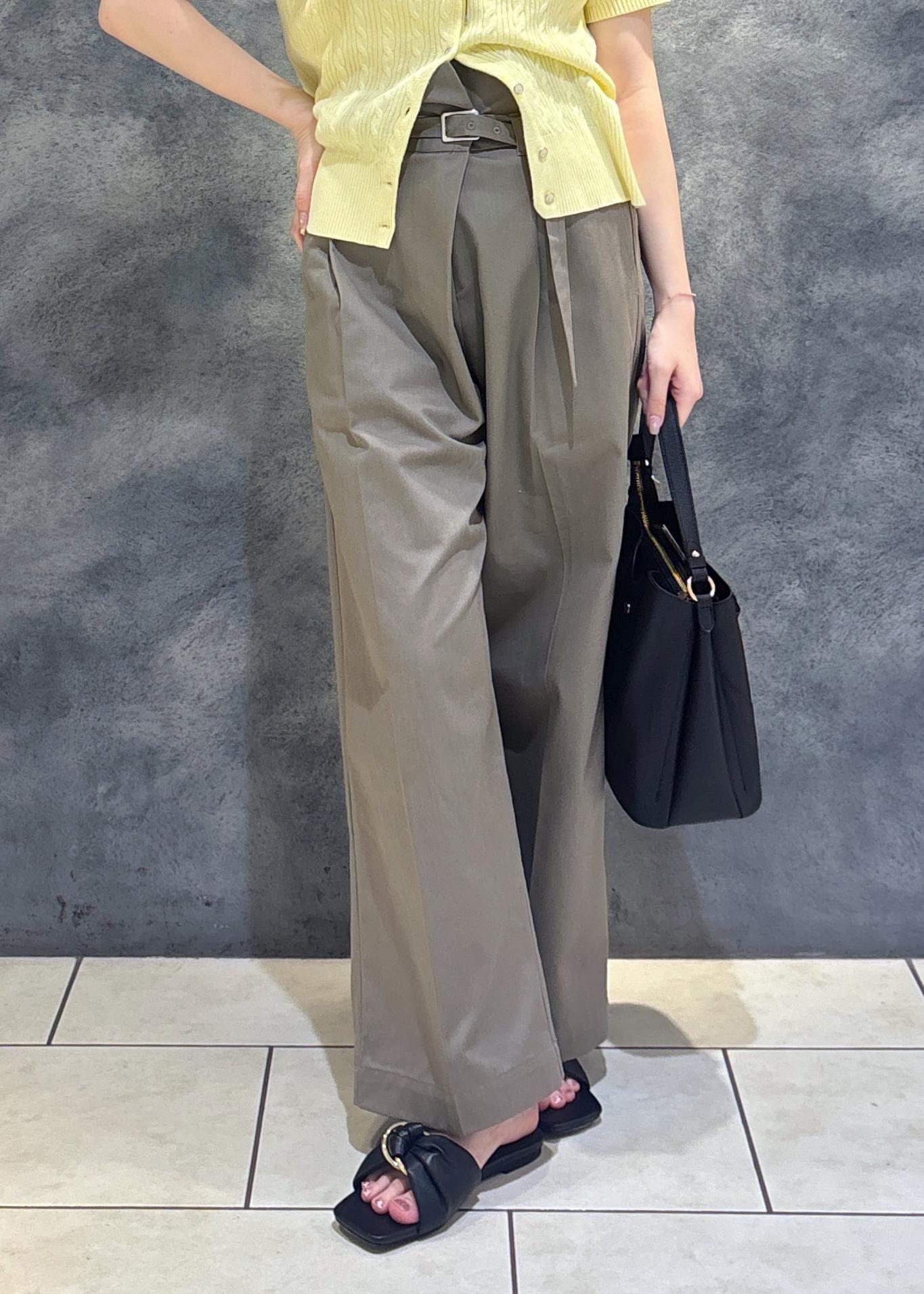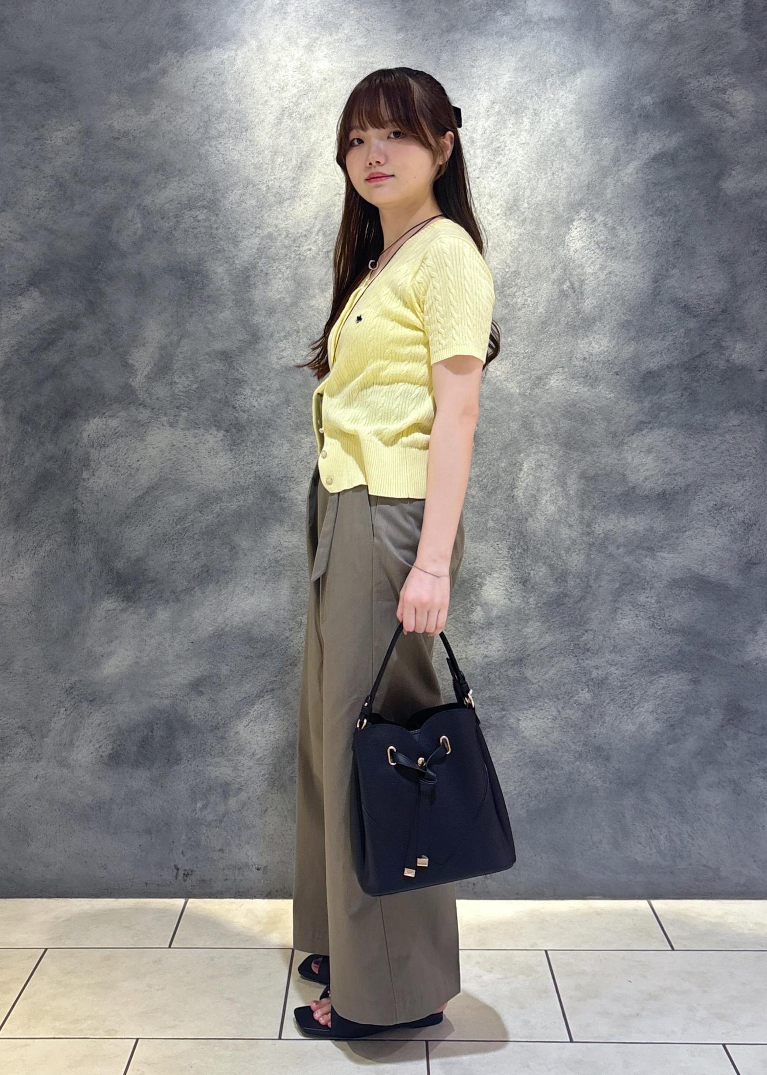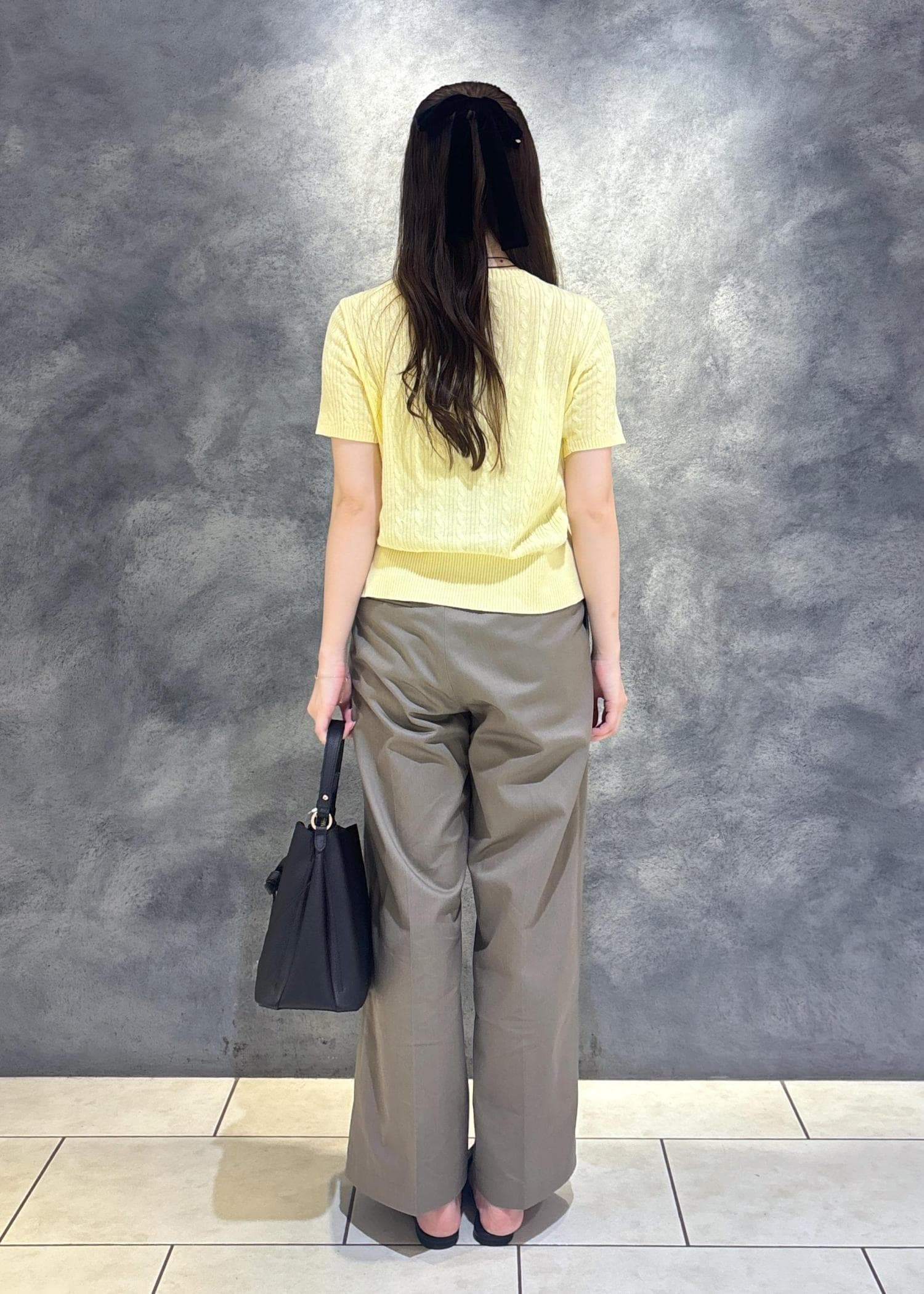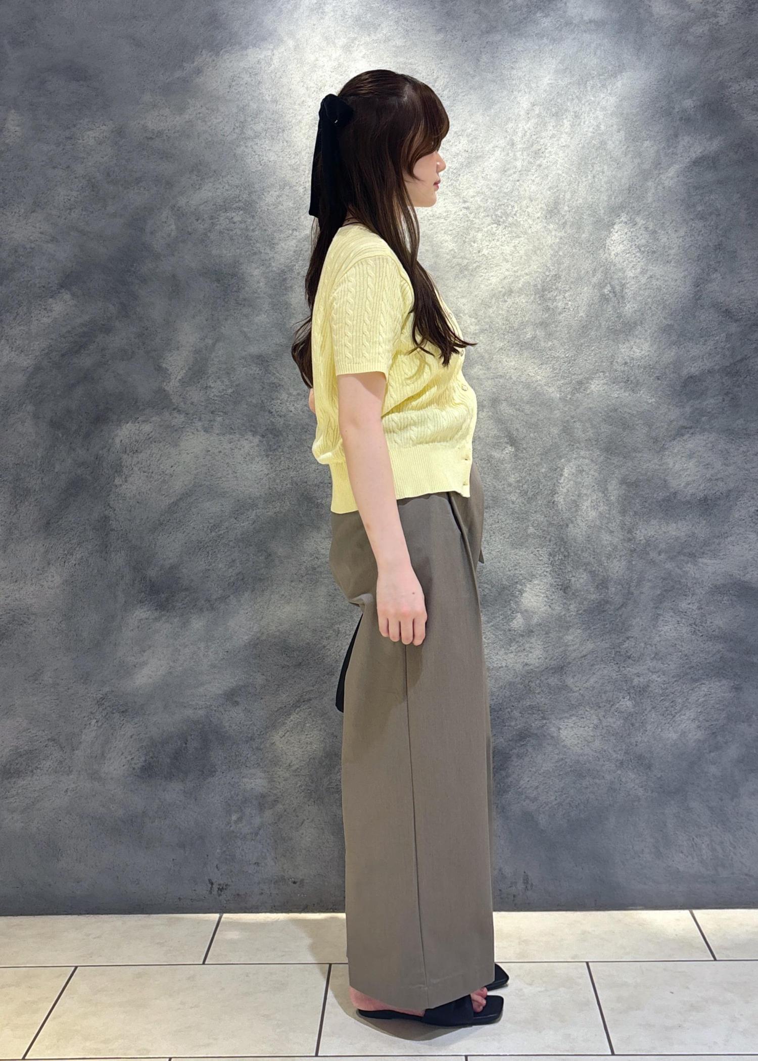 カーディガンのボタンを開けると、パンツのベルトが見えてすっきりします◎