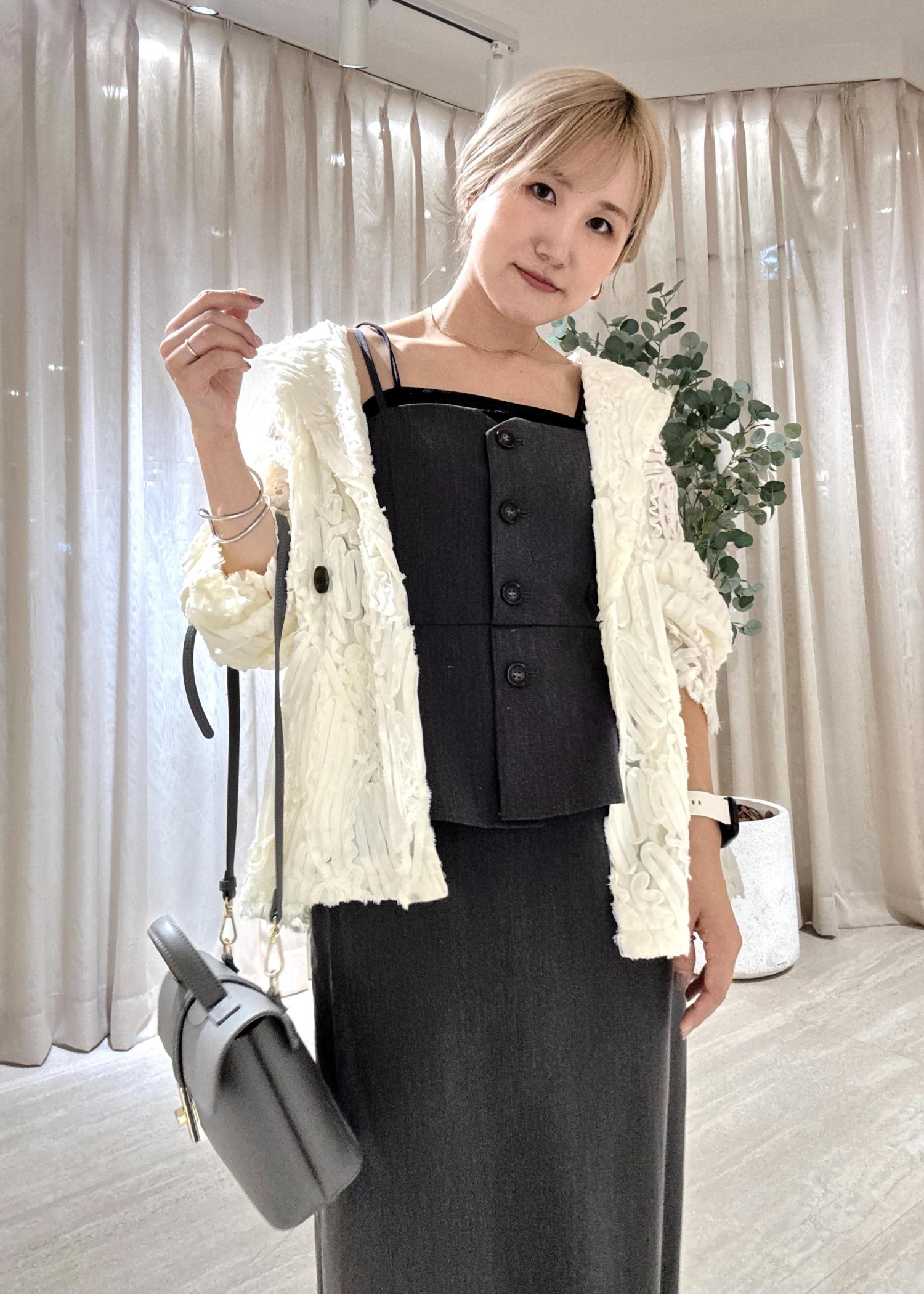 ビスチェドッキングになっているのでウエスト位置の切り替えも高めになって、腰位置が高く見えるので骨格ウェーブの方にもとてもおすすめです。 -