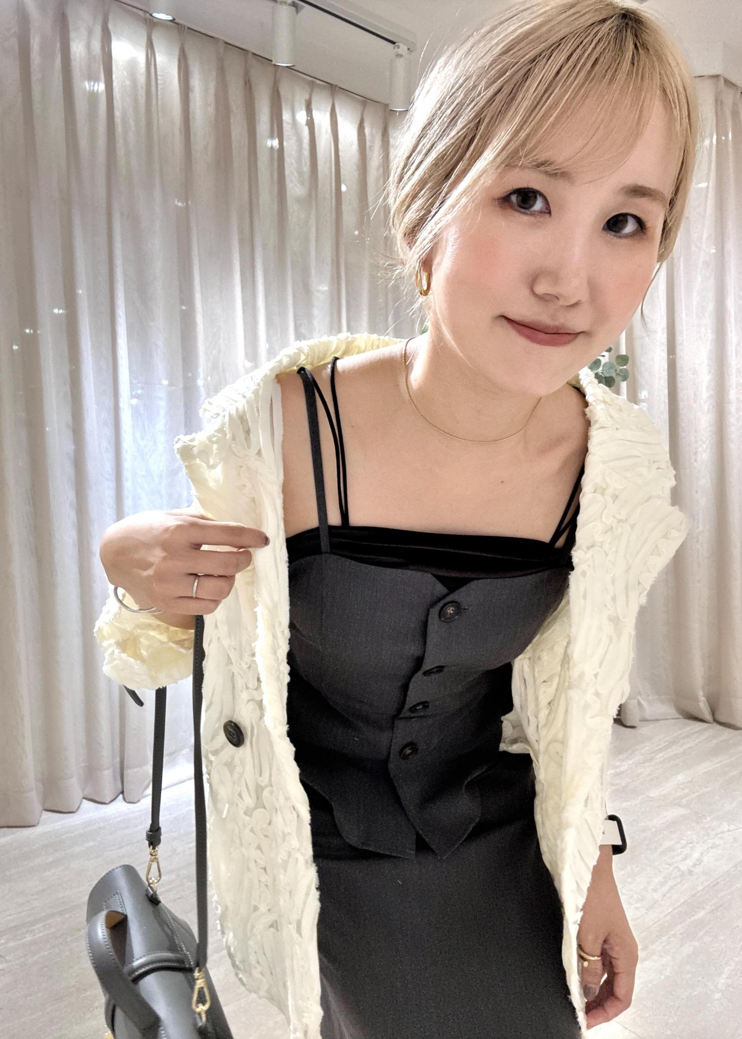 キャミワンピのインナーをキャミソールで合わせる事で抜け感を演出し、シアーのジャケットで抜け感を残しつつも露出感をカバー。
