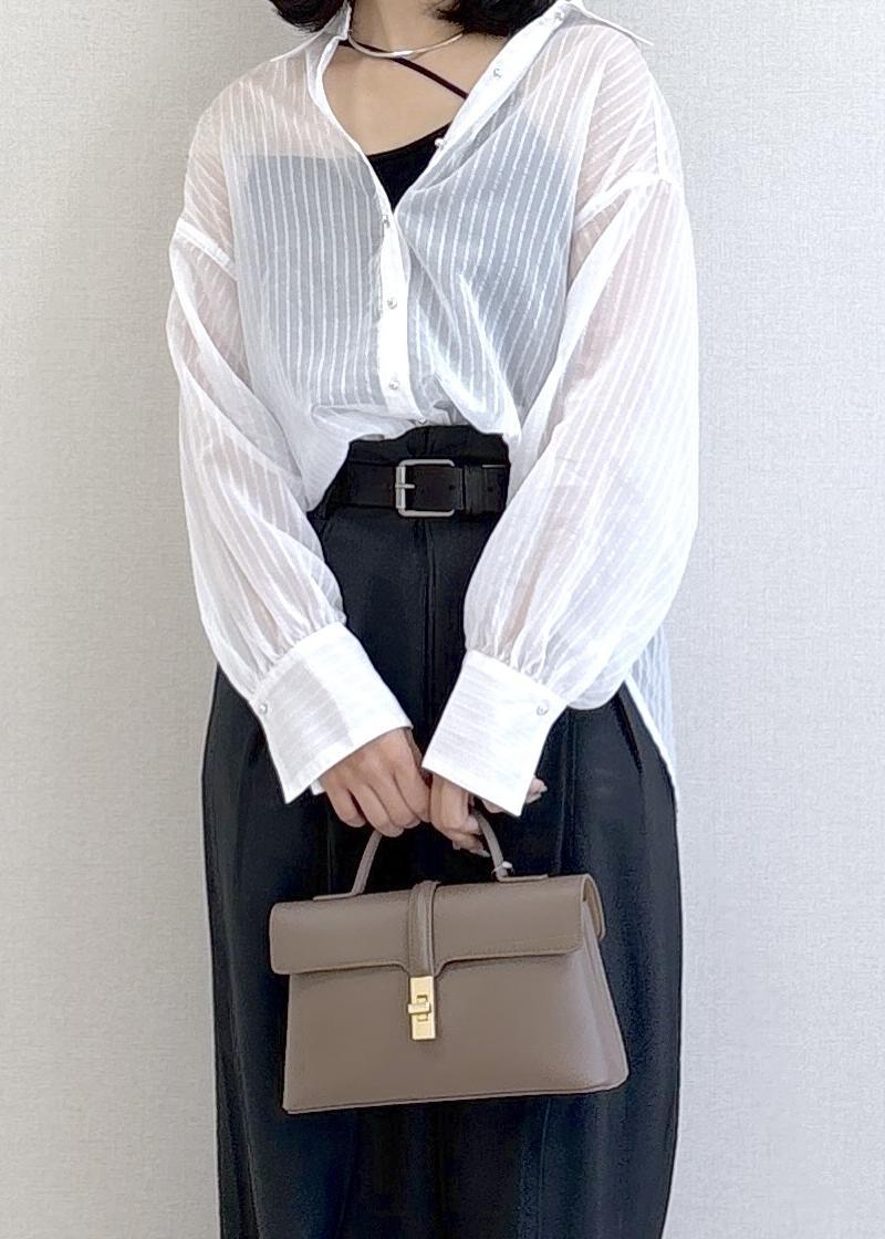 シャツはキャミソールの上にさっと羽織るだけでも可愛いですが、フロント部分だけタックインしてベルトでウエストマークすることでメリハリのあるシルエットに!