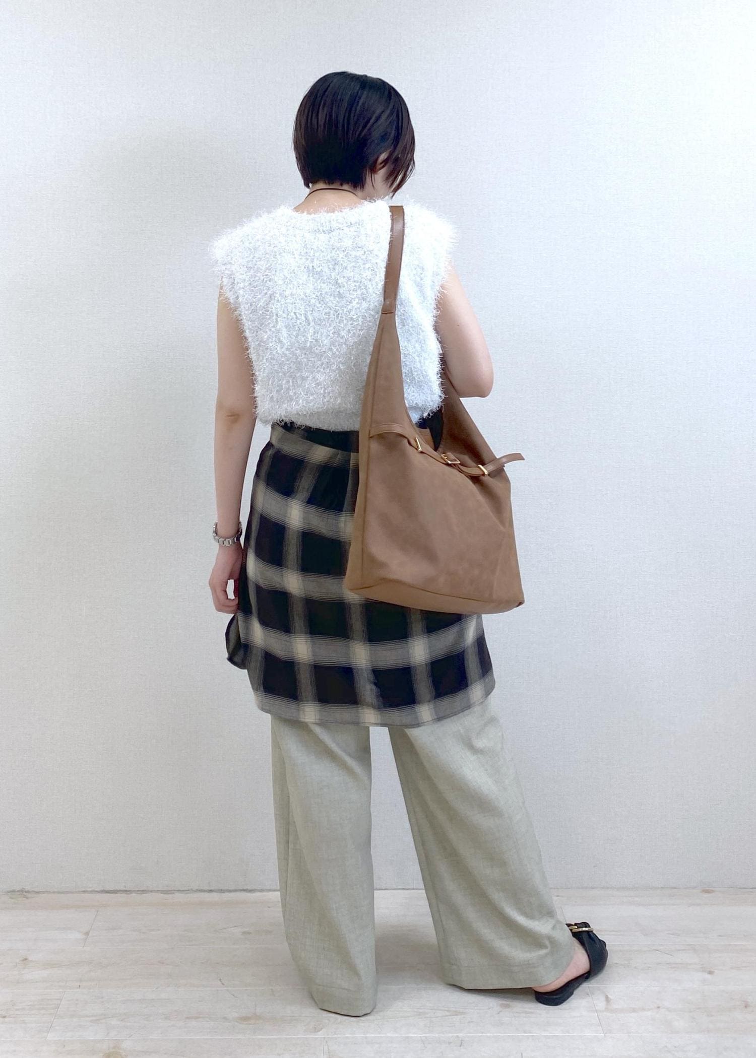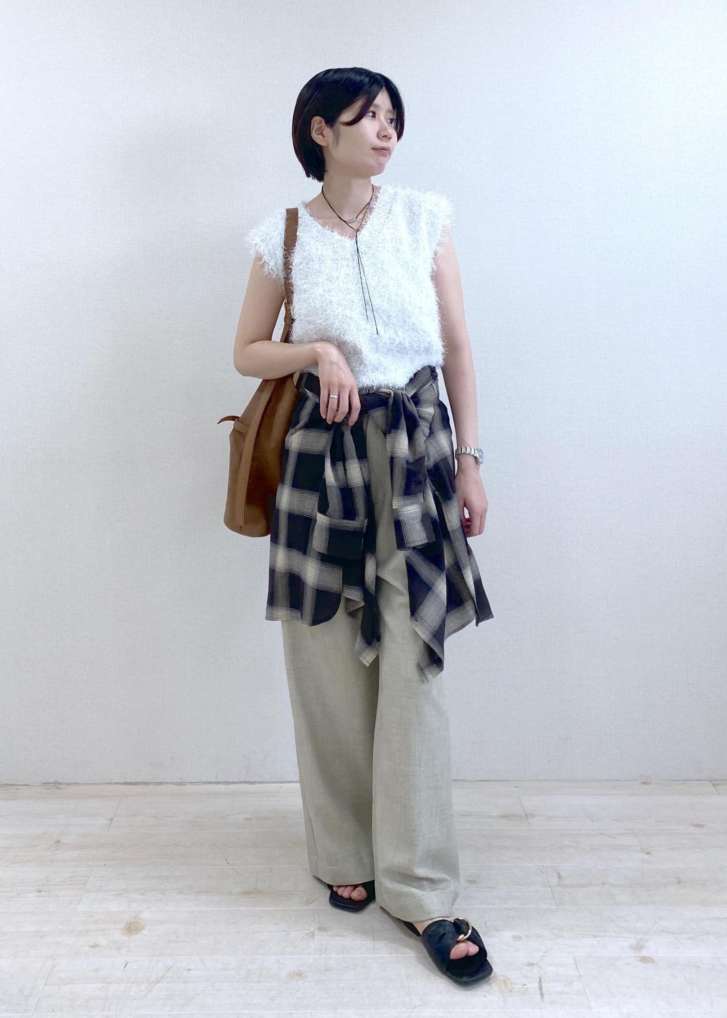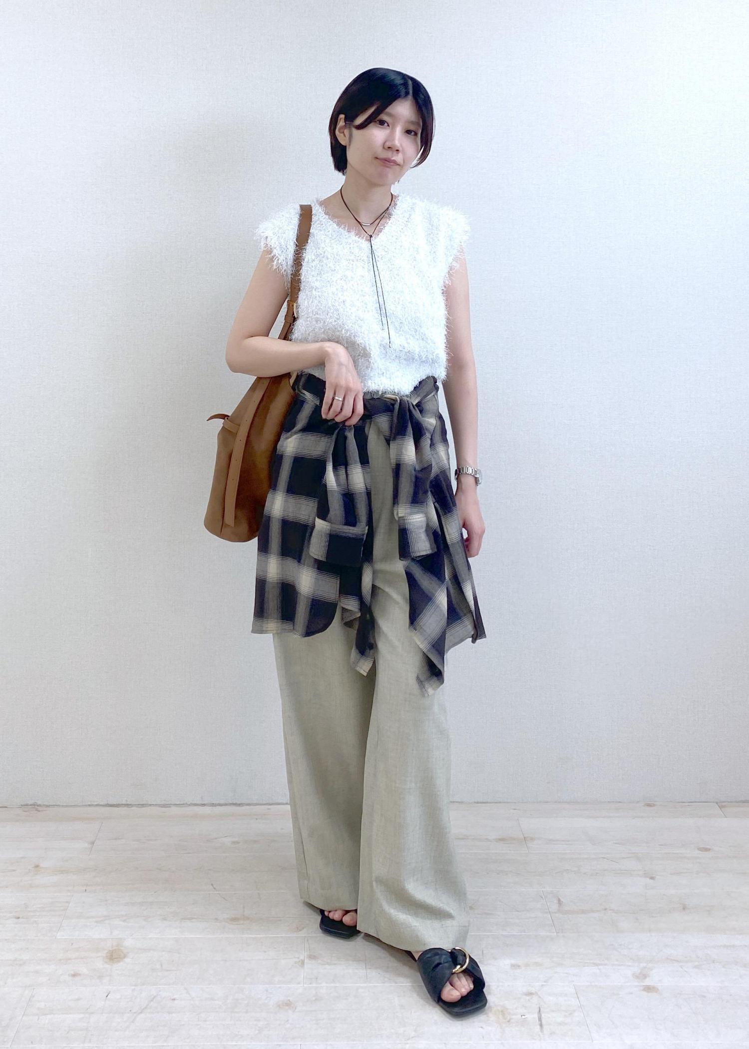フェザーヤーンベストとワイドパンツにオンブレチェックのシャツを腰巻きしました。